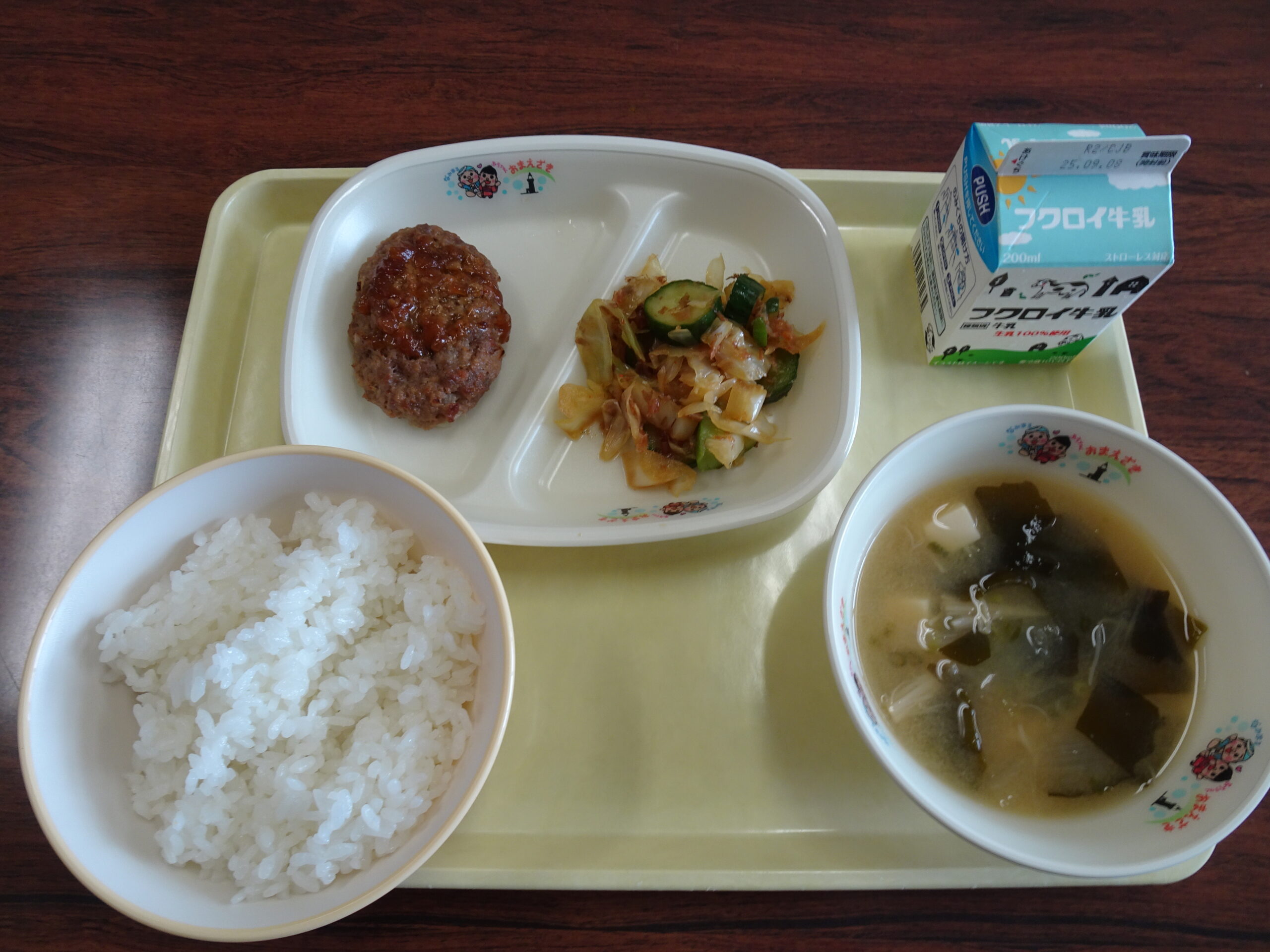 メニューは、ご飯、牛乳、ハンバーグのオニオンソースがけ、わかめのみそ汁、きゅうりとキャベツのひたひたでした。