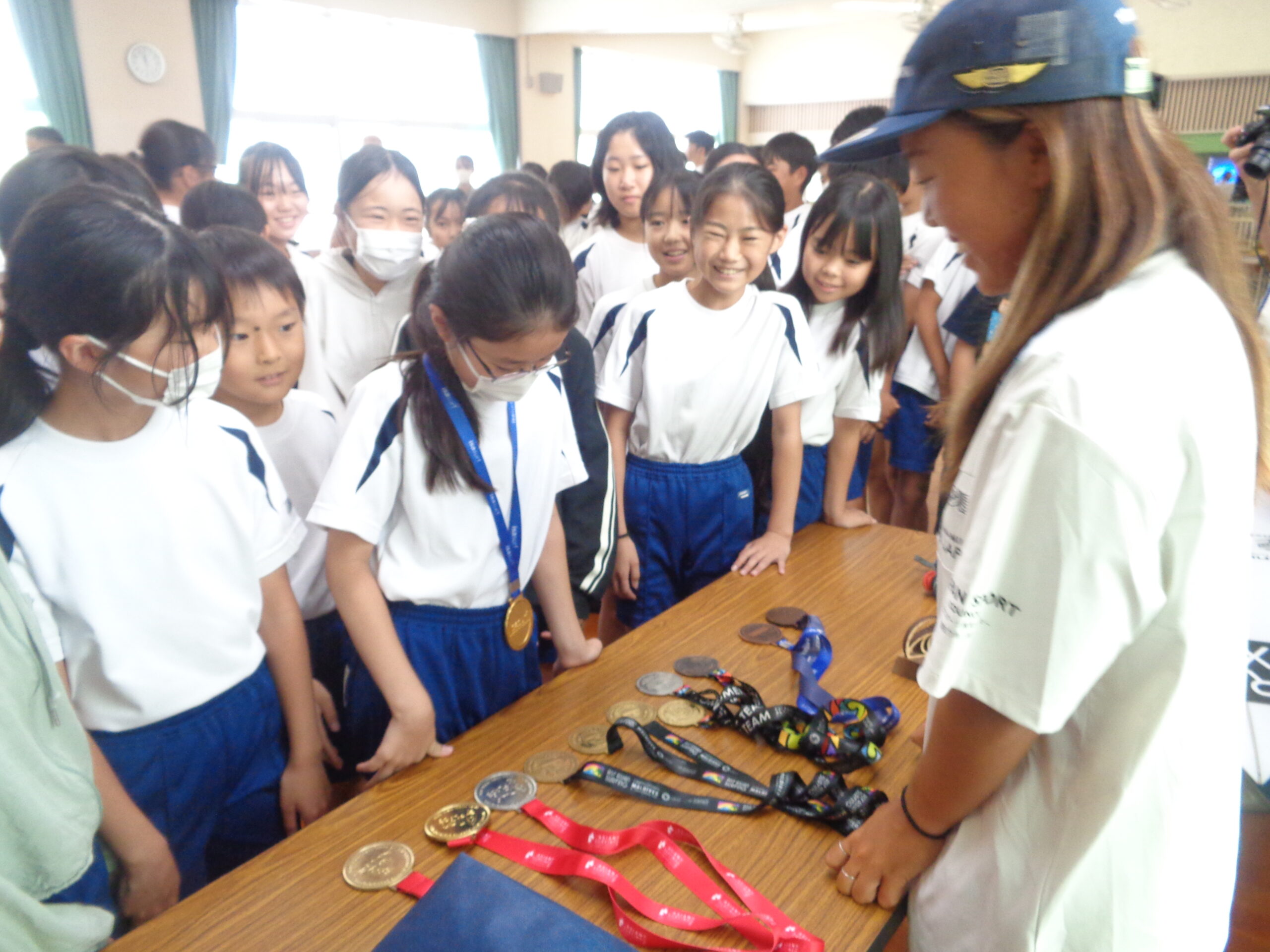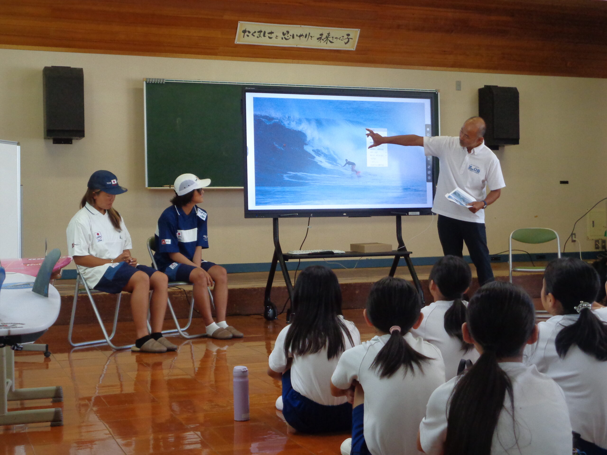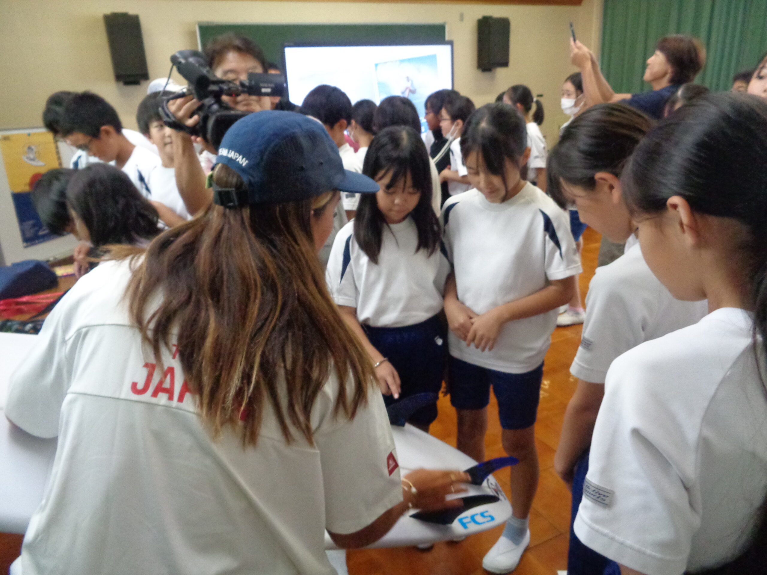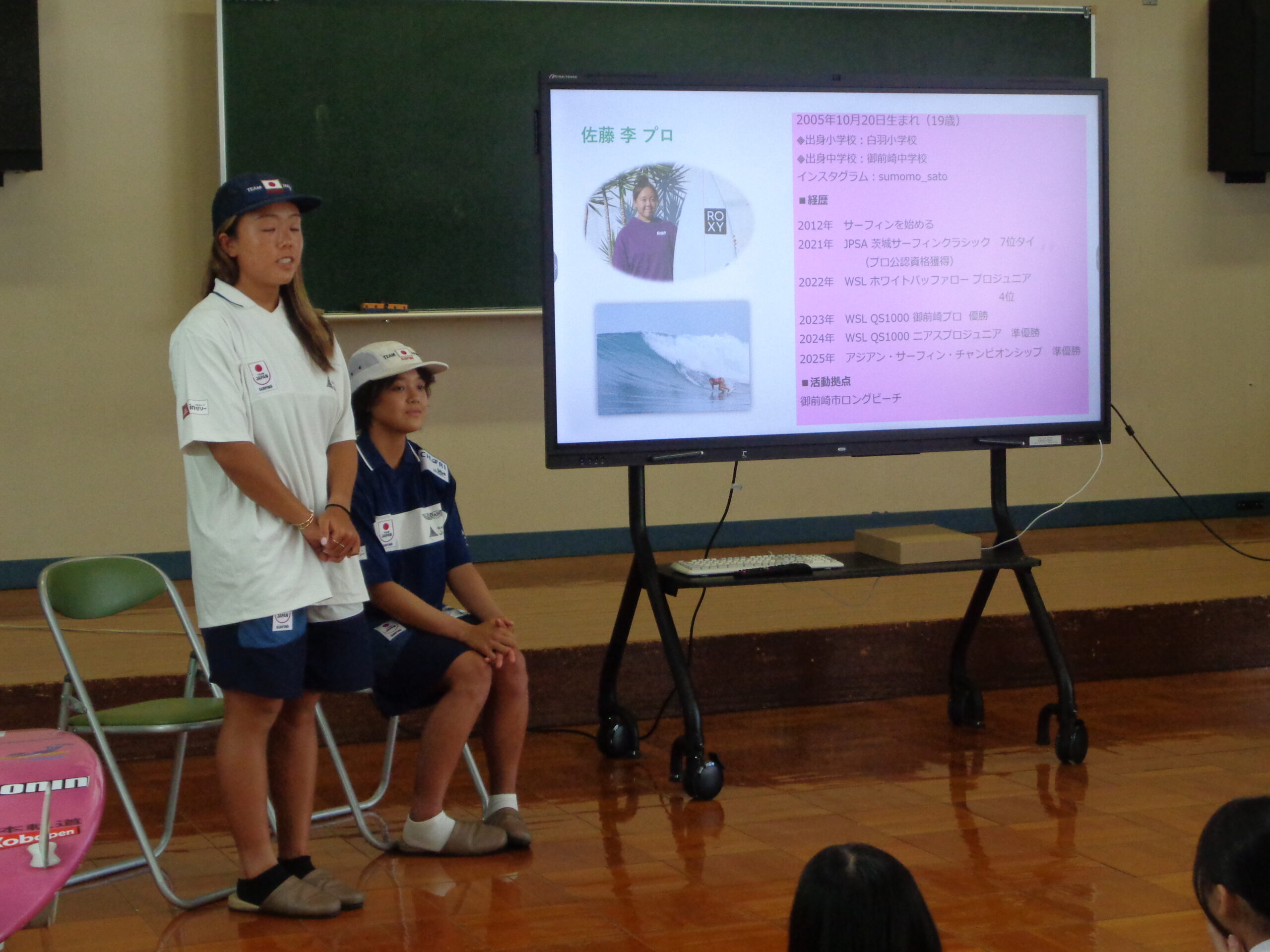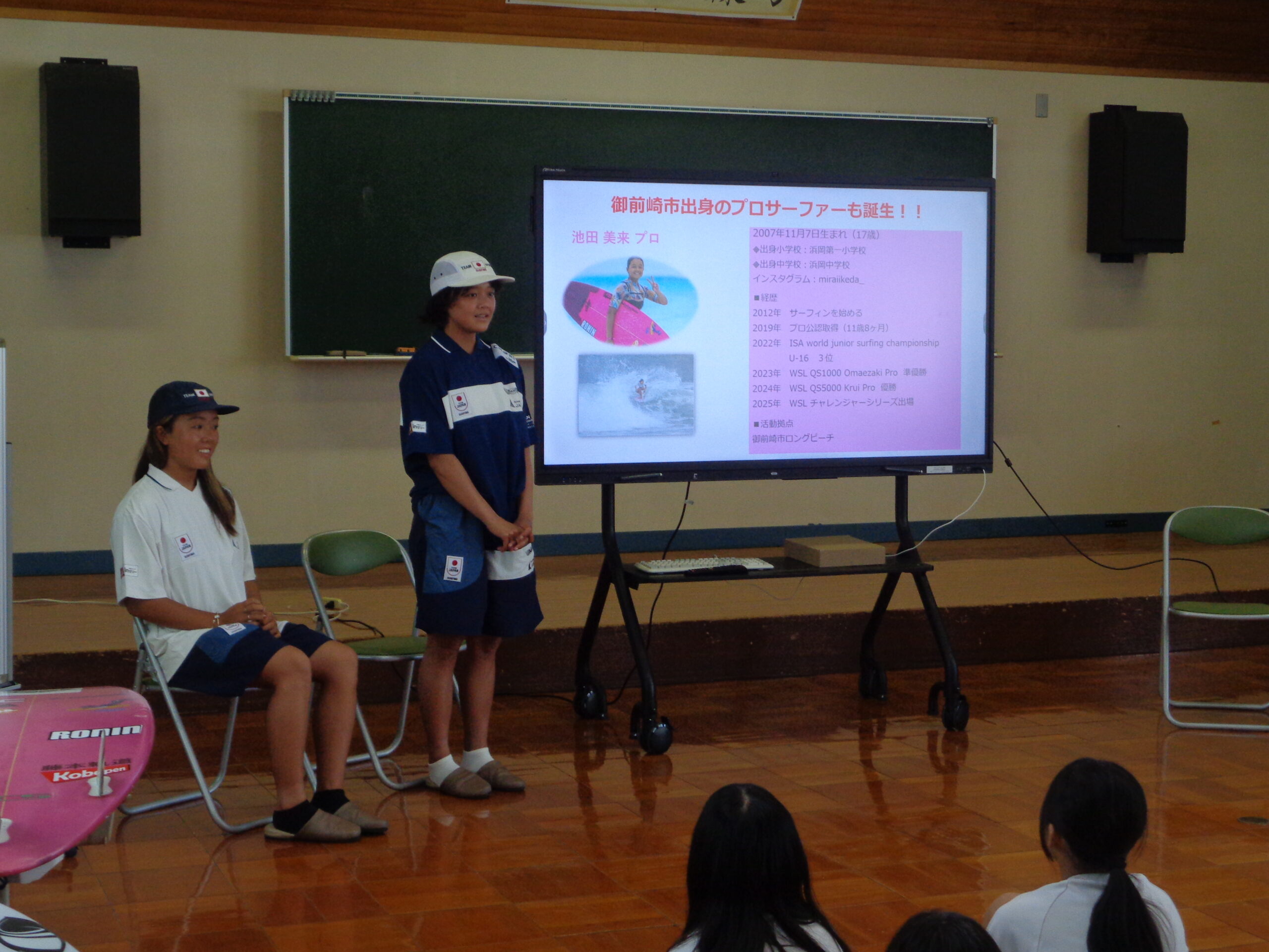 プロサーファーと会えたよ 2025/09/02 今日は、御前崎市出身のプロサーファーの池田美来さんと佐藤李さんが来てくれました。 プロサーファーになるまでのお話やプロ選手としてどのような思いをもって取り組んでいるかをお話してくれました。 たくさんの人たちが取材に来てくれました。 北小学校の子たちは海に遊びに行く経験は少ないので、とてもいい刺激となったと思います。 今度、御前崎で開催される大会でも頑張ってほしいですね。みんなで応援しましょう!!