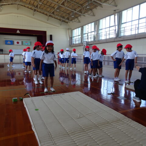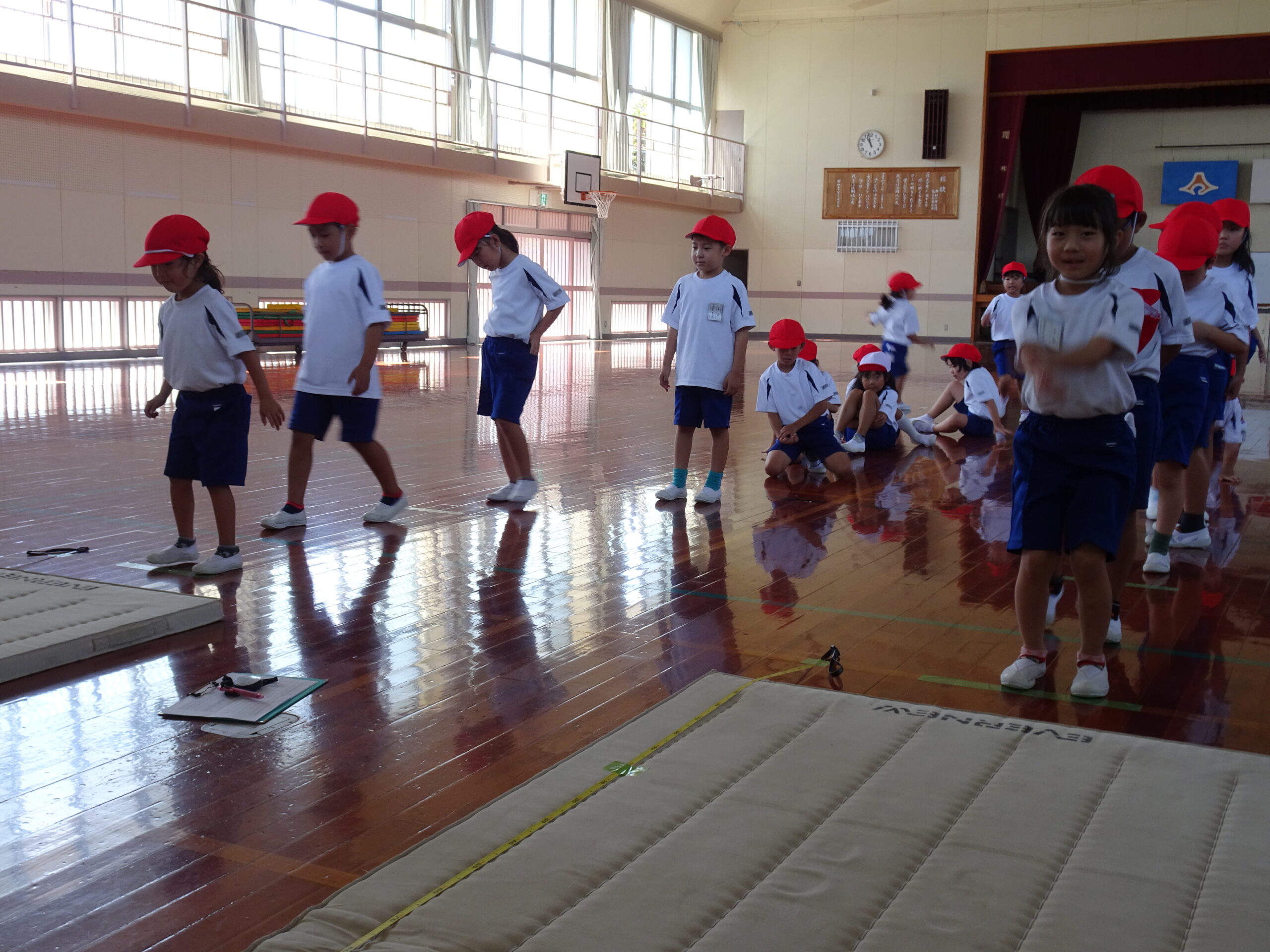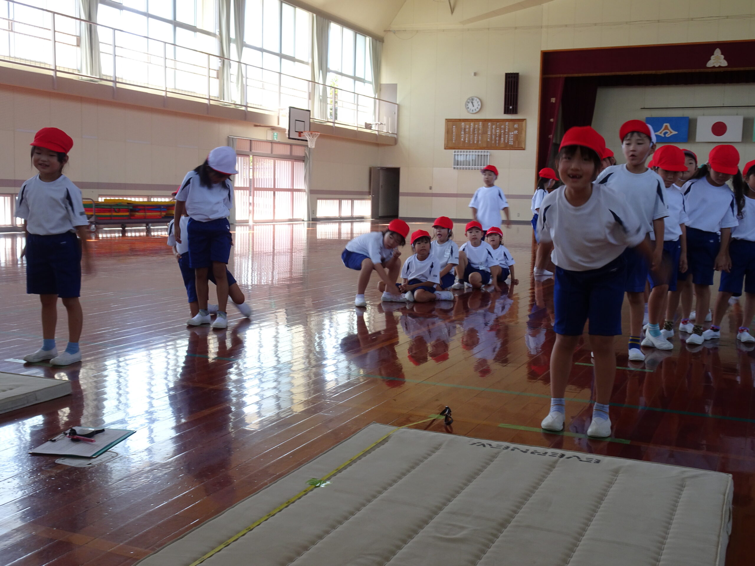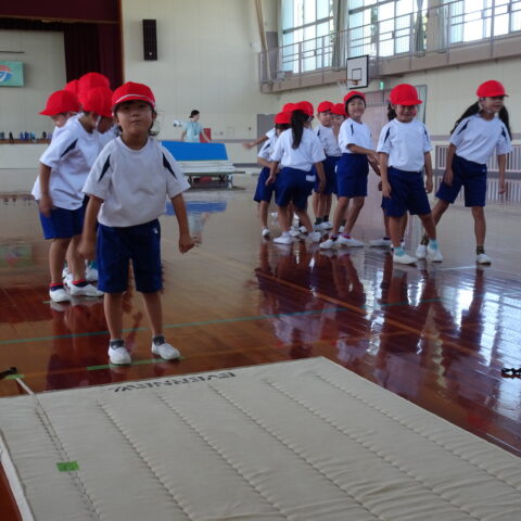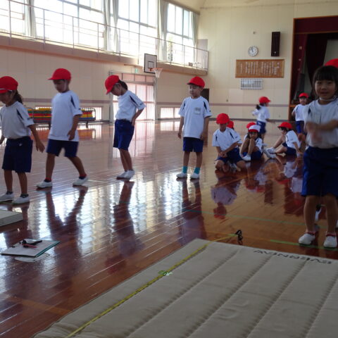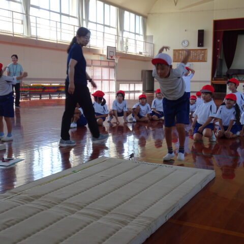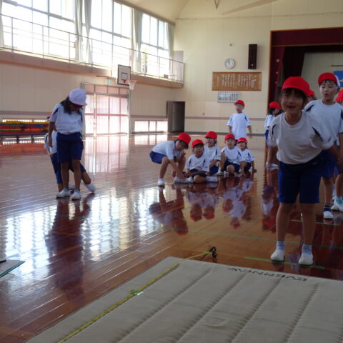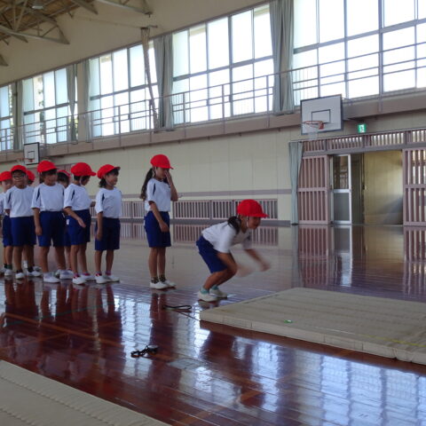 【1年生】立ちはばとびに挑戦したよ 2025/09/26 1年生が、立ちはばとびに取り組んでいました。 「1・2の3」と声を出しながらタイミングを合わせていました。数を数えている間に、思わず前に出てしまう子がいたり、タイミングが合わなくて苦戦する子がいたりしましたが、「もう1回練習していい?」「もうちょっとでうまくいきそうだから、もう1回練習!」などと、やる気いっぱいでした。