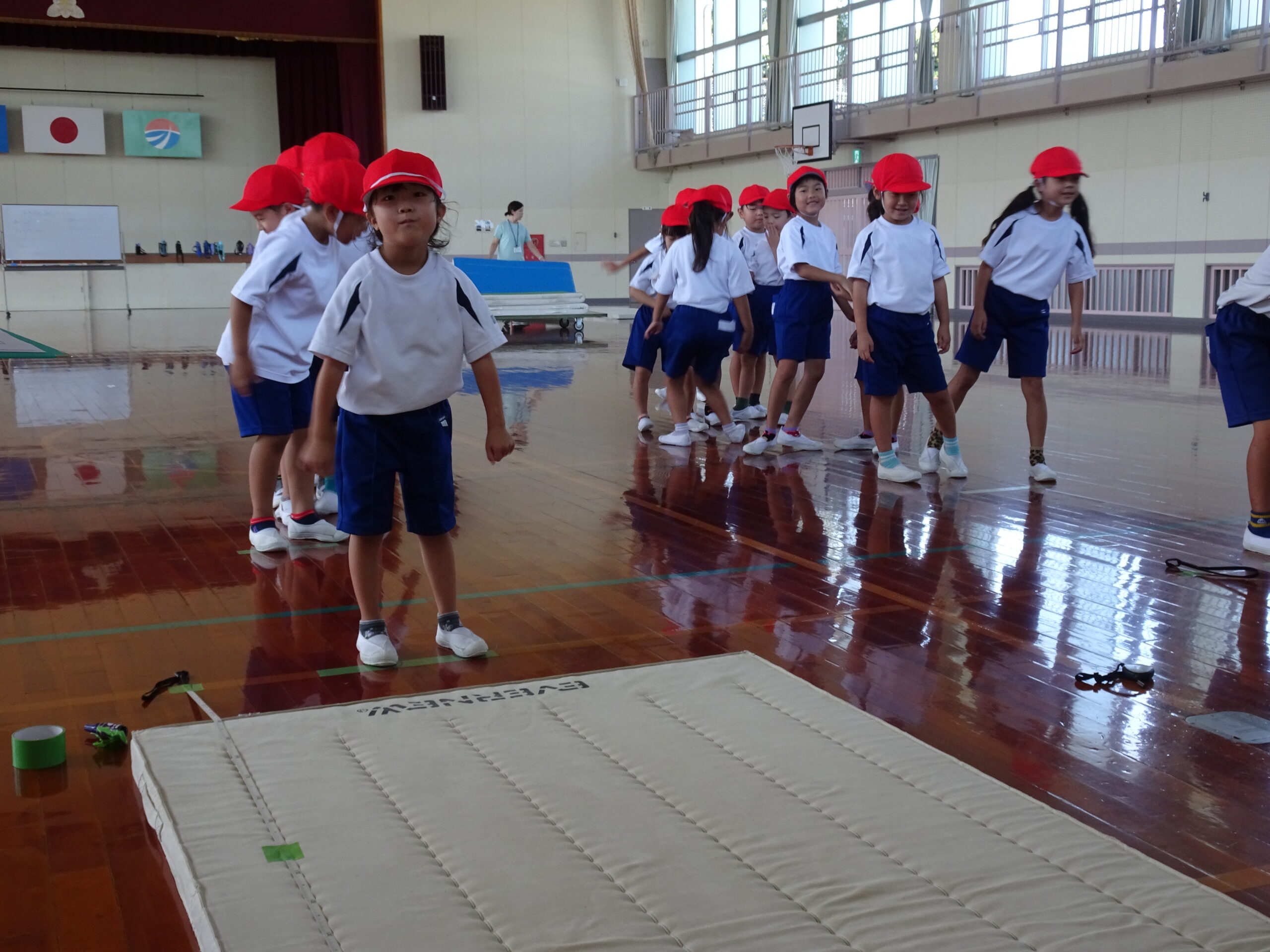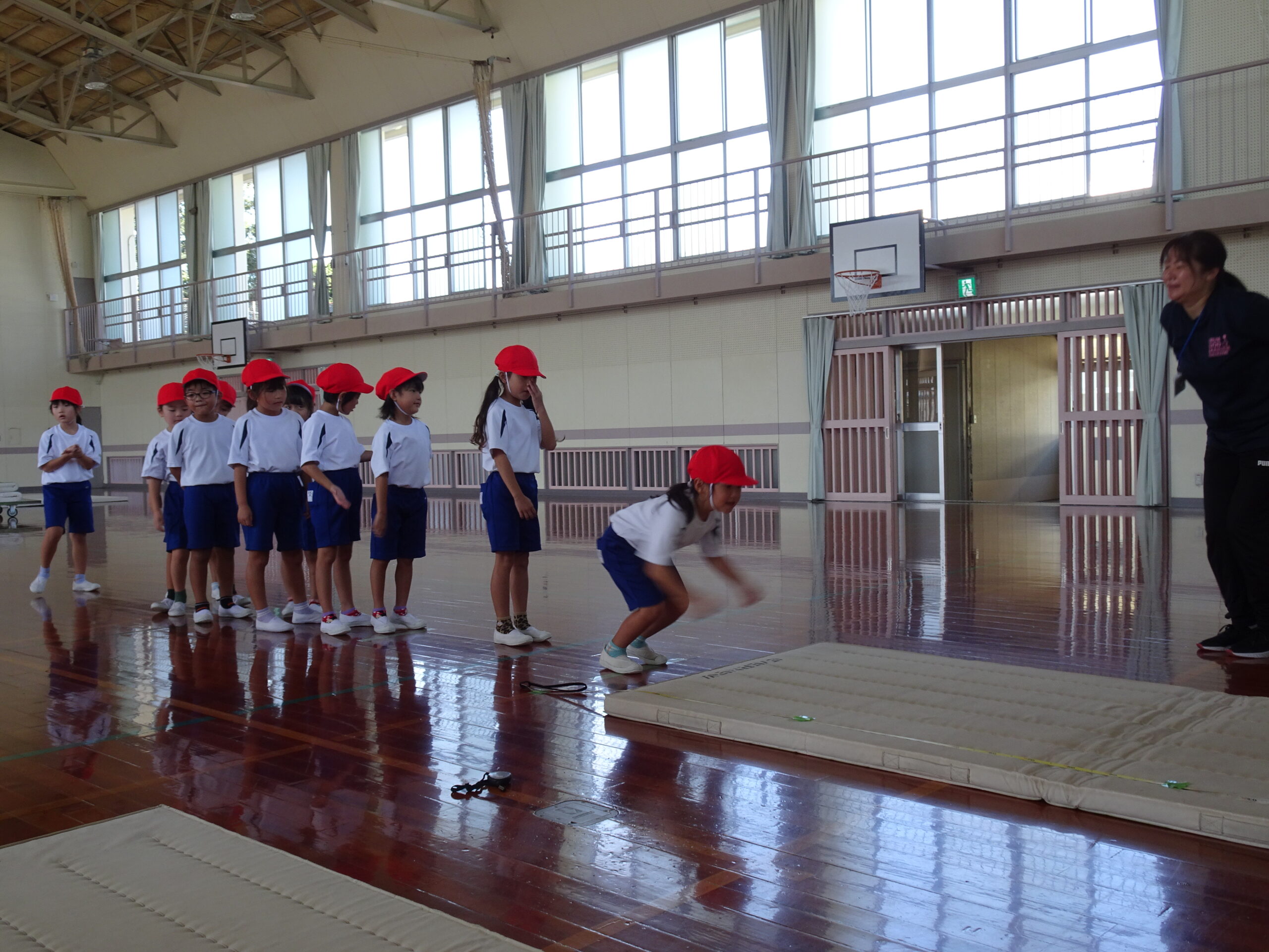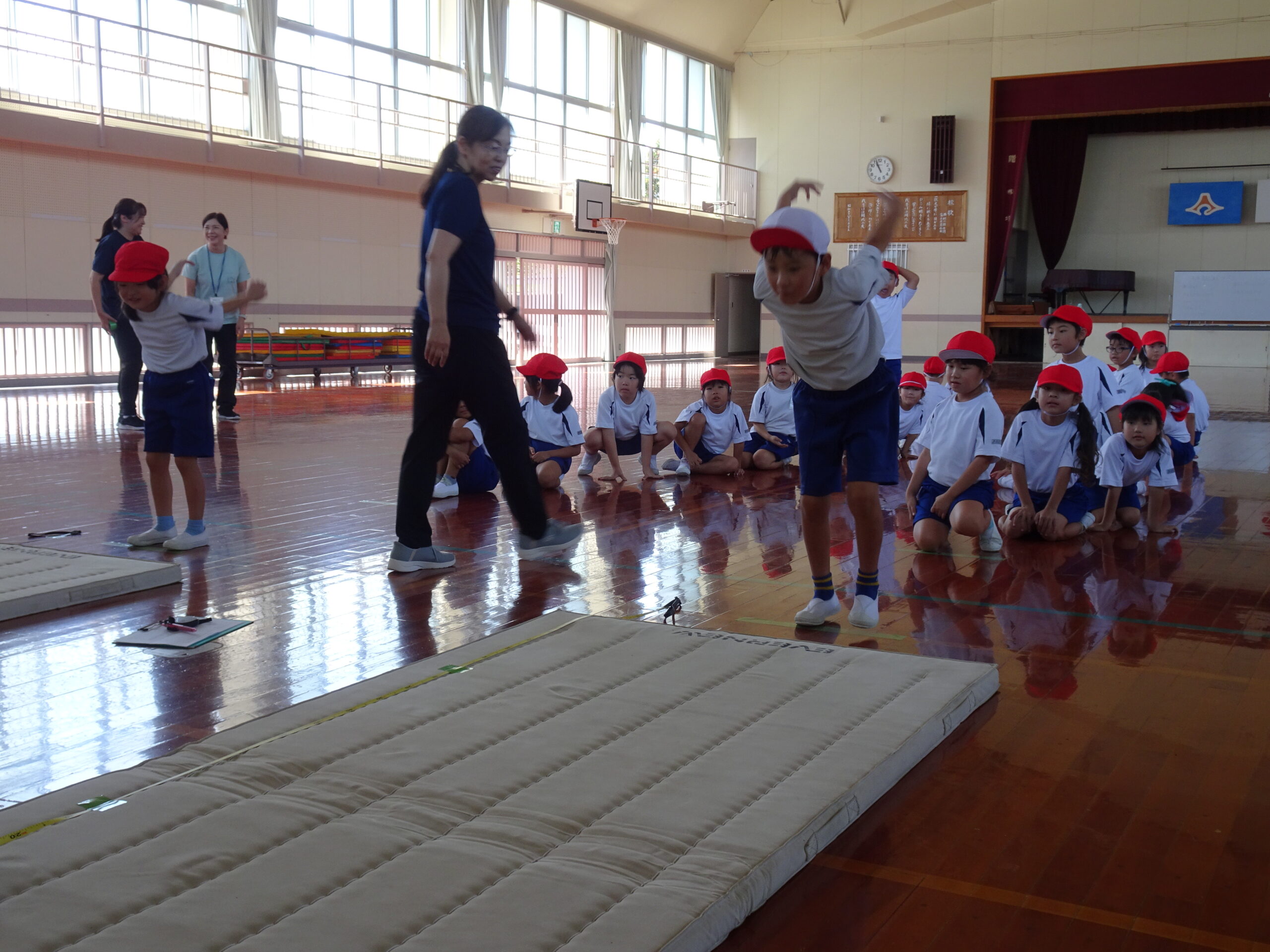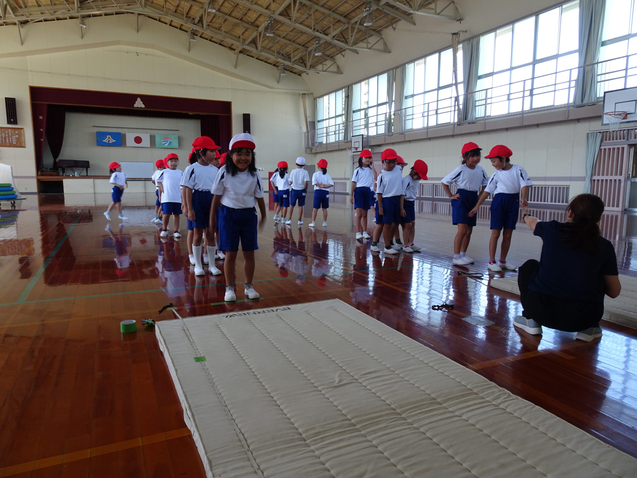 【1年生】立ちはばとびに挑戦したよ 2025/09/26 1年生が、立ちはばとびに取り組んでいました。 「1・2の3」と声を出しながらタイミングを合わせていました。数を数えている間に、思わず前に出てしまう子がいたり、タイミングが合わなくて苦戦する子がいたりしましたが、「もう1回練習していい?」「もうちょっとでうまくいきそうだから、もう1回練習!」などと、やる気いっぱいでした。