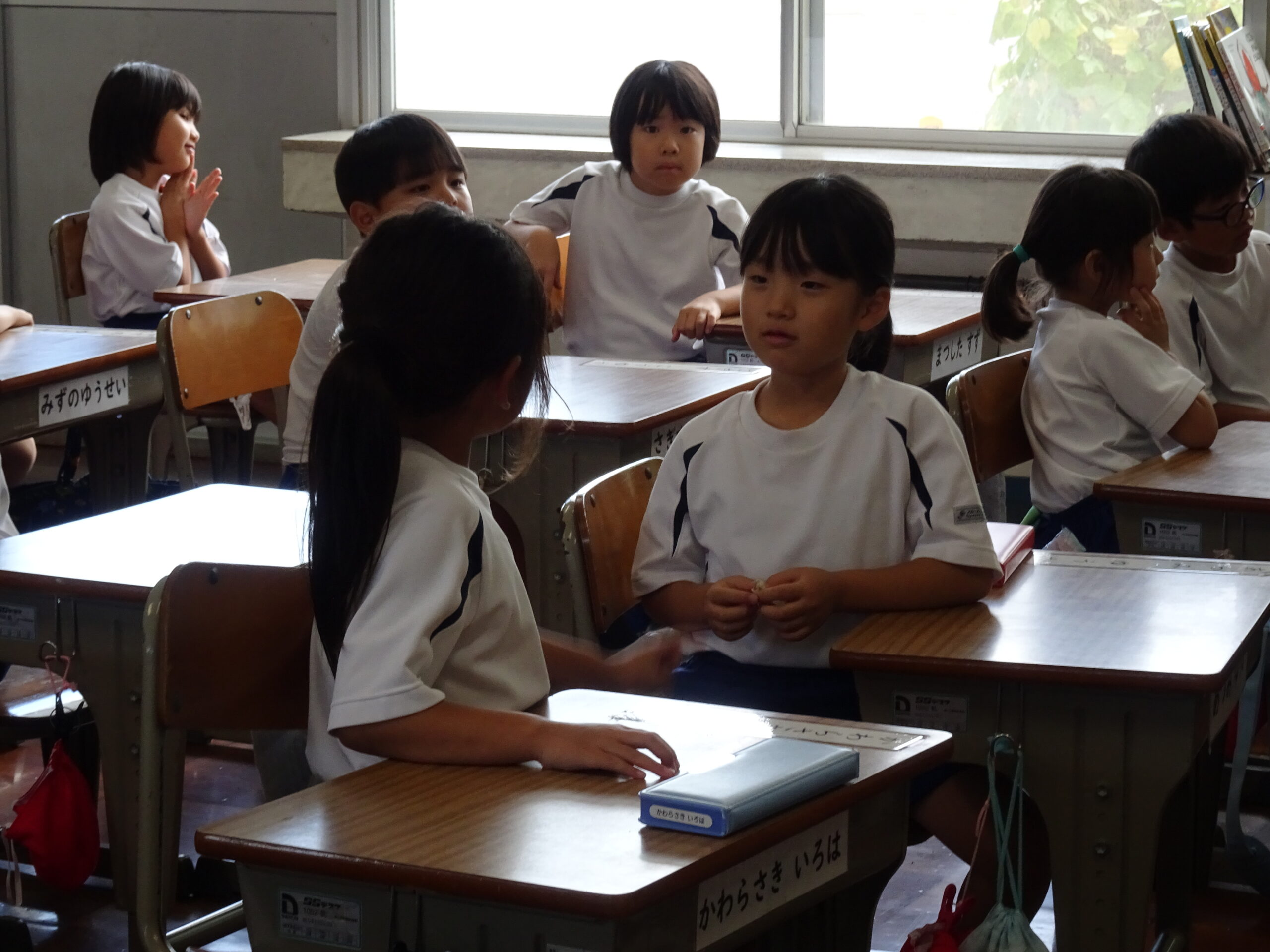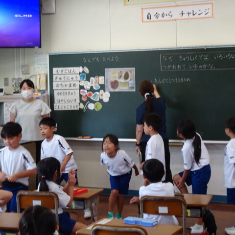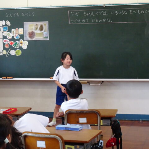 【1年生】たべものについて、べんきょうしたよ 2025/09/29 1年生がみんなで、「なぜ給食では、いろいろな食べ物がつかわれているのかな」という話し合いをしていました。 そのあと、自分たちの意見を発表したり、栄養教諭さんのお話を聞いたりして学習しました。 みんなの前で自分の考えを発表できていましたね。
