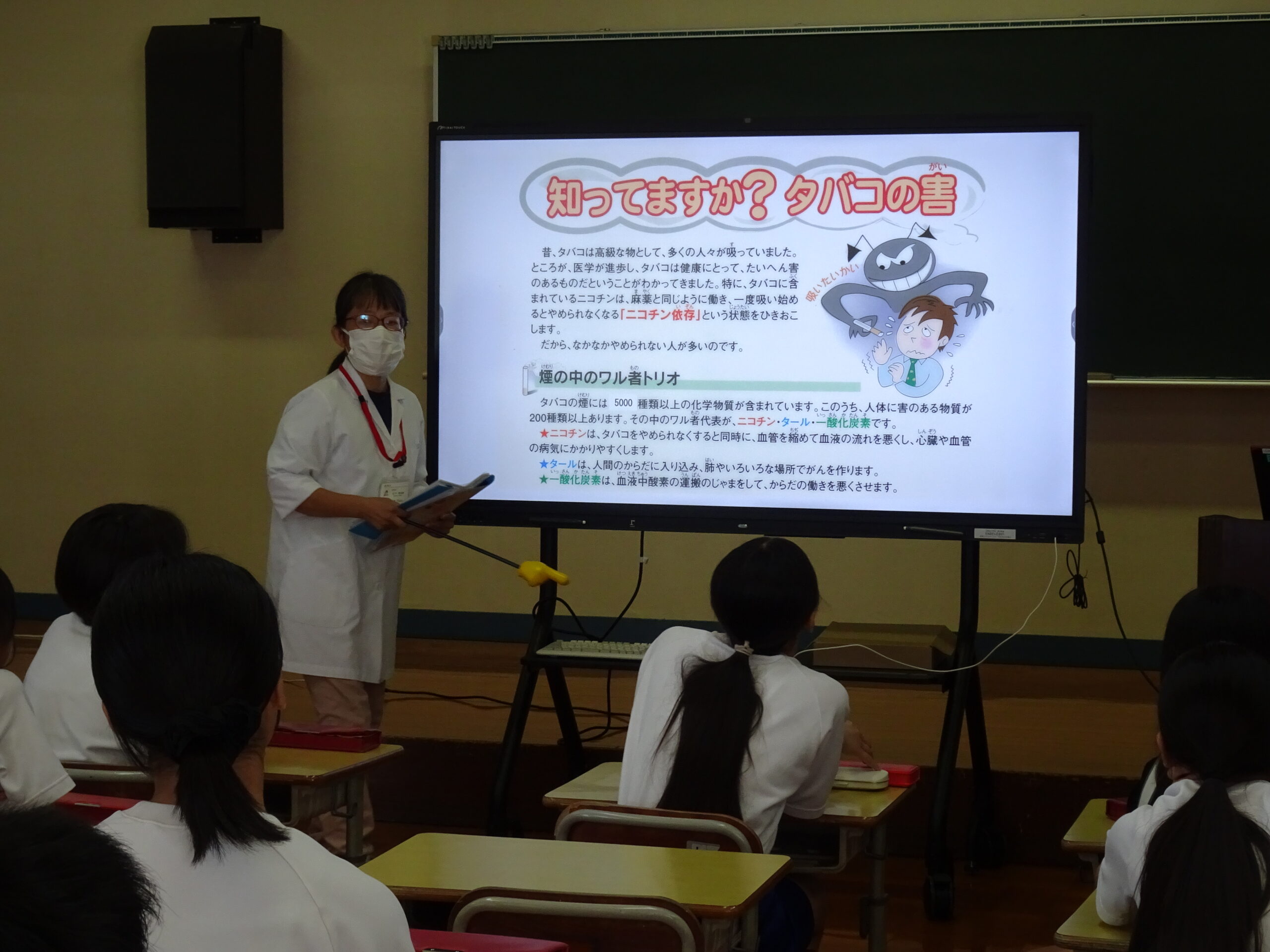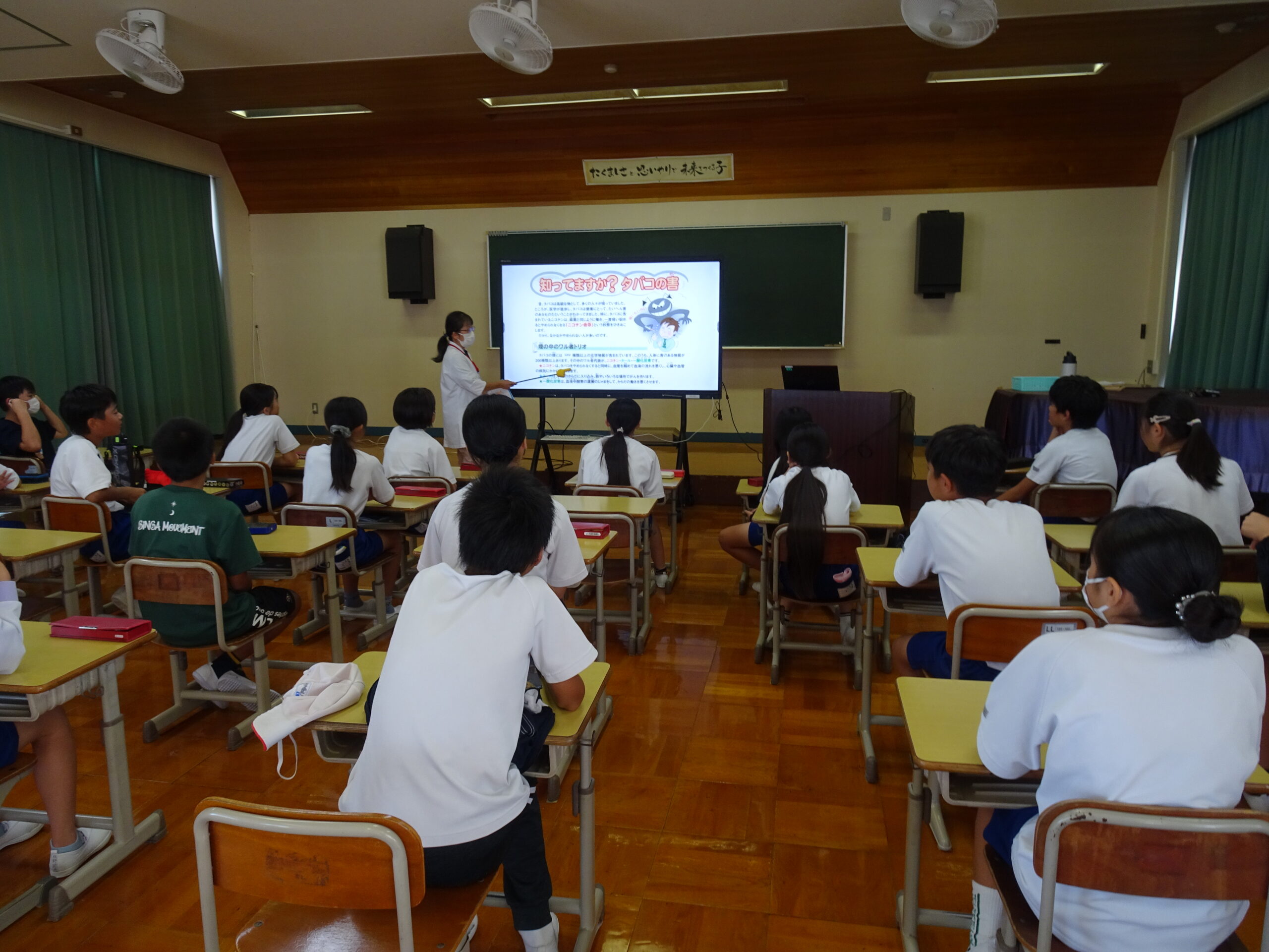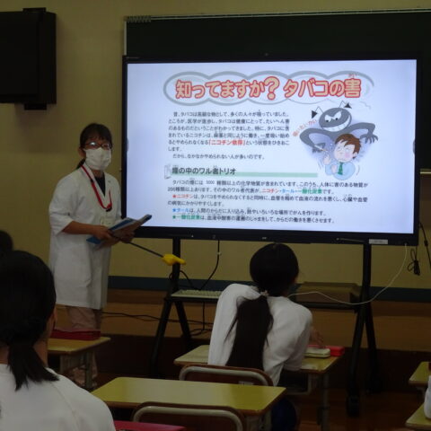 【6年生】薬剤師さんのお話を聞いたよ 2025/09/30 6年生が、学校薬剤師さんによる薬学講座をうけました。 朝、「薬学講座って何?」「どんなお話なの?」と言っていましたが、お話の内容はしっかりわかりましたか? タバコが体に与える影響など、いろいろなお話が聞けました。