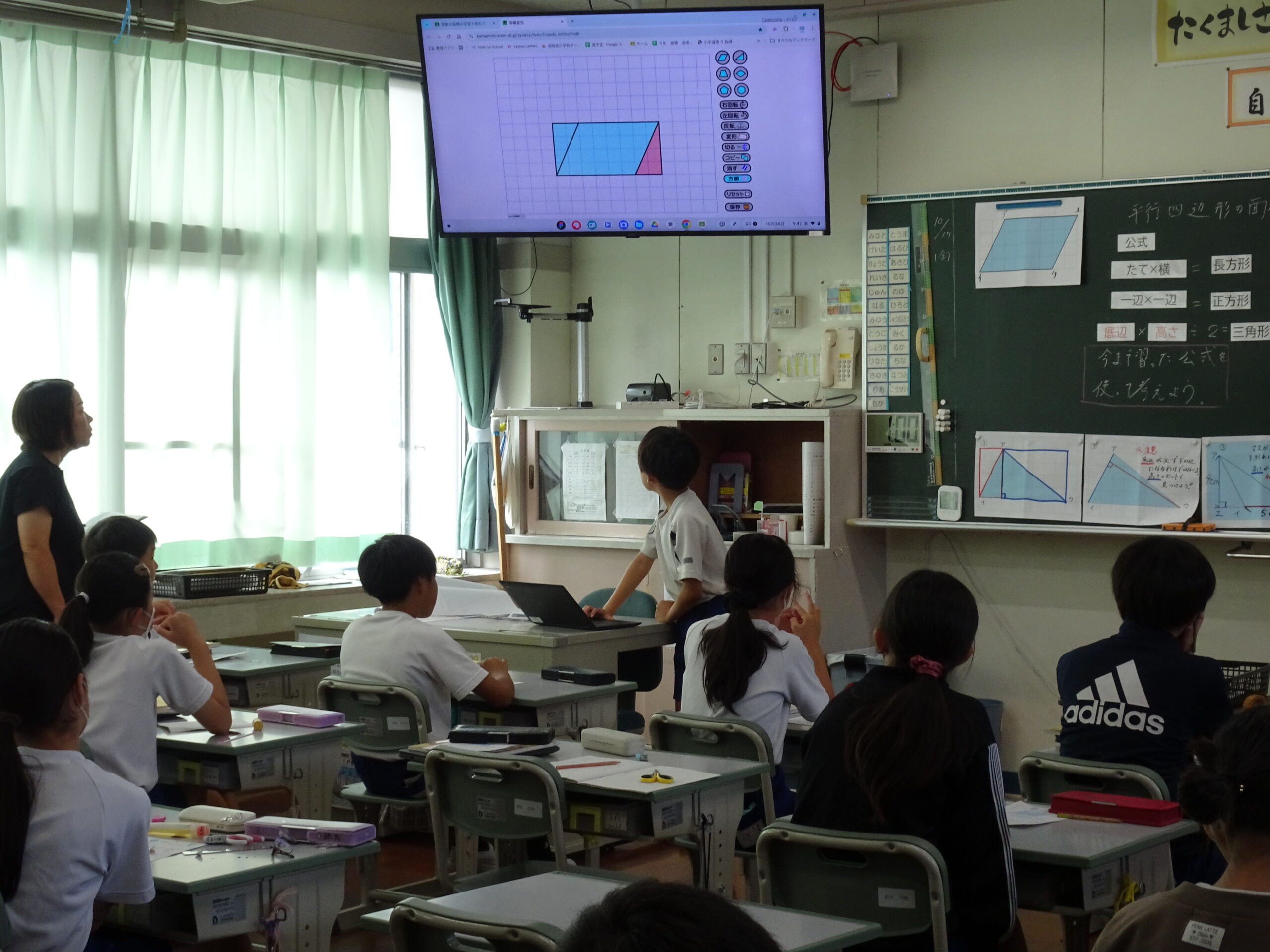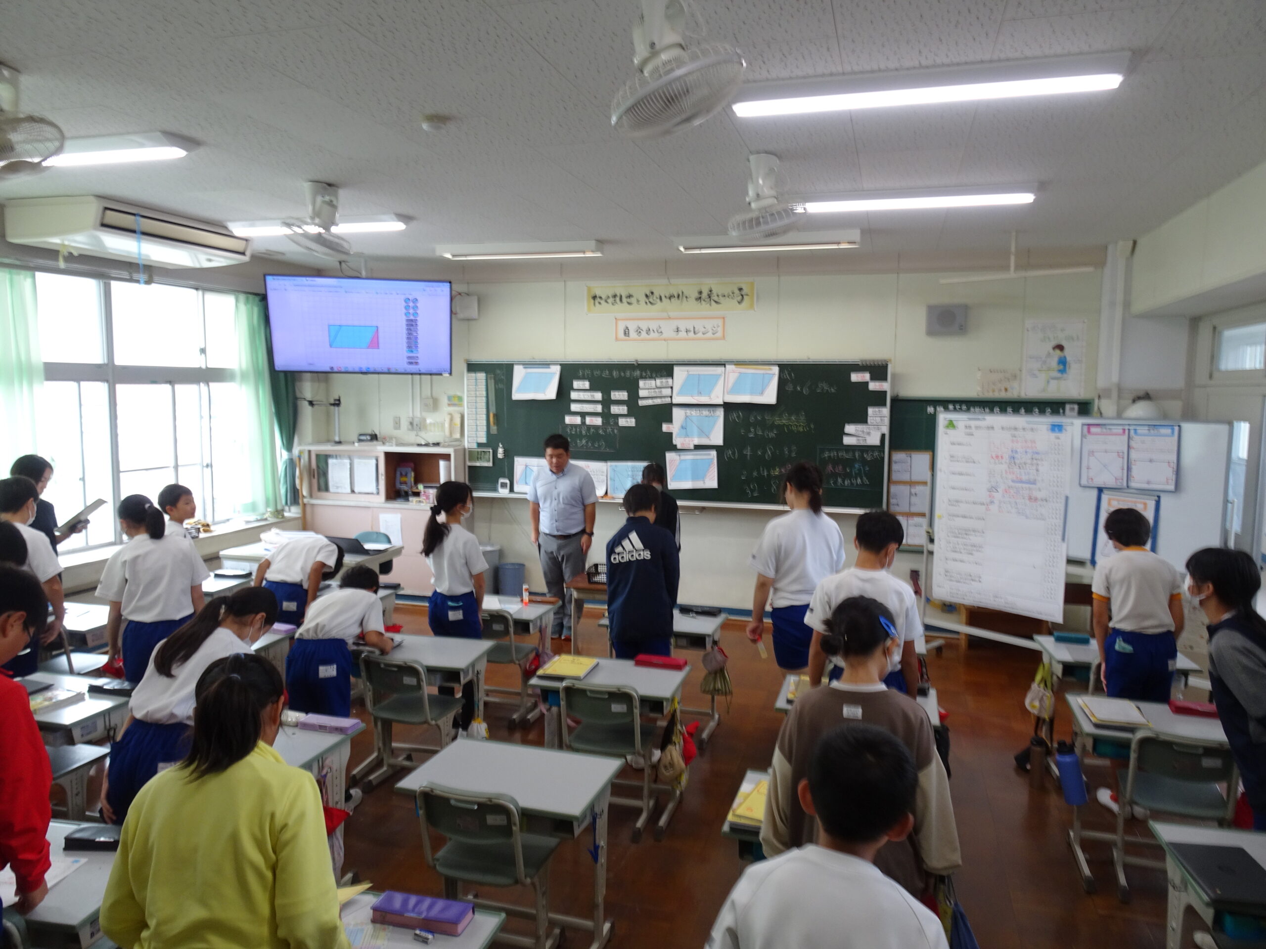 教育委員会の先生も参観してくれて、みんなが真剣に課題に取り組んでいる姿をほめてくれました。平行四辺形の面積の求め方を個人で探す時間の集中力にはびっくりさせられました。