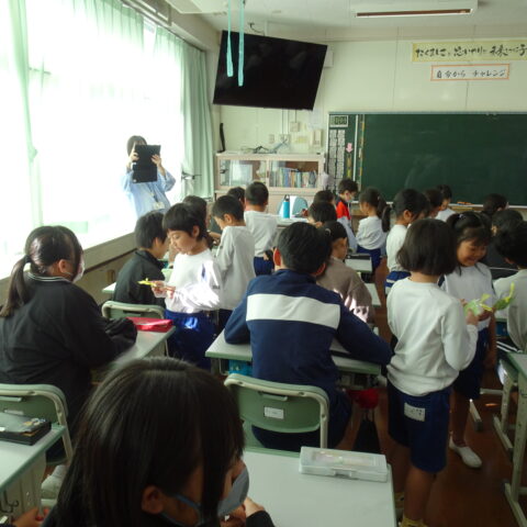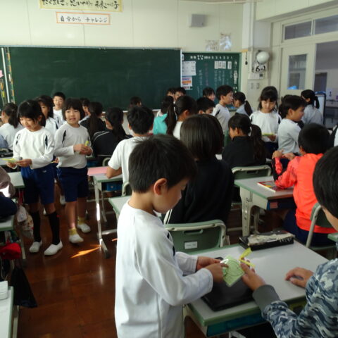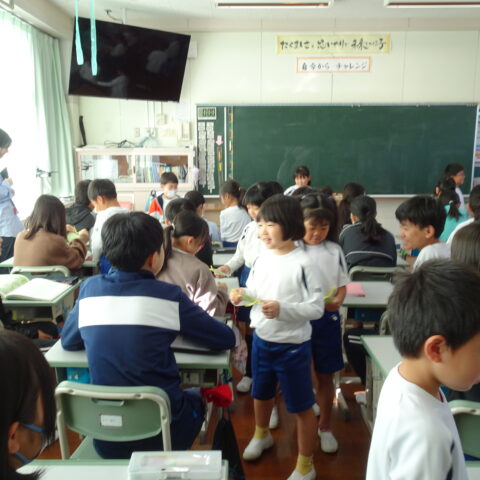 6年生の教室に行く時は、ちょっと緊張した表情でしたが、メッセージをしっかり届けられました。お守りには、たくさんのメッセージが書かれていて、6年生もうれしそうでした。