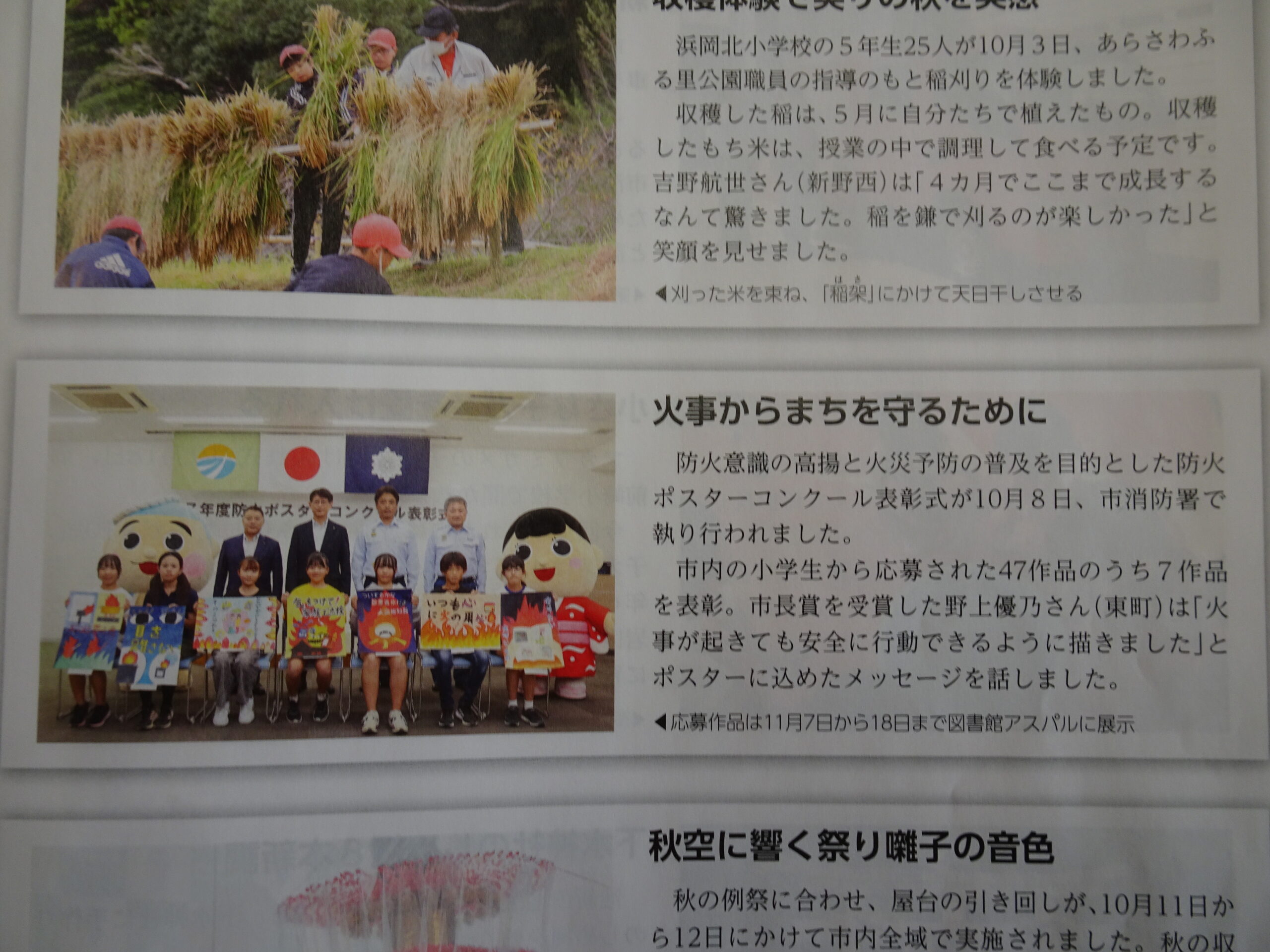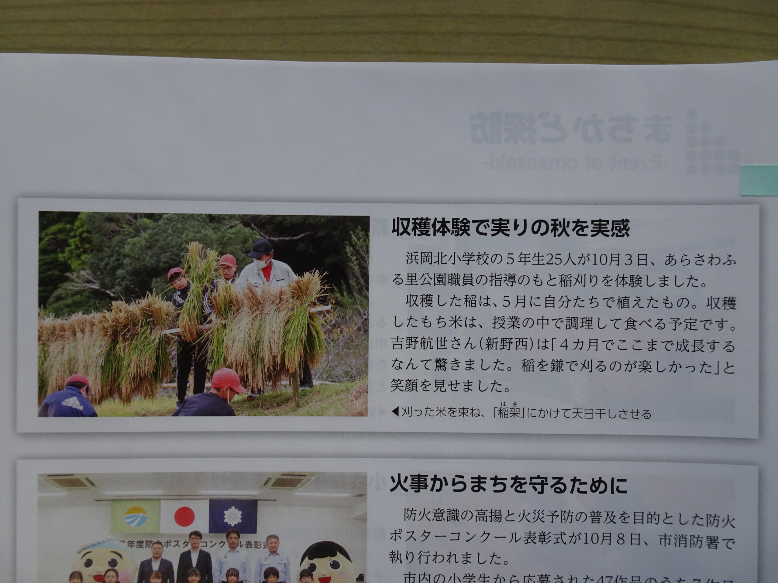 広報おまえざきに北小の子供たちの様子がのっています 2025/11/18 5年生の稲かり体験と防火ポスターコンクール表彰式の様子が、広報おまえざき11月号にのっています。 今回の11月号には、御前崎小学校さんの子ガメの飼育の様子や地域で取り組んでいる環境を守る取組がのっているので、ぜひ見てください。 北小学校のまわりの環境だけでなく、御前崎市全体の環境について知るいいチャンスですね。