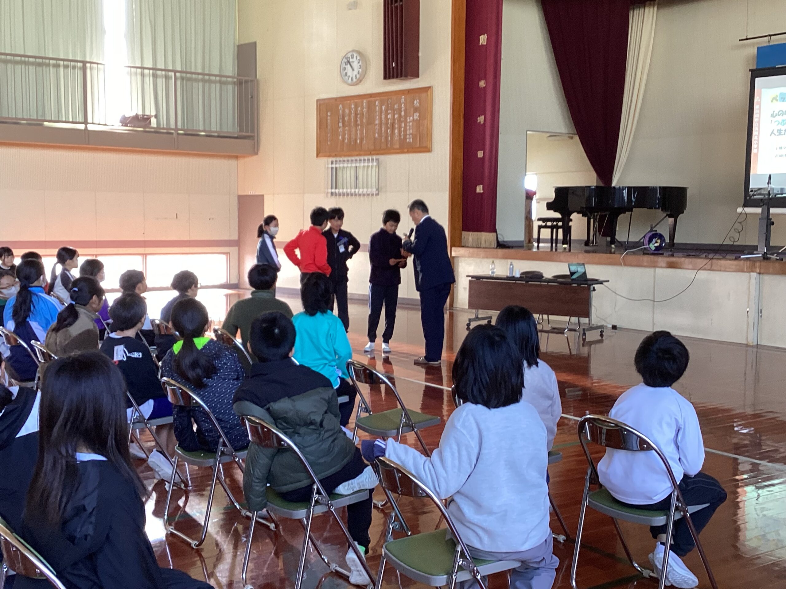 ペップトークって? 2025/12/05 今日は4年生から6年生と保護者の皆さんが参加して、学校保健委員会がおこなわれました。 講師の先生は日本ペップトーク普及協会の岩崎先生でした。先生が今まで経験したことのお話や言葉の大切さを教えていただけた時間となりました。 最初は、「ペップトークって何?」と思っていた人たちがほとんどでしたが、とても勉強になったと思います。 最後に「今まで聞いたお話で一番感動しました」という感動を言ってくれた子がいました。 とてもすてきな時間をもらえましたね。