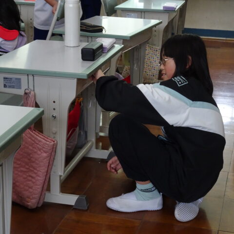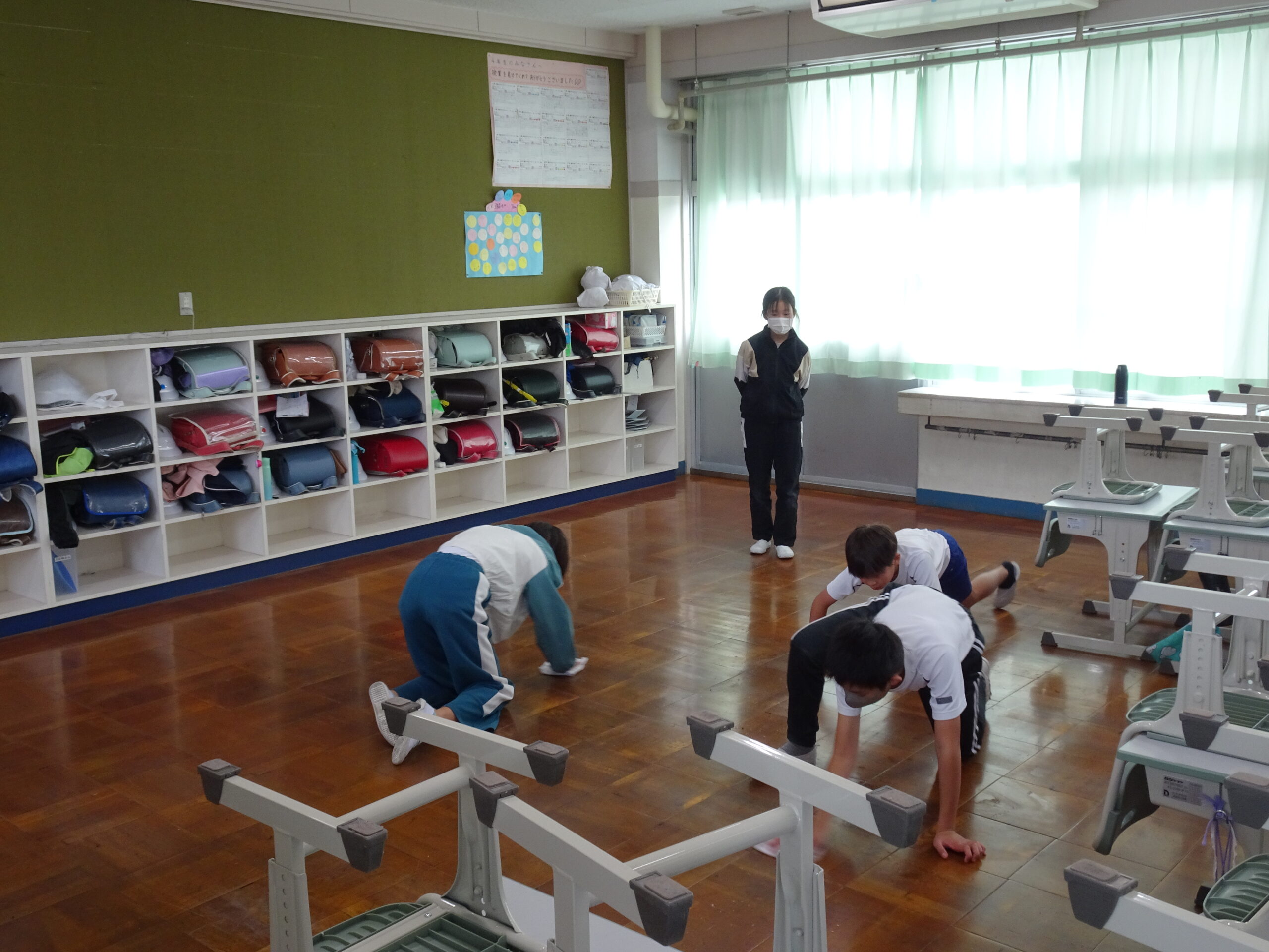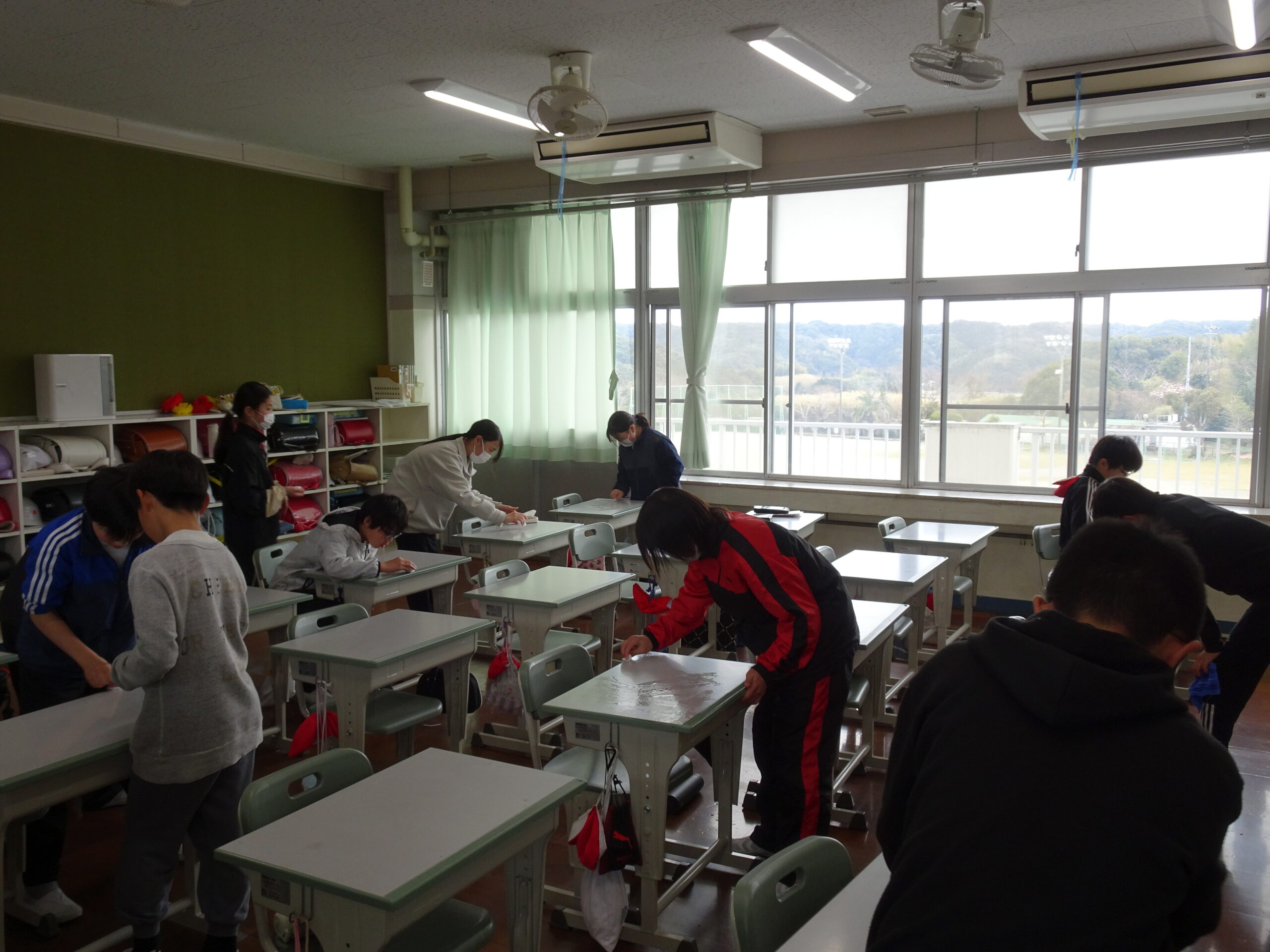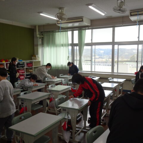 教室をのぞくと、修了式でのチャレンジ発表の練習しているクラスや大掃除をしているクラスがありました。