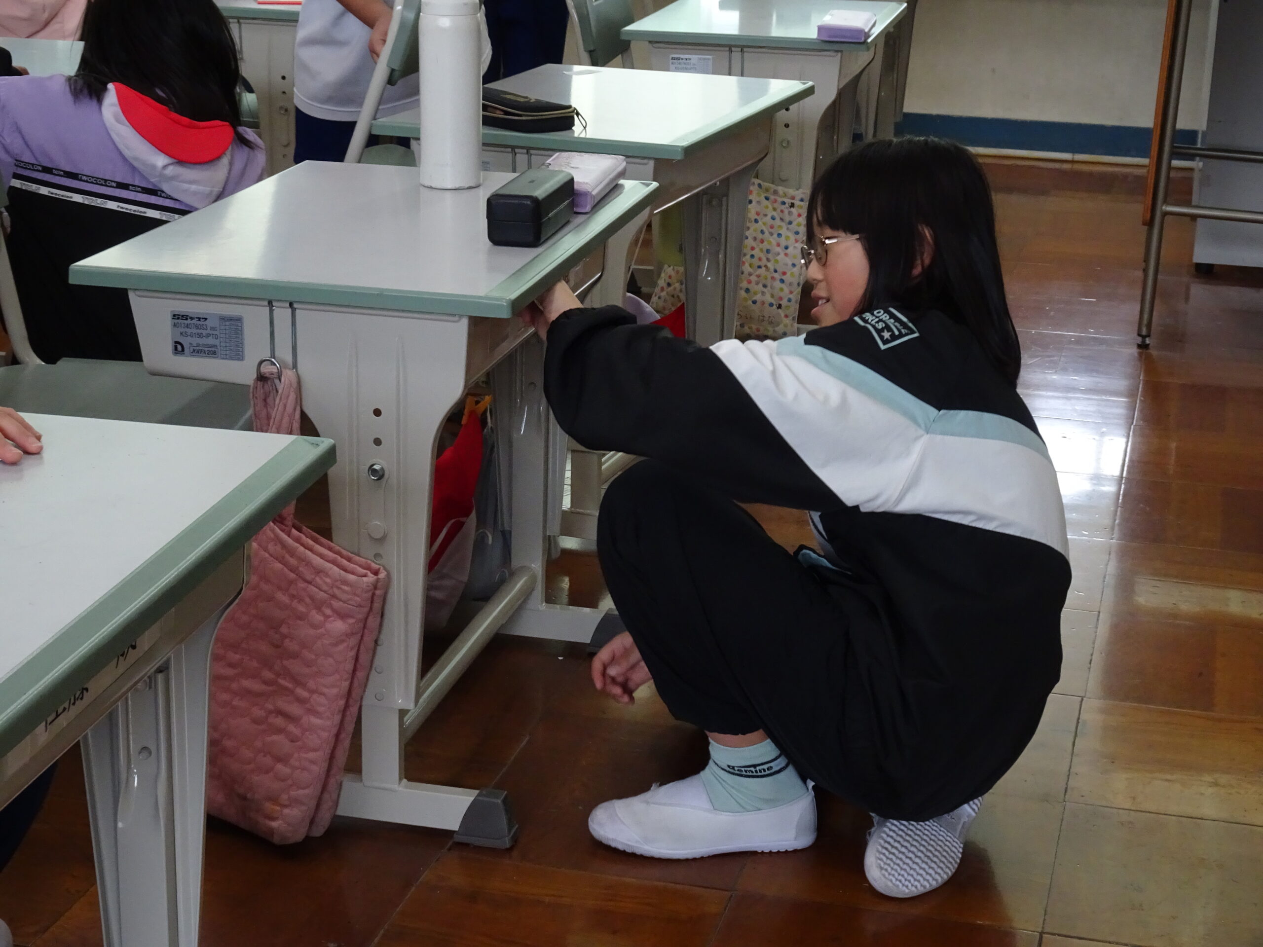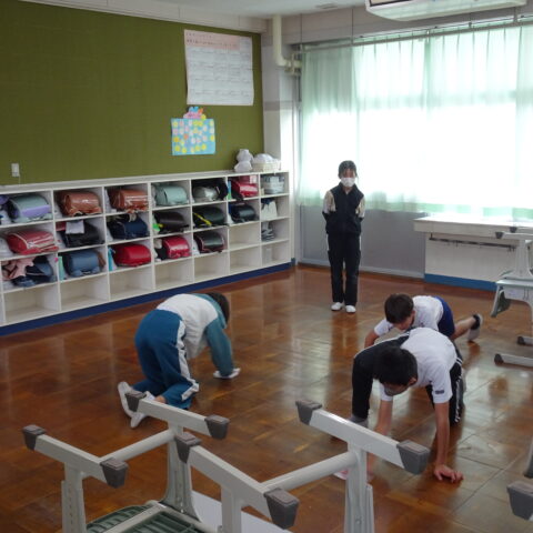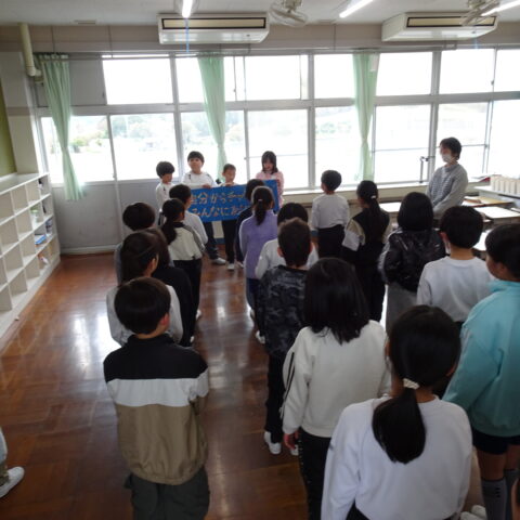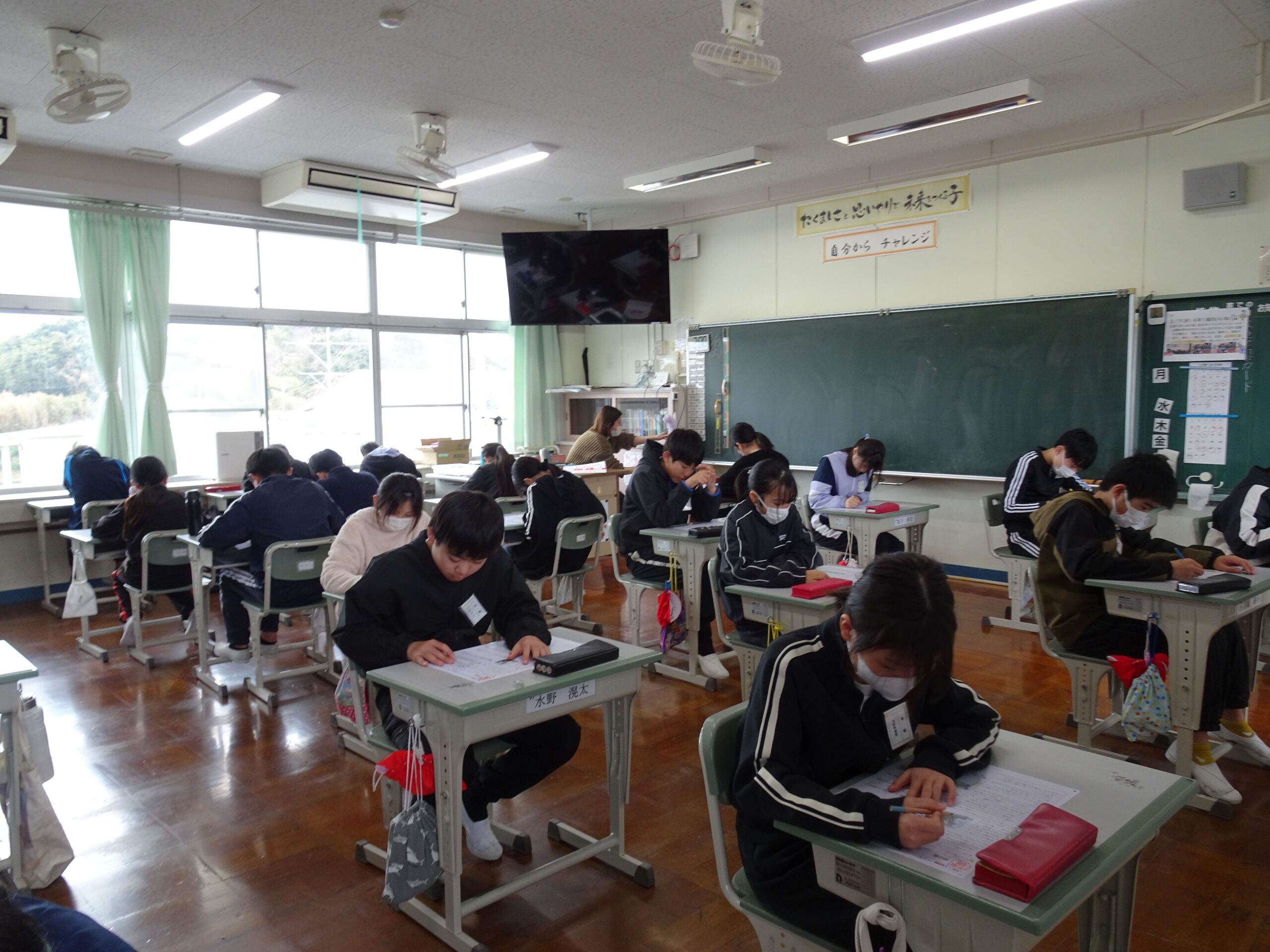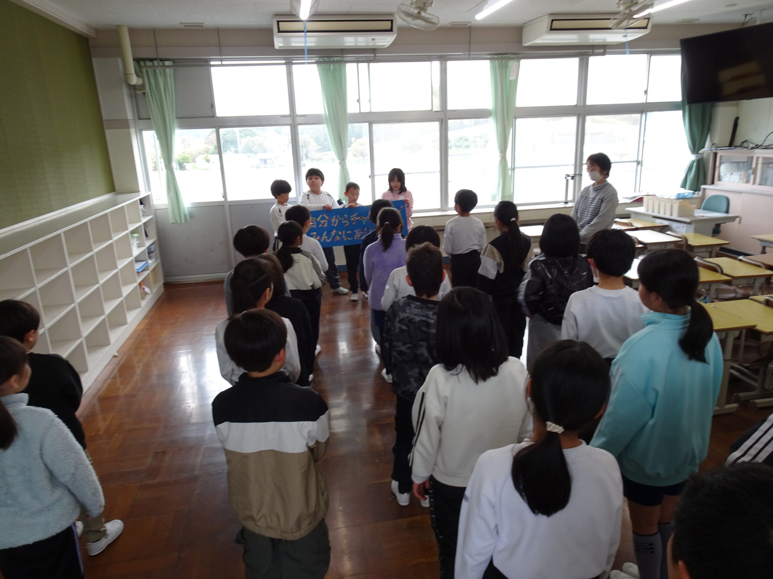 教室をのぞくと、修了式でのチャレンジ発表の練習しているクラスや大掃除をしているクラスがありました。