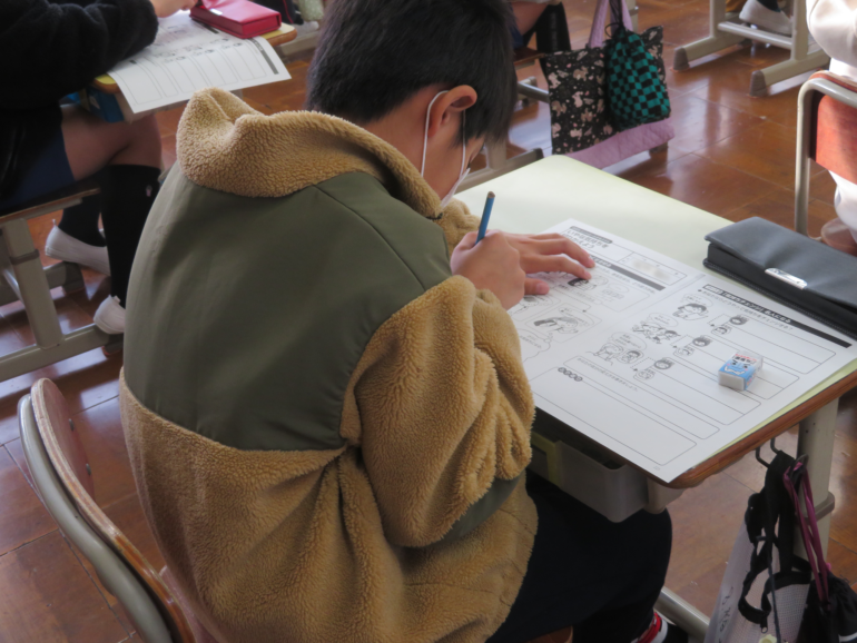1月 こころの日 2022/01/11 今日の朝活動は「こころの日」です。 今日のテーマは、気持ちの切りかえです。 いやなことがあった時、どのように気持ちを切りかえるか、ワークシートに書いたり、グループで話し合ったりして考えました。