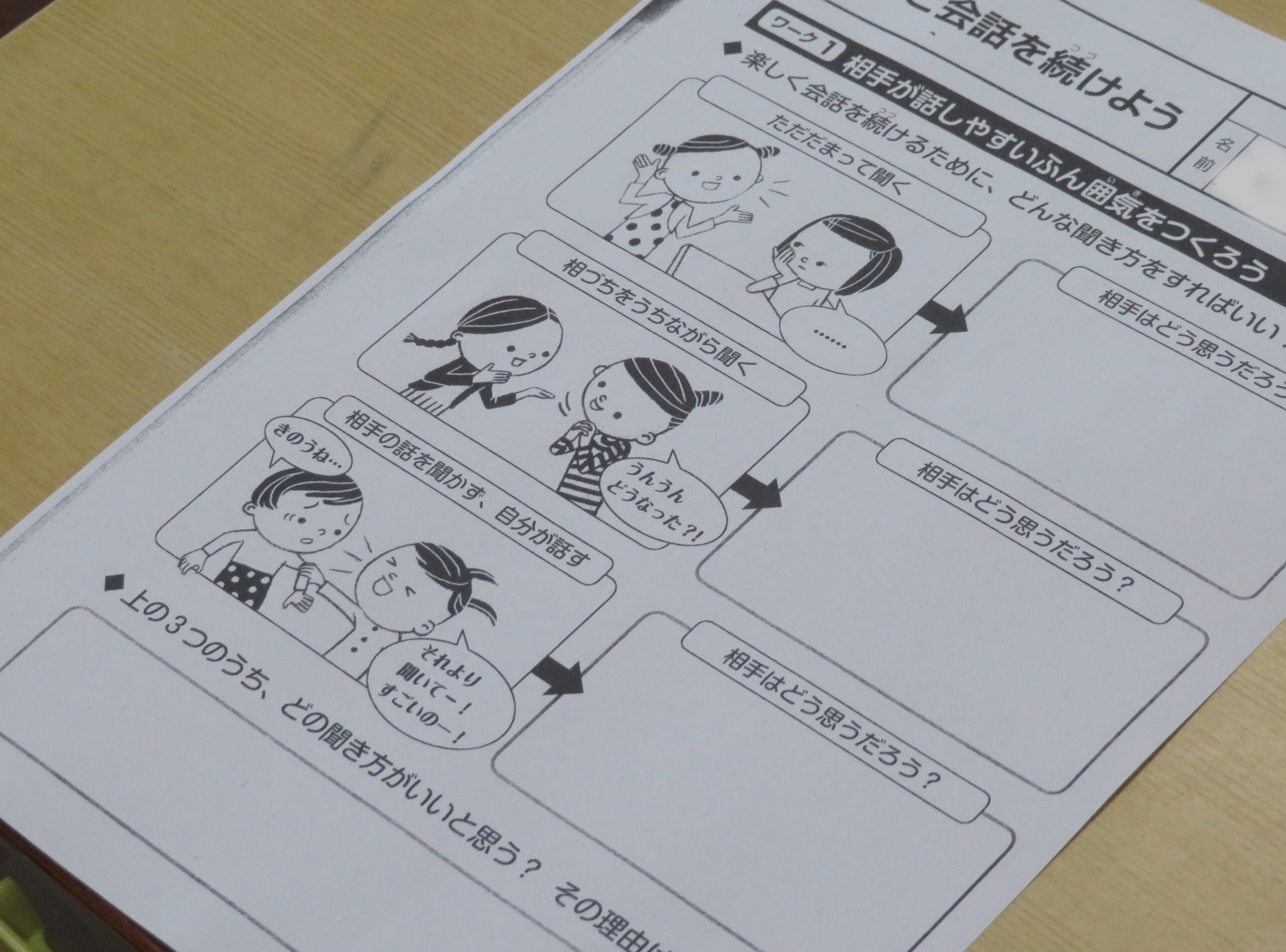 友達への声のかけ方や話の聞き方について、ワークシートに記入したり、話し合ったりして考えました。