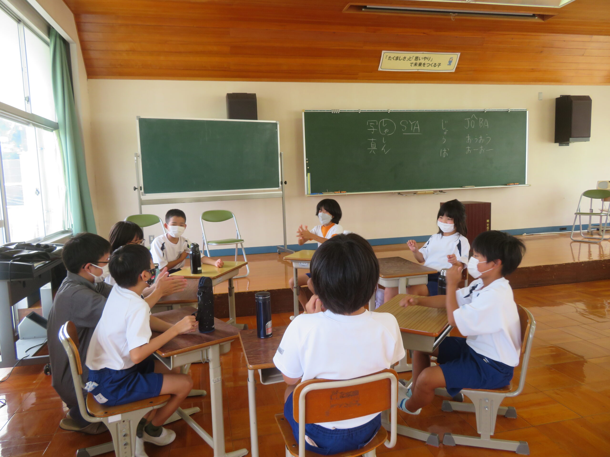 4年生 演劇ワークショップ 2022/09/01 9月30日に予定されている観劇教室に向けて、4年生を対象に演劇ワークショップが行われました。 講師は演劇倶楽部「座」の皆さんです。 「あ・い・う・え・お」の母音だけで、話したり、聞き取ったりする活動に初めは戸惑っていた子供たちも、最後には、自然に口にできるくらいになっていました。 どの子も笑顔で楽しそうに活動していました。