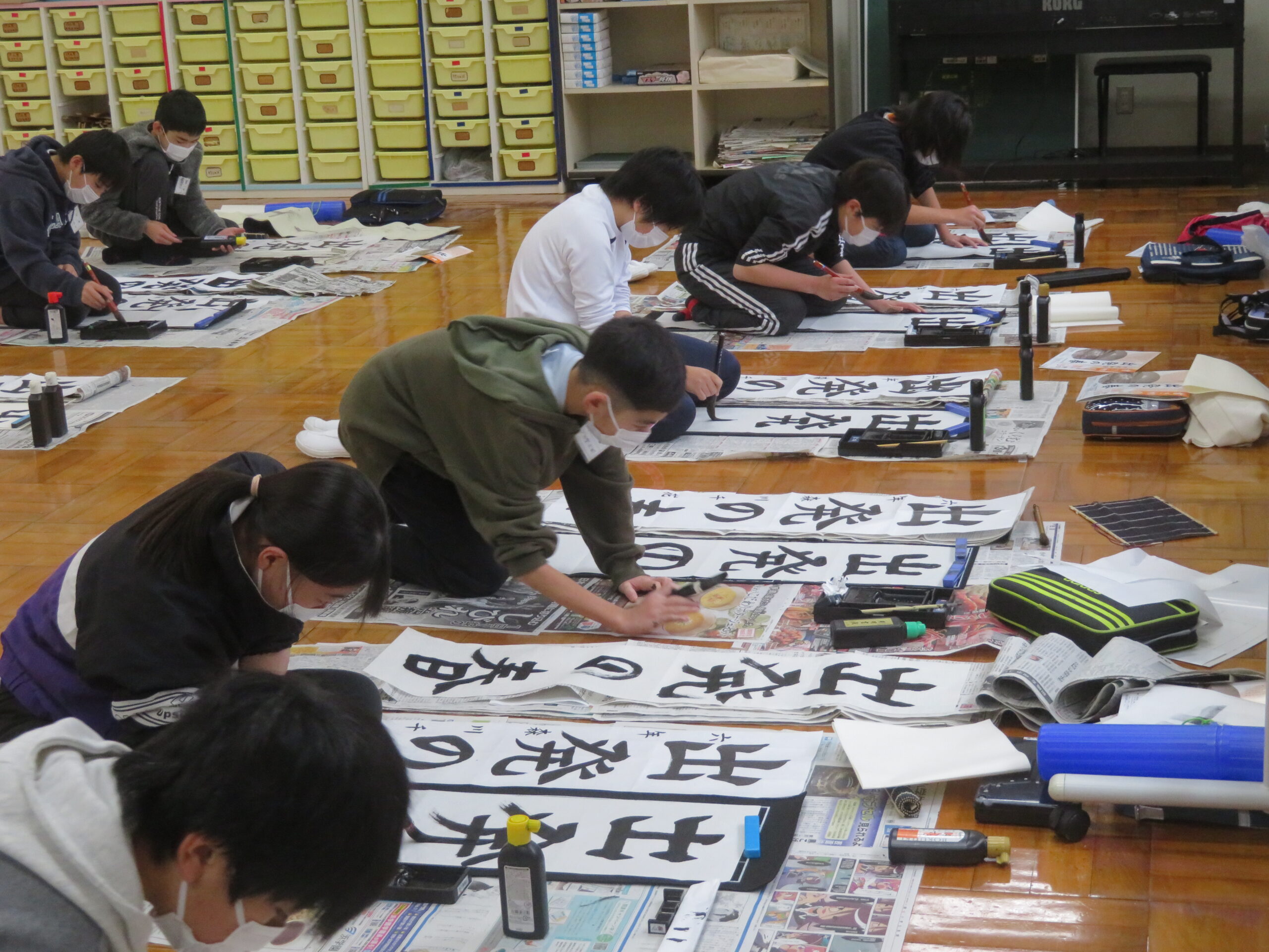 北の子ホールで新聞氏を広げて、大きな筆を使って真剣に練習に取り組んでいます。