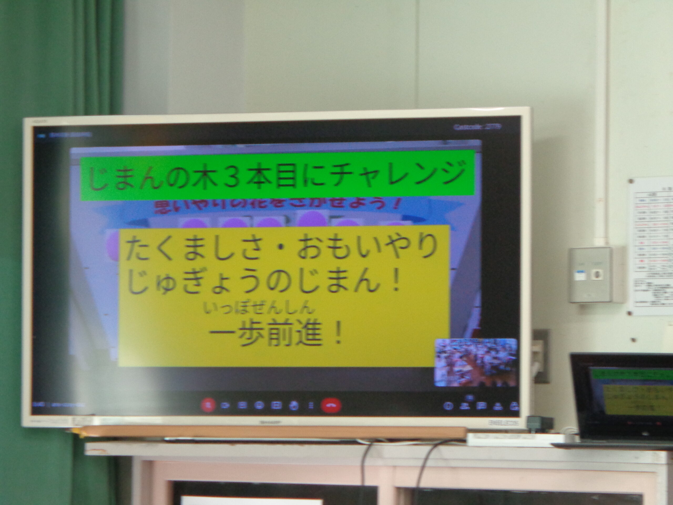 第3ステージ ステージ式 2023/10/12 第3ステージのステージ式が行われました。 各学級で、第2ステージまでに自分たちが増やしてきたじまんと、第3ステージのじまん宣言をしました。 第3ステージのキーワードは、「授業のじまんいっぱい」です。 子供たちはこんな授業にしたいという思いを大きな声で発表しました。Meetで行ったステージ式ですが、全校に子供たちの元気な声が響いていました。