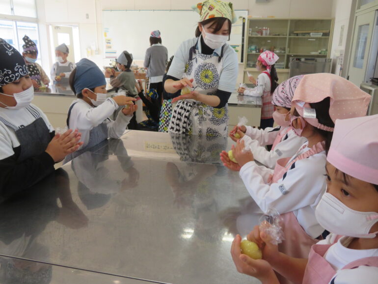 1年 サツマイモ料理 2023/11/17 1年生が畑で収穫したサツマイモを使ってスイートポテトづくりにチャレンジしました。 健康づくり課の皆さんが、来校して教えてくださいました。 家庭科室はサツマイモのおいしそうなにおいでいっぱいでした。