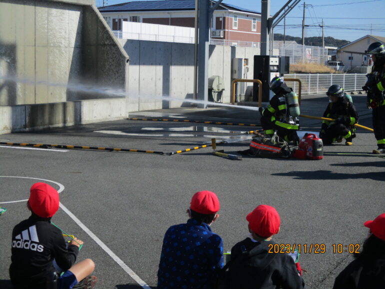 3年 消防署・浜岡交番見学 2023/11/30 3年生が消防署と浜岡交番に社会見学に行きました。 消防本部では、消防本部の中の部屋を見たり、放水訓練の様子を間近で見学したり、消防署にある車両の説明を受けたりしました。 浜岡交番では、クイズ形式で警察関係の学習をしたり、警察官の装備品を見たり、ミニパトに乗車させていただいたりしました。