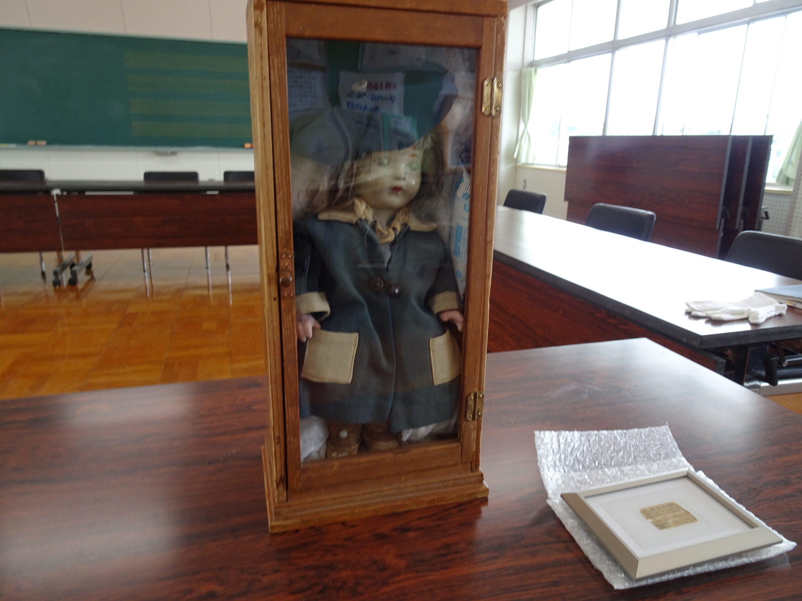 マーベルワレンちゃんが来ました 2024/04/30 授業参観日に「マーベルワレン」ちゃんの実物を展示しました。平成20年に御前崎市指定文化財になったため、普段は市立図書館に保管されています。マーベルワレンちゃんを守った、校務員の山田みつさんの思いから、いろいろなことを学びましょう。