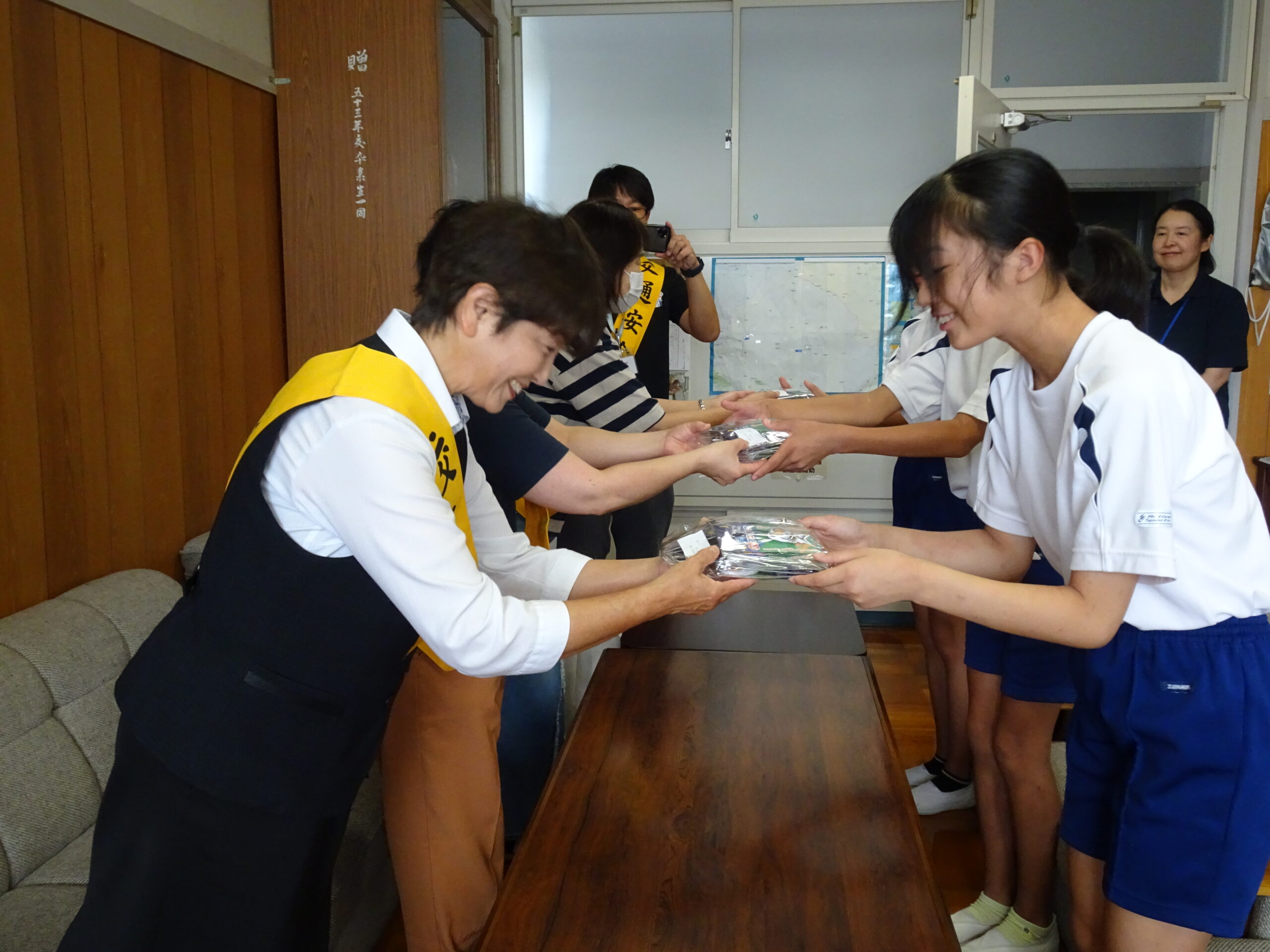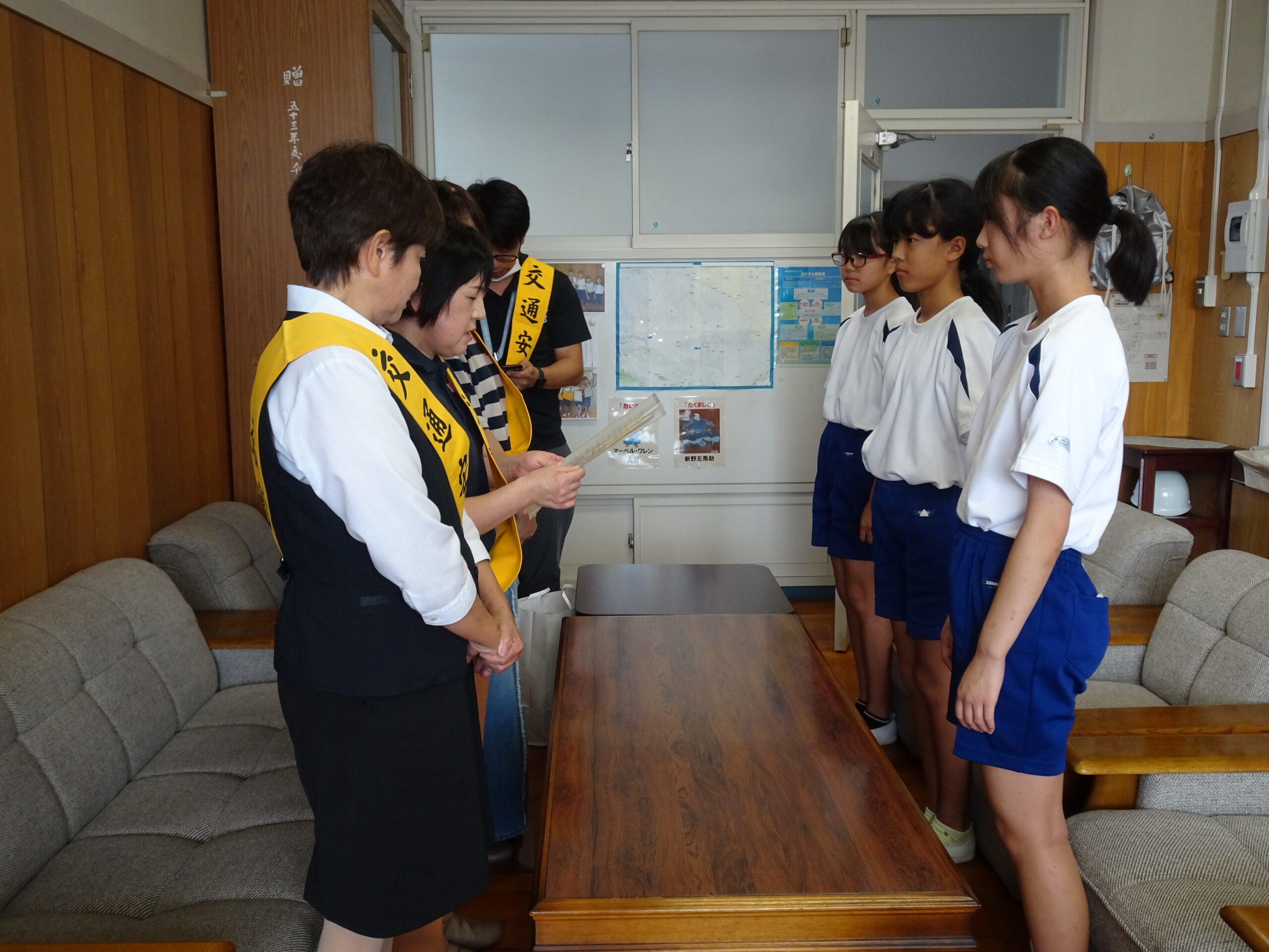 元気に登下校 2024/09/26 交通安全啓発の反射材キーホルダーを全校児童分いただきました。今日は児童を代表して、6年生の3人が贈呈式に参加しました。 いろいろな方々が、北小学校のみんなのことを心配してくれています。登下校はもちろんのこと、家で遊んだり、出かけたりする時も交通安全を心がけましょう。