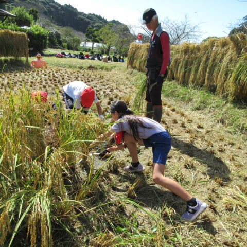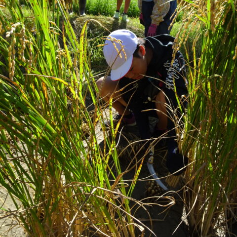 【5年生】稲刈りに挑戦 2024/10/01 5月に田植えを経験した5年生が、今日は稲刈りにむかいました。 あんなに小さかった稲がこんなにも成長していて感動でした。稲刈りが初めてという人ばかりだったので、最初は苦労していましたが、徐々に慣れ、最後には上手に鎌を扱っていました。自分たちで実際に作業をすると発見がいっぱいあったようです。
