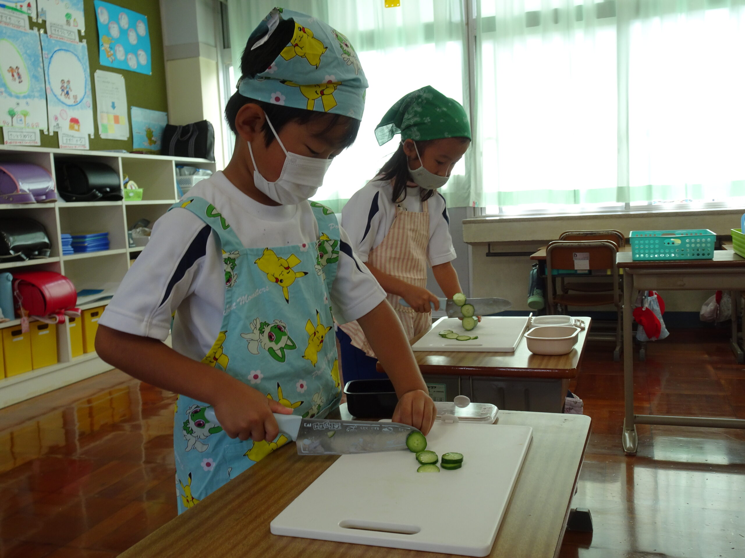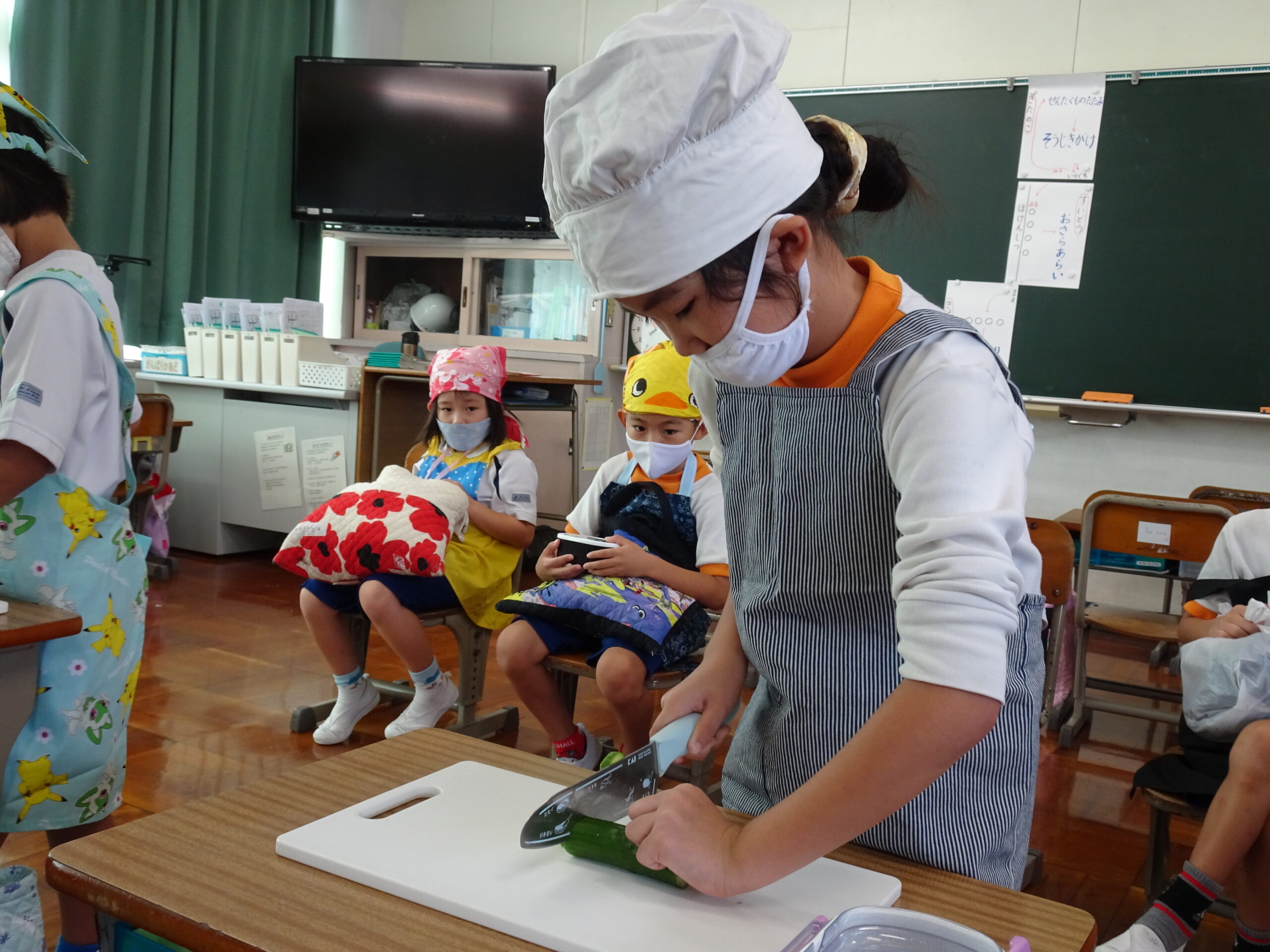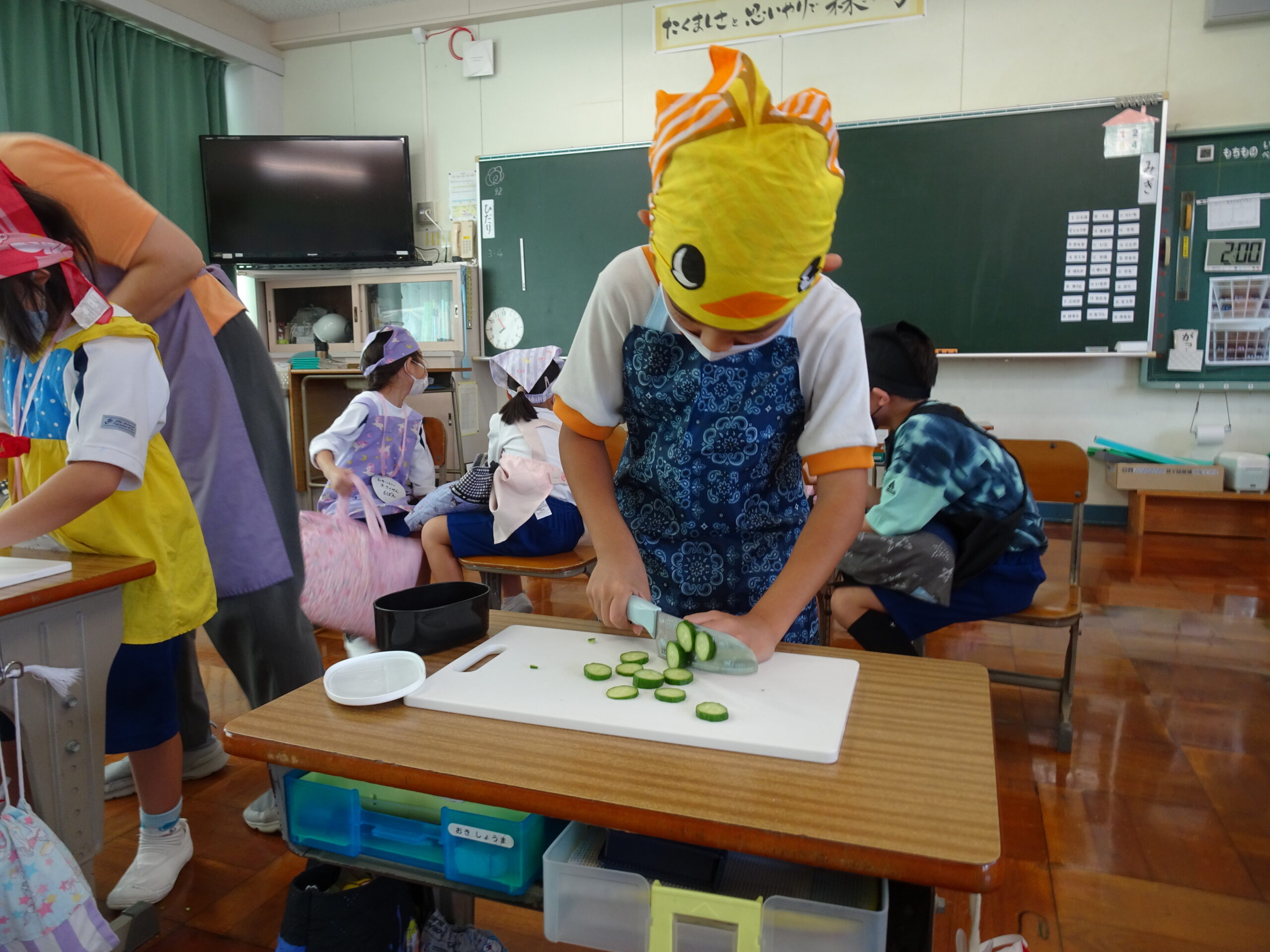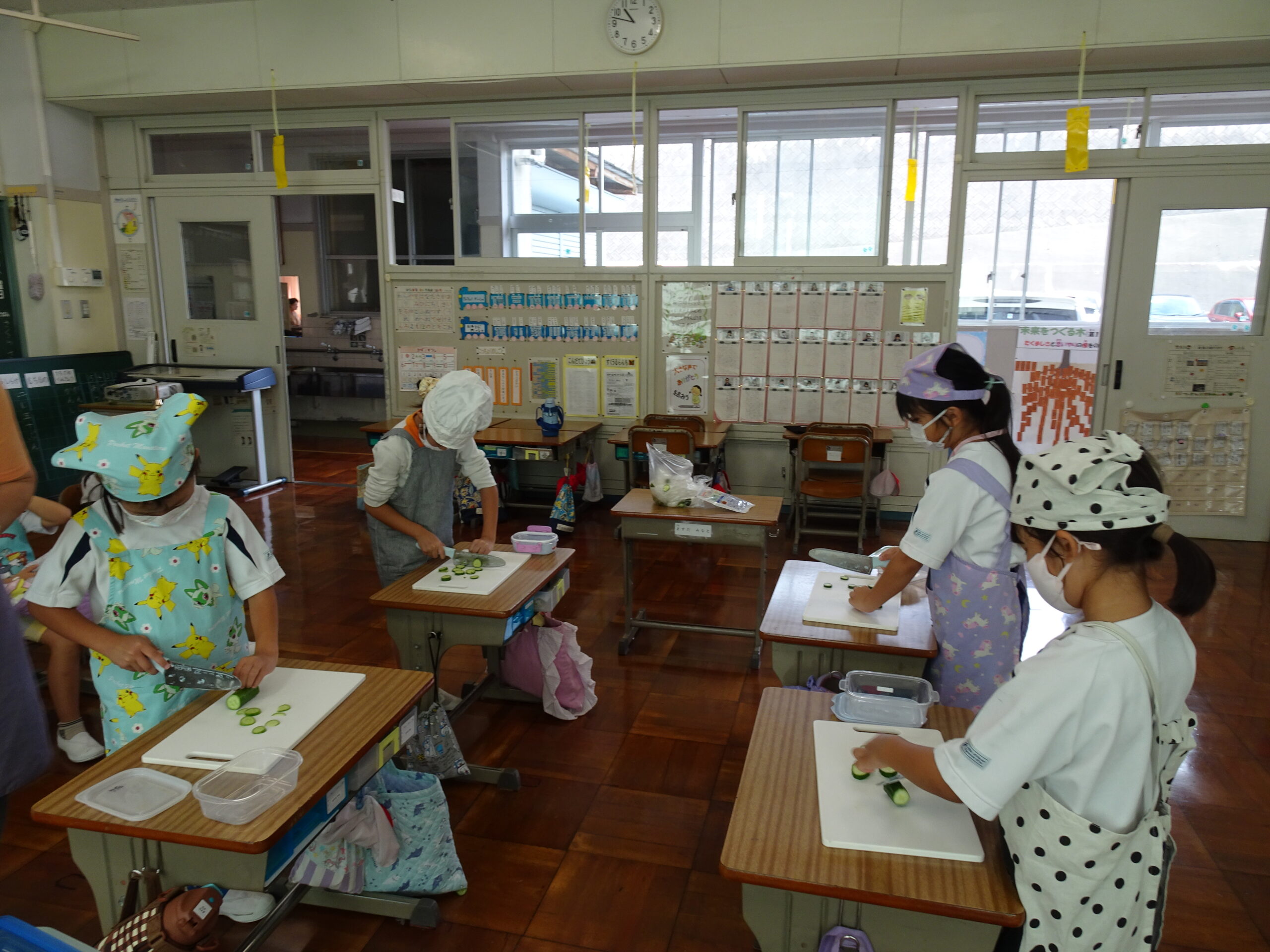 【1年生】お手つだい大さくせん 2024/10/08 1年生が6個のお手つだいに挑戦しました。「おねがいします!」と大きな声であいさつをして、それぞれのおしごとをやっていきました。 みんなとても上手で、家でもお手伝いをしているのがわかりました。 包丁を使って、きゅうりを切るのはむずかしかったかな?その後、おいしくいただいたようです。 お手つだい大さくせん、大せいこう!!