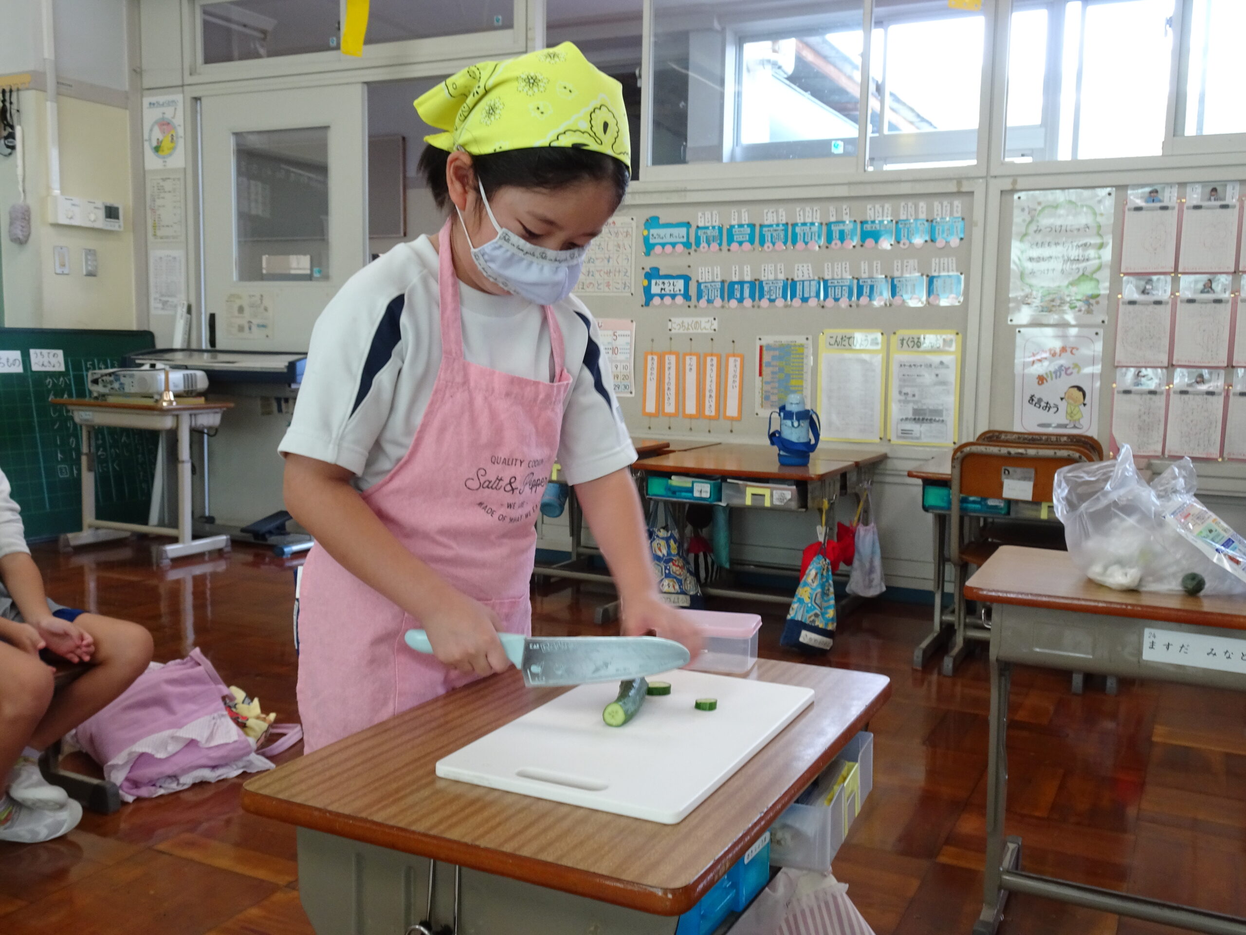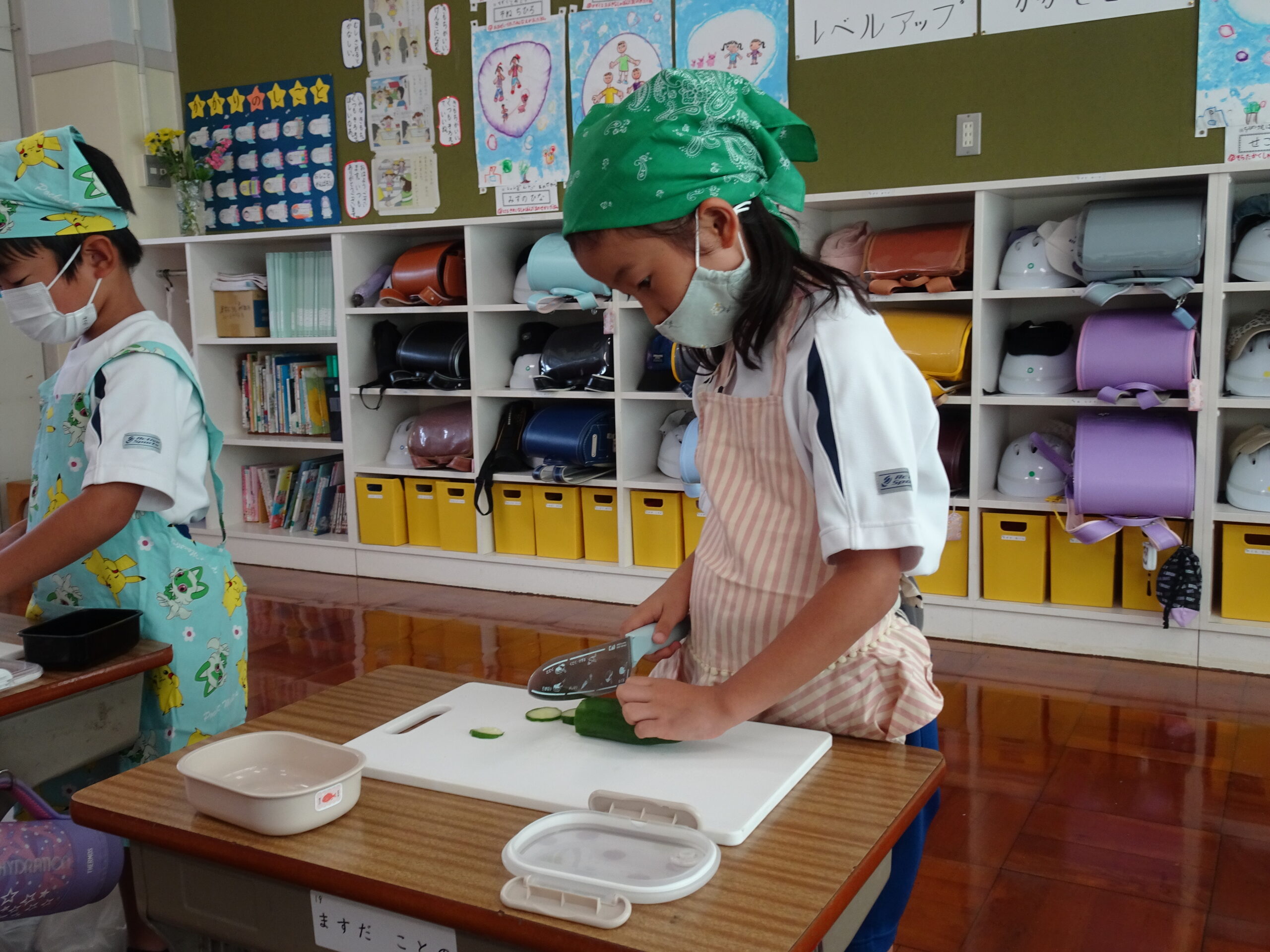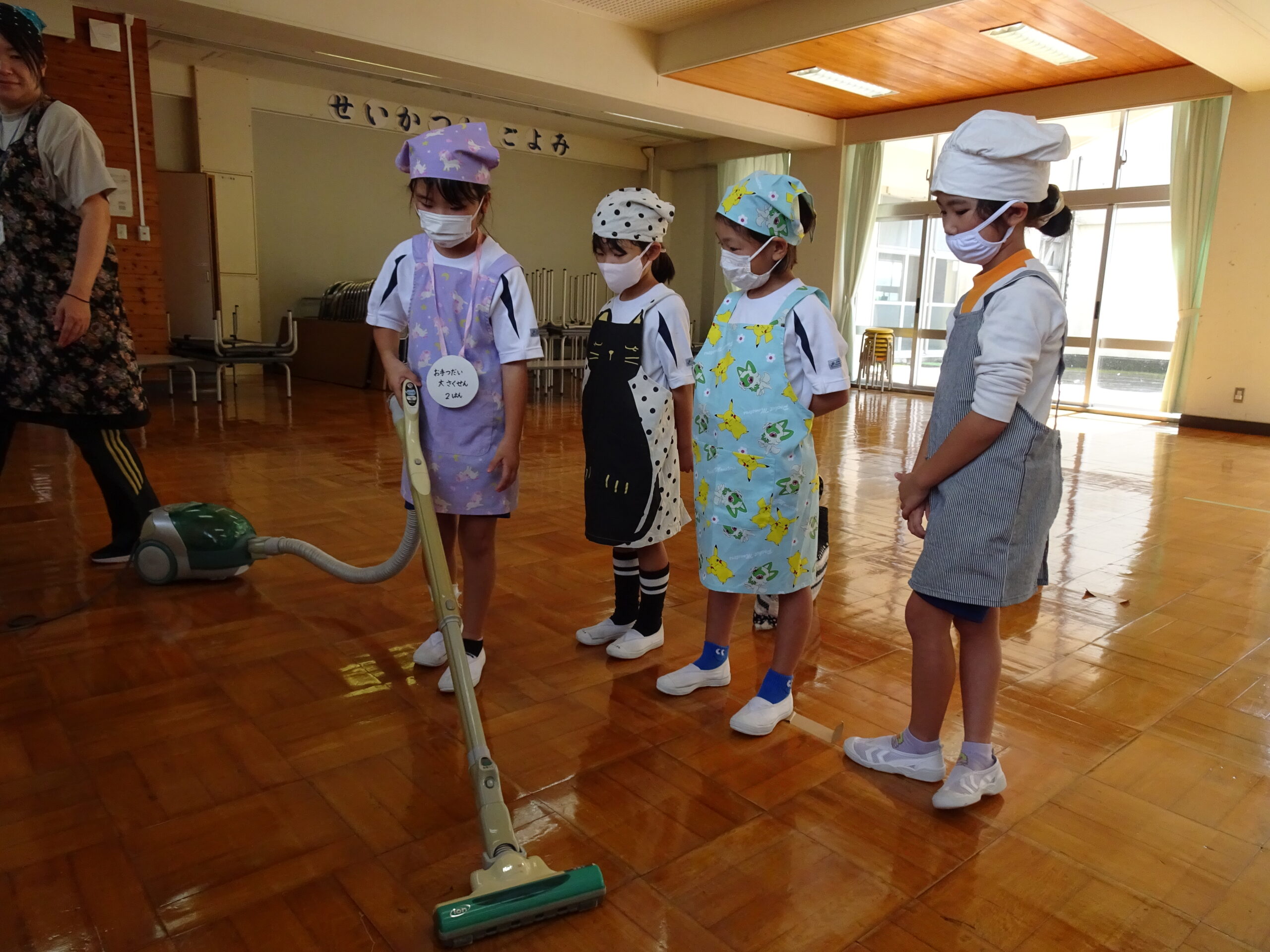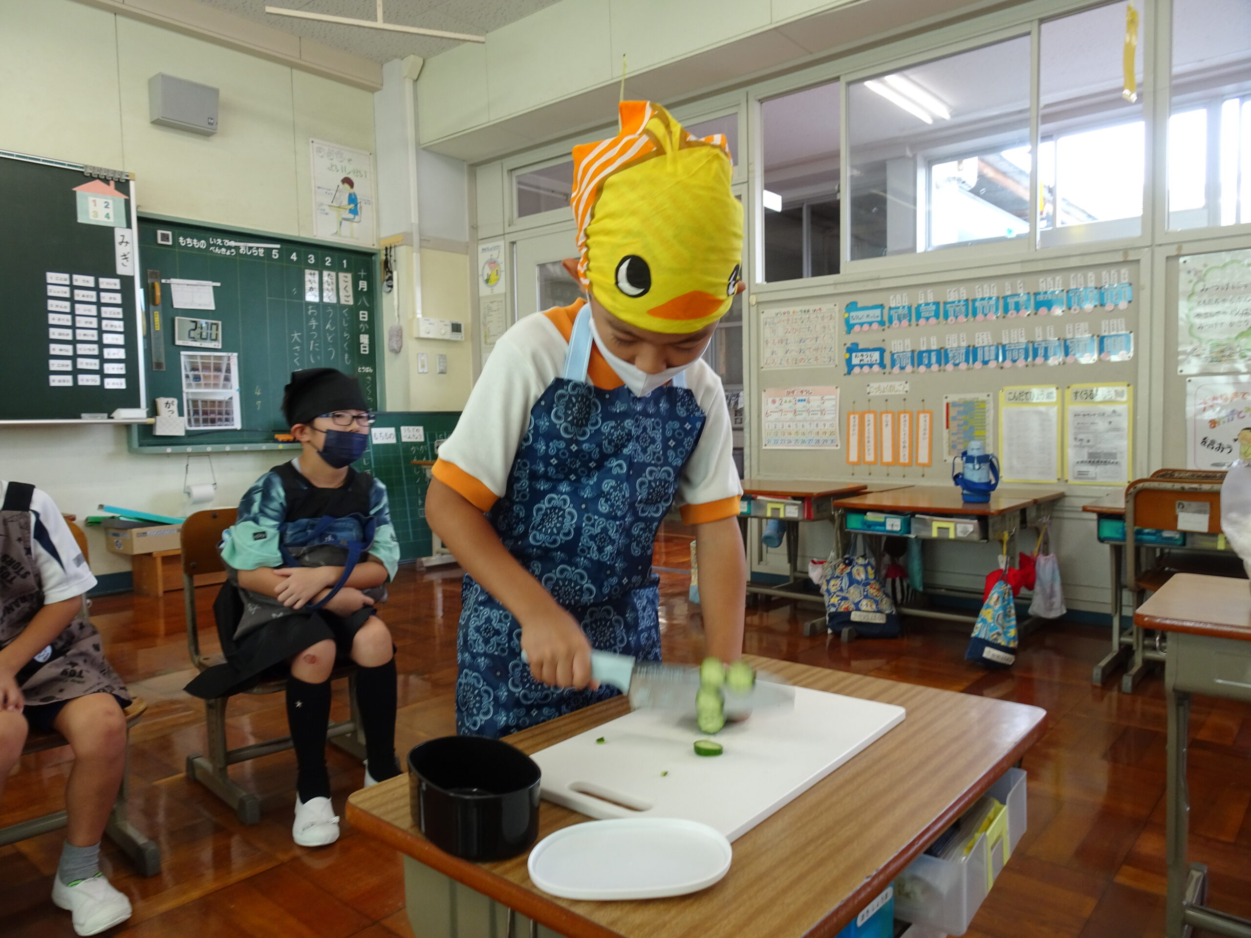 【1年生】お手つだい大さくせん 2024/10/08 1年生が6個のお手つだいに挑戦しました。「おねがいします!」と大きな声であいさつをして、それぞれのおしごとをやっていきました。 みんなとても上手で、家でもお手伝いをしているのがわかりました。 包丁を使って、きゅうりを切るのはむずかしかったかな?その後、おいしくいただいたようです。 お手つだい大さくせん、大せいこう!!
