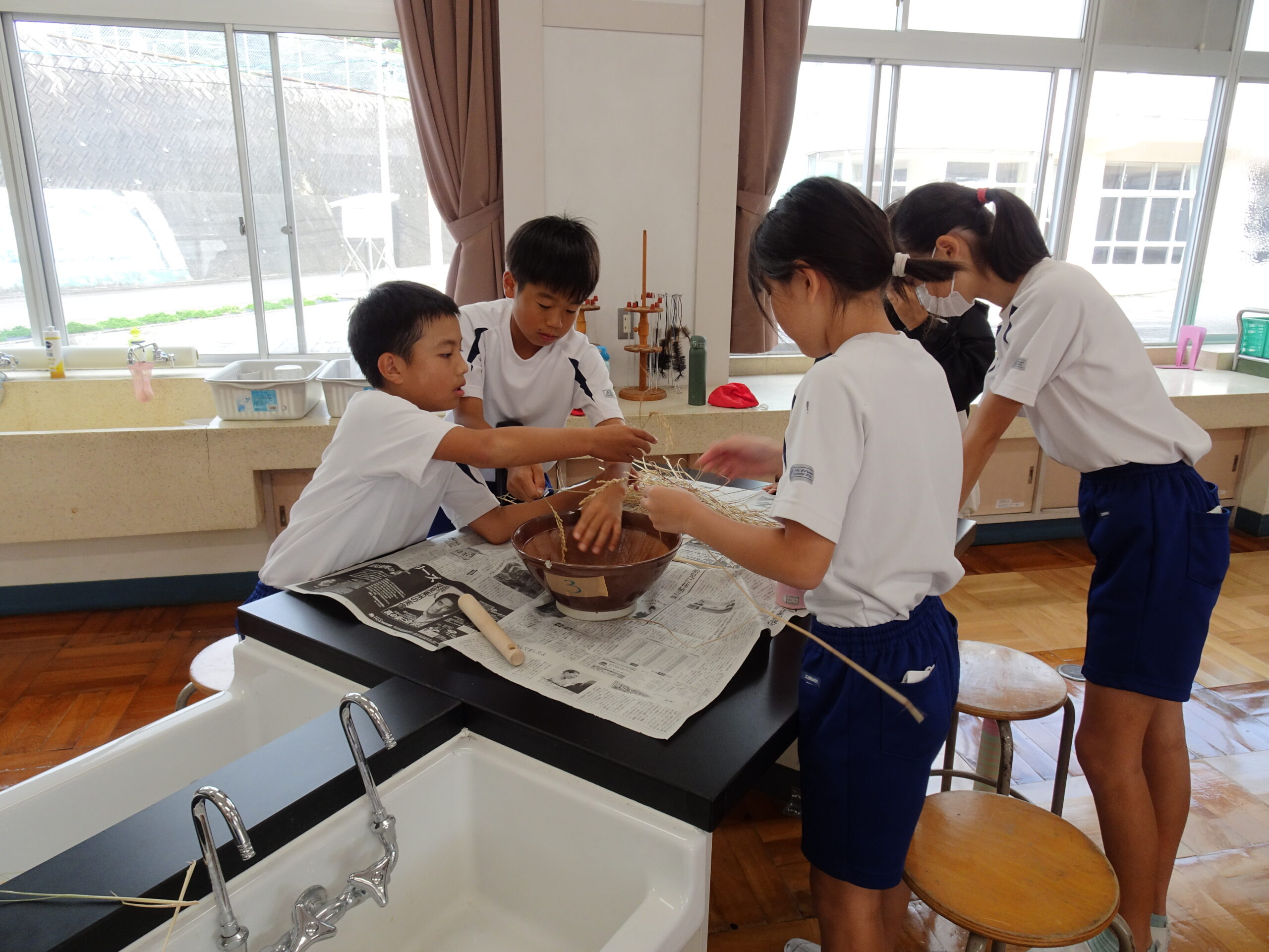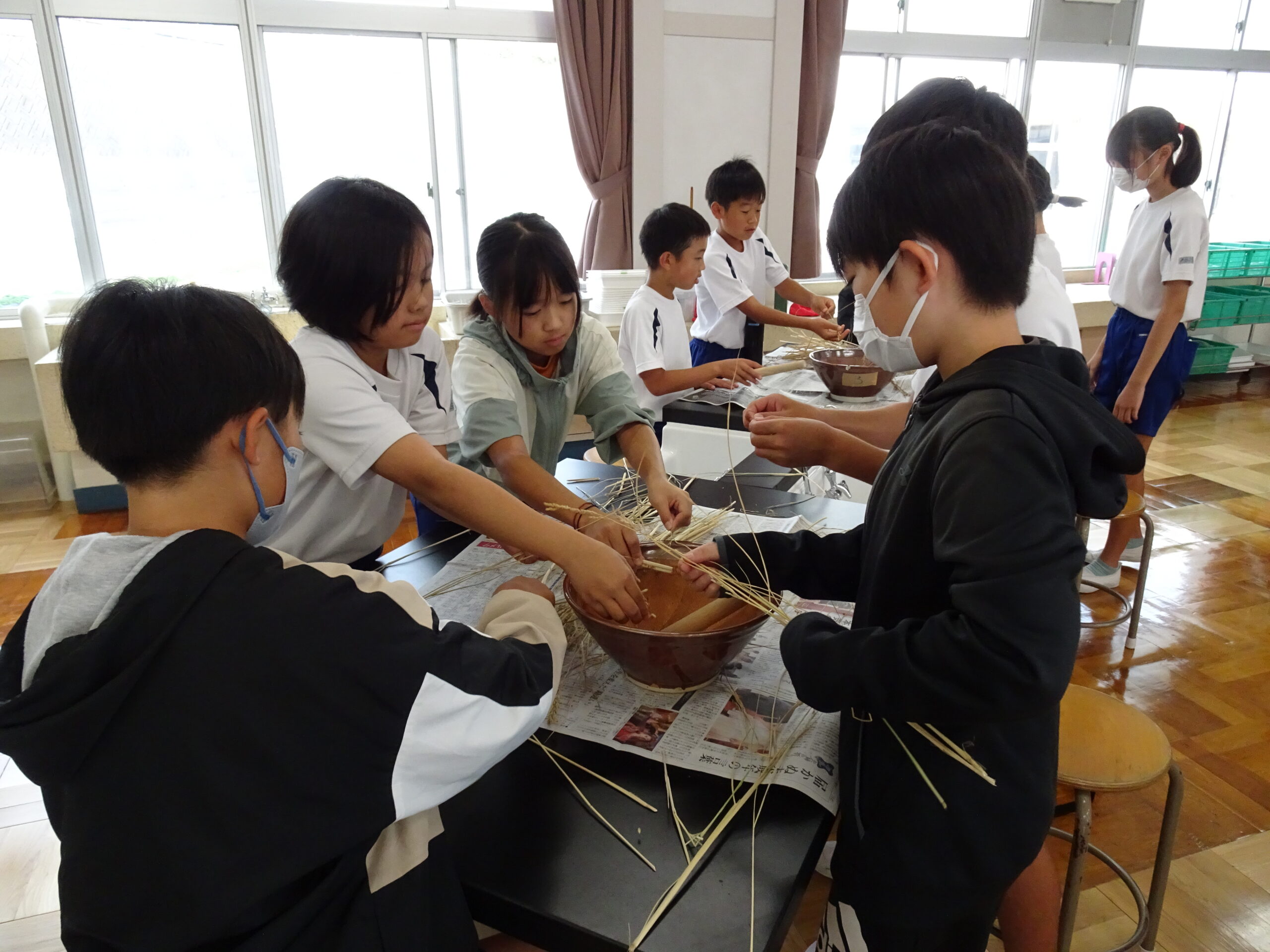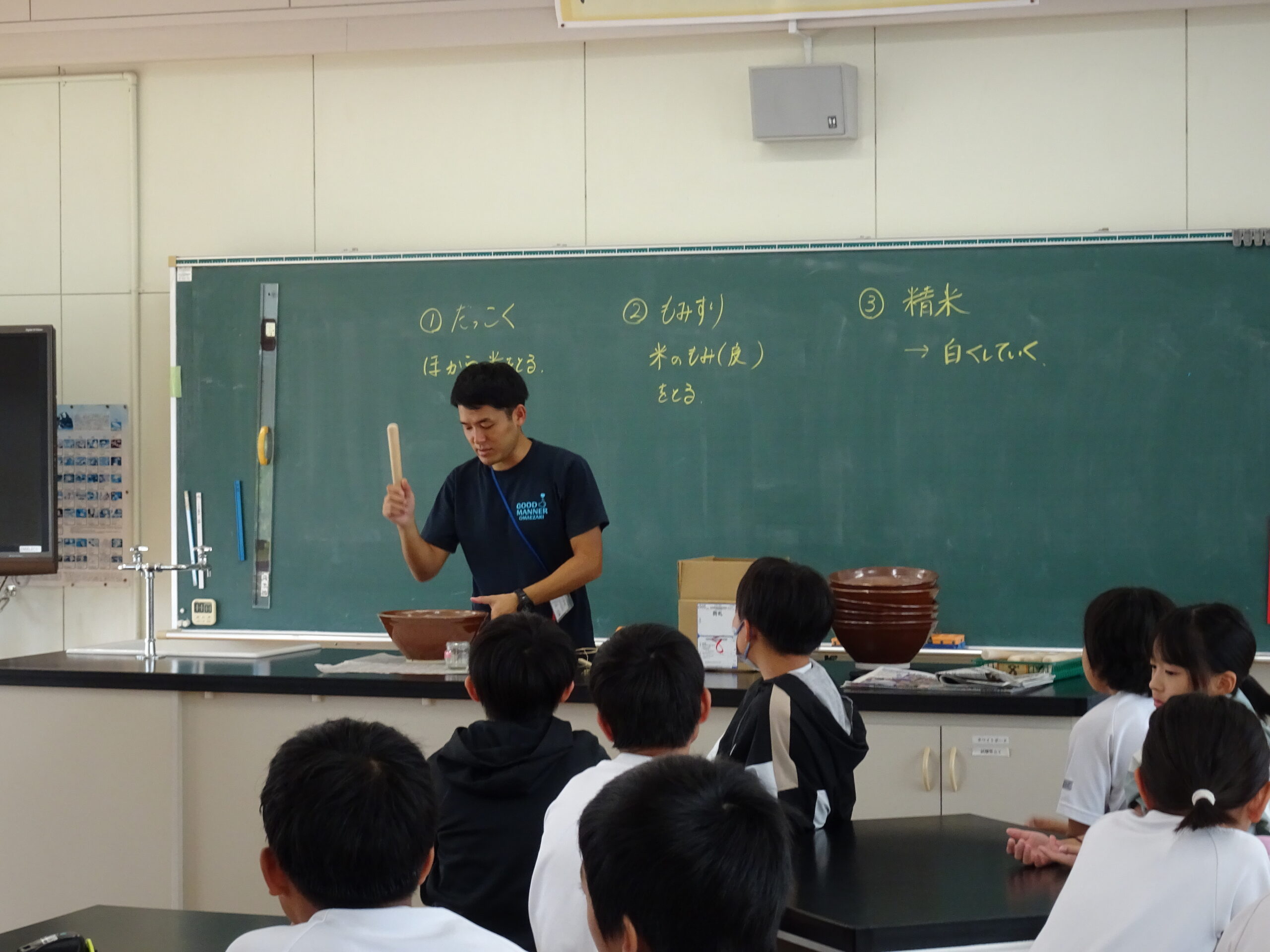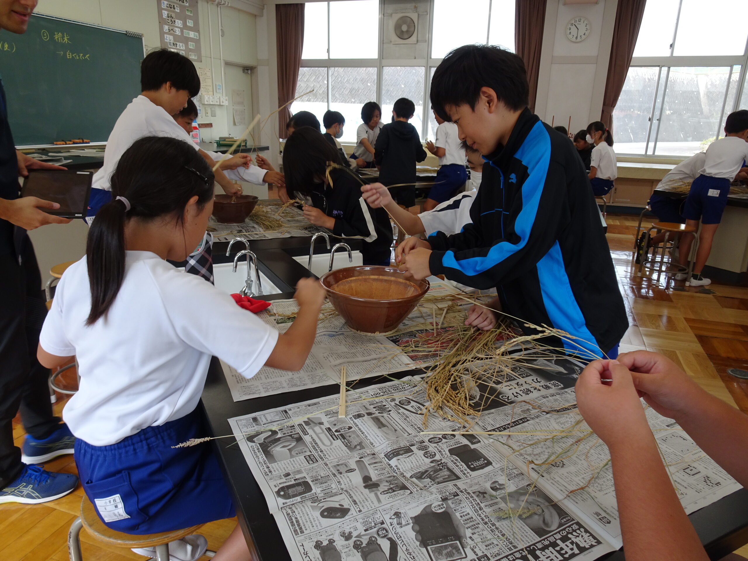 【5年生】「だっこく」「もみすり」って?? 2024/10/15 先日、稲刈りにいってきた5年生が、「だっこく」と「もみすり」に挑戦していました。 私たちが、普段食べているお米は、いろいろな方の苦労によって完成していることを知る良い機会です。今は機械による作業も増えていますが、作業工程を知っていることは、今後学習する歴史の授業にもいきてきますね。