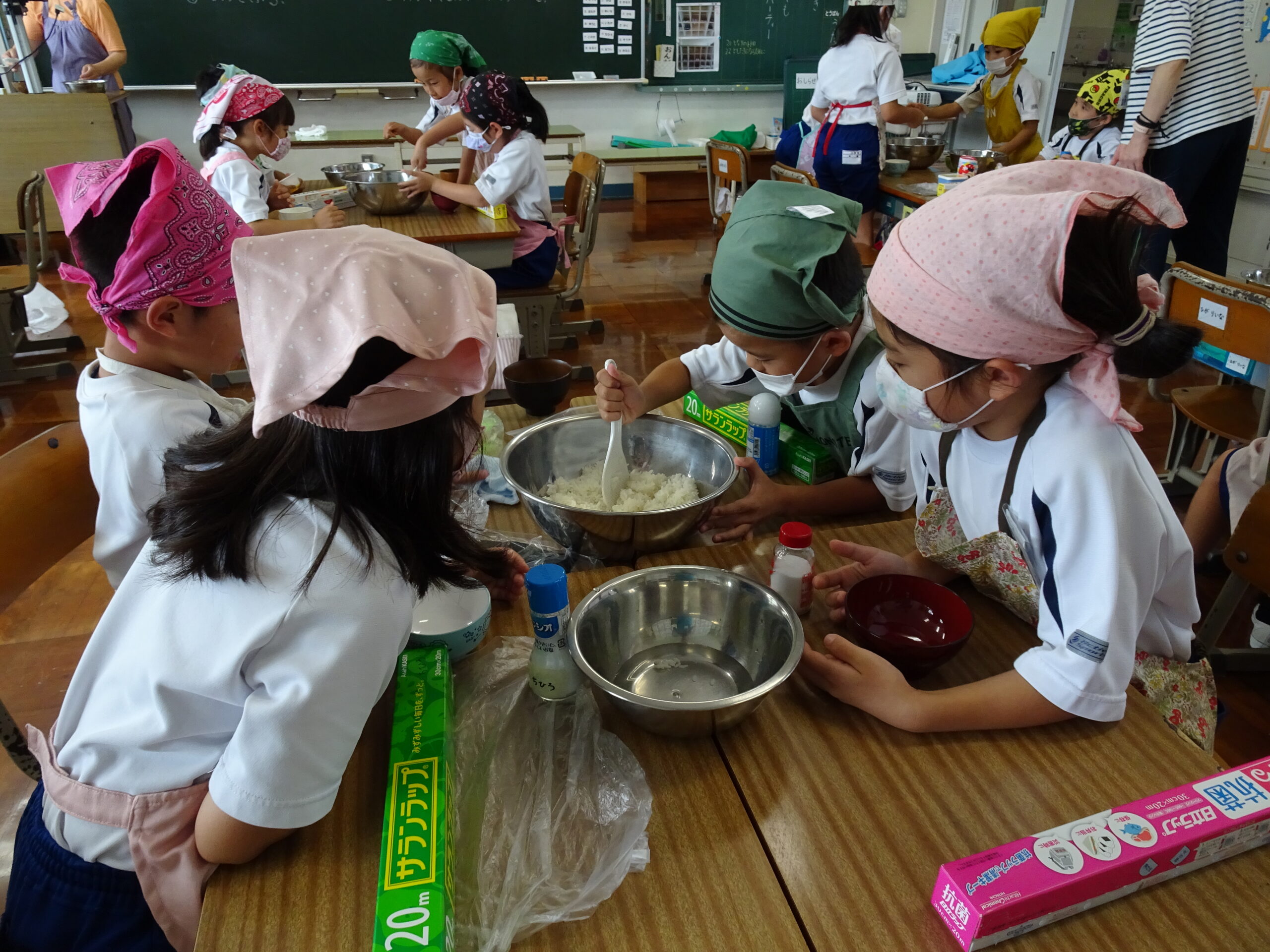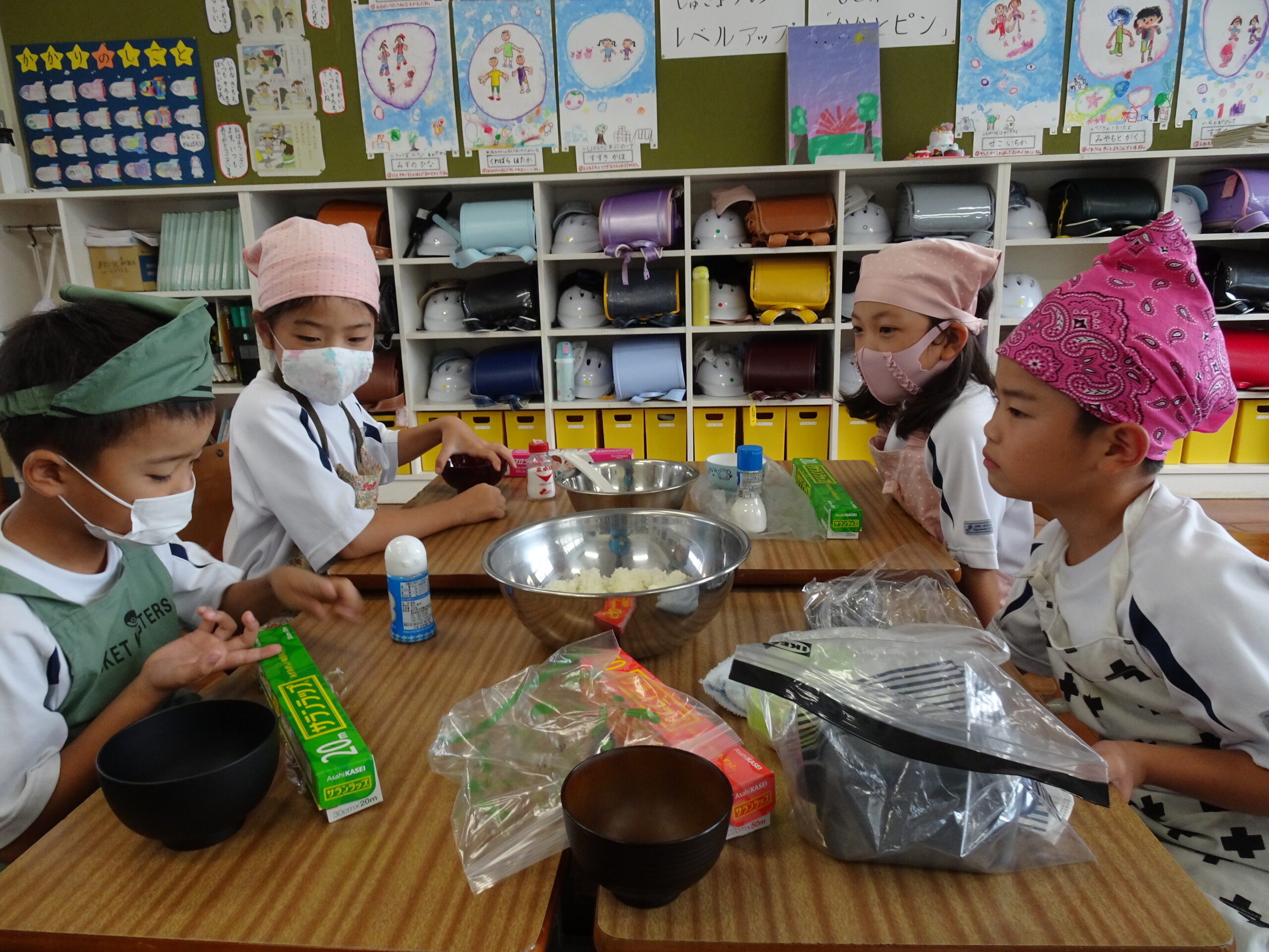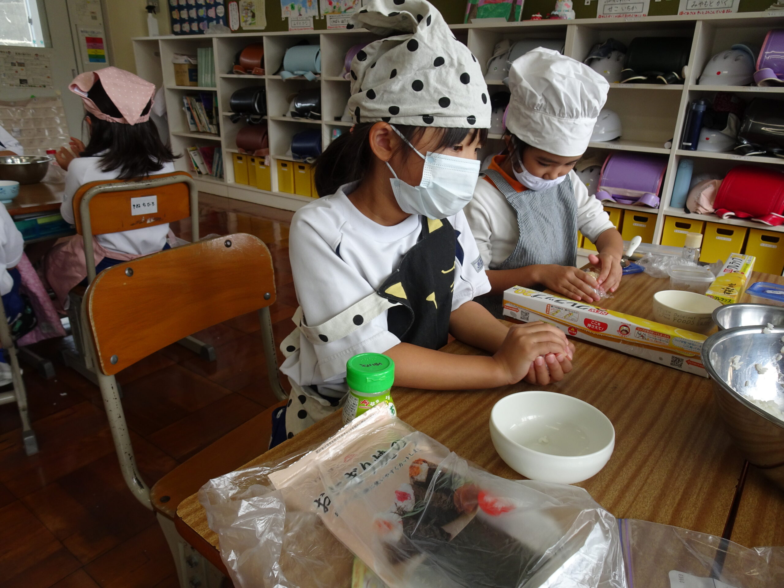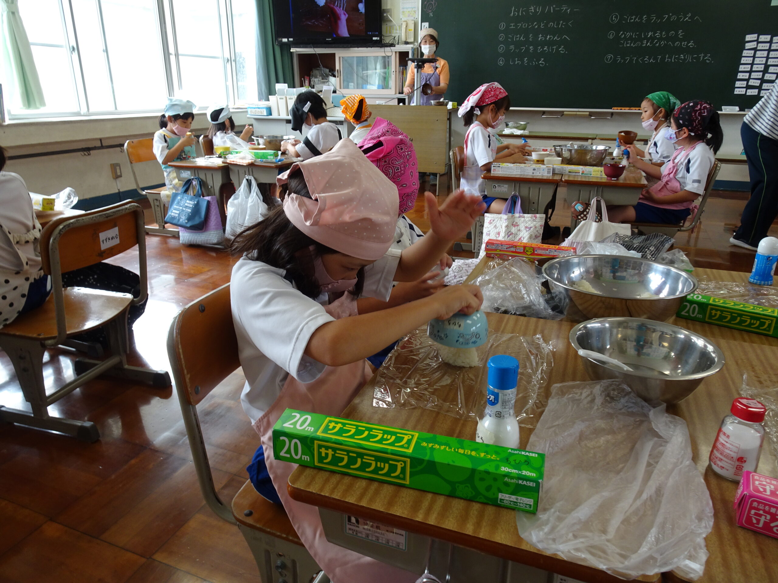 【1年生】おにぎりパーティー!! 2024/10/16 今日は給食がなく、お弁当の日でした。 そこで1年生はおにぎりパーティーを開き、自分のぶんのおにぎりを作りました。「ごはんの良いにおいがしてくる。そのまま食べたいな。」「お塩が出すぎちゃった。」「ラップが四角に切れないよ。」「具を包むのがむずかしいな。」といろいろな声が聞けました。自分でにぎったおにぎりはおいしかったかな?