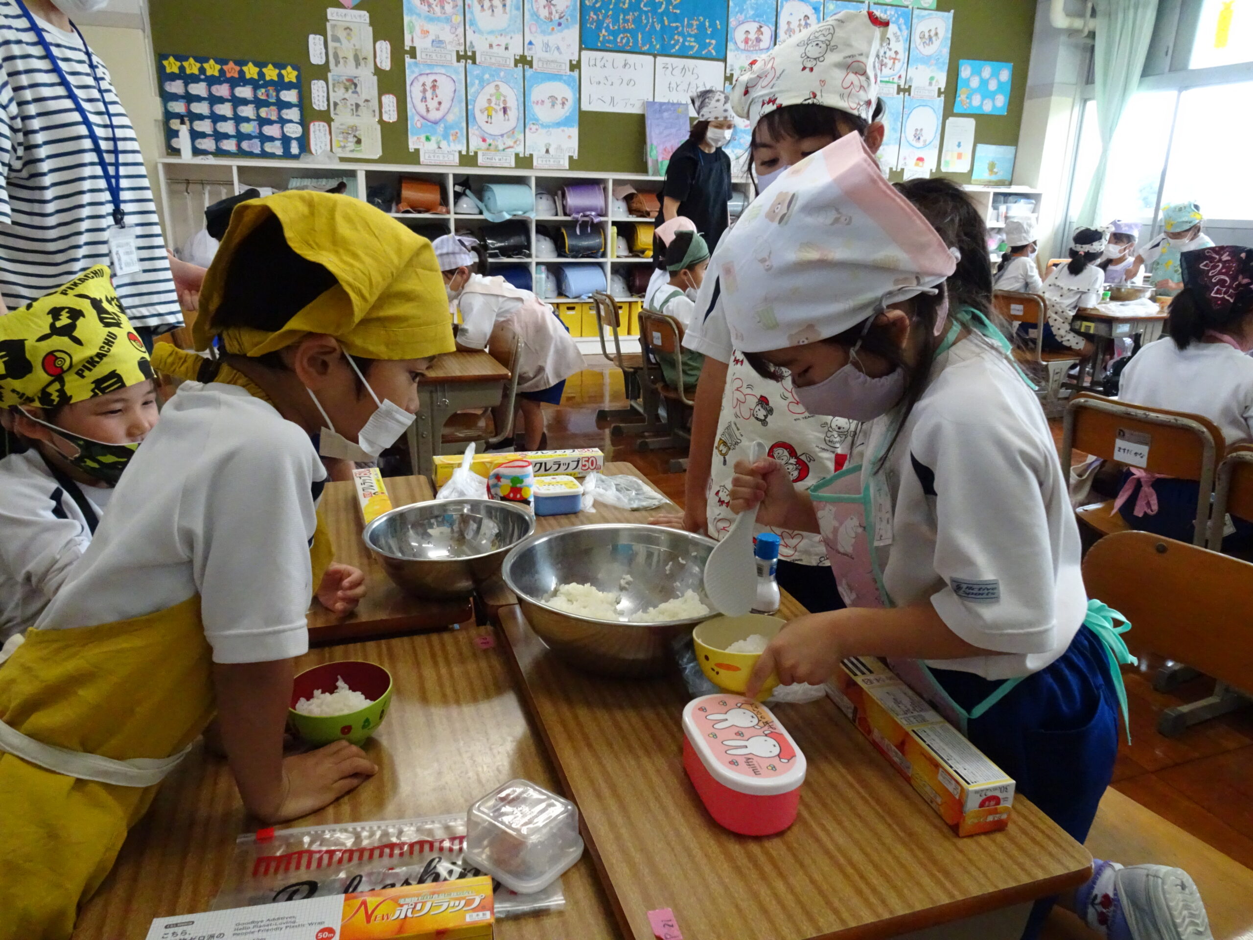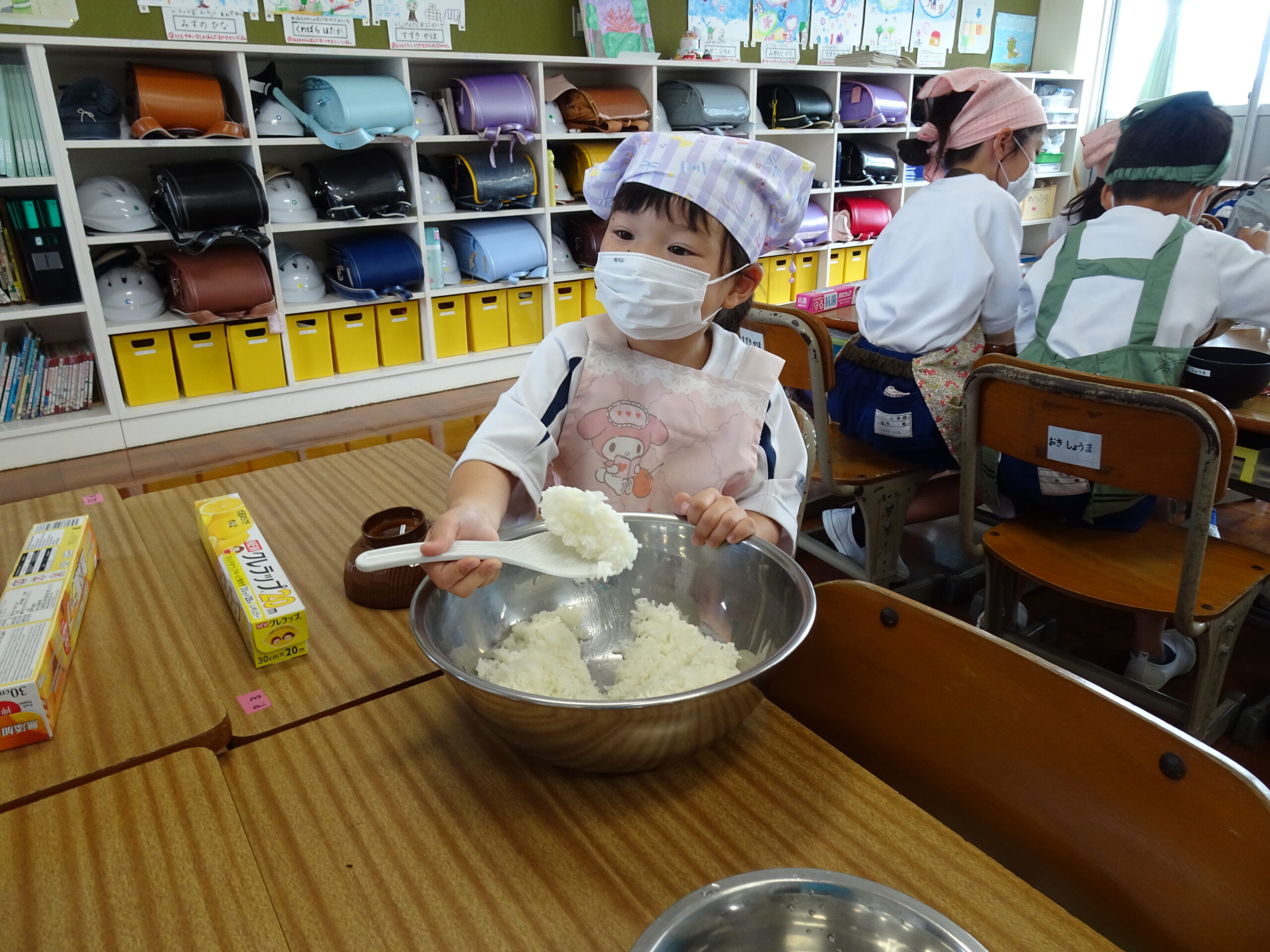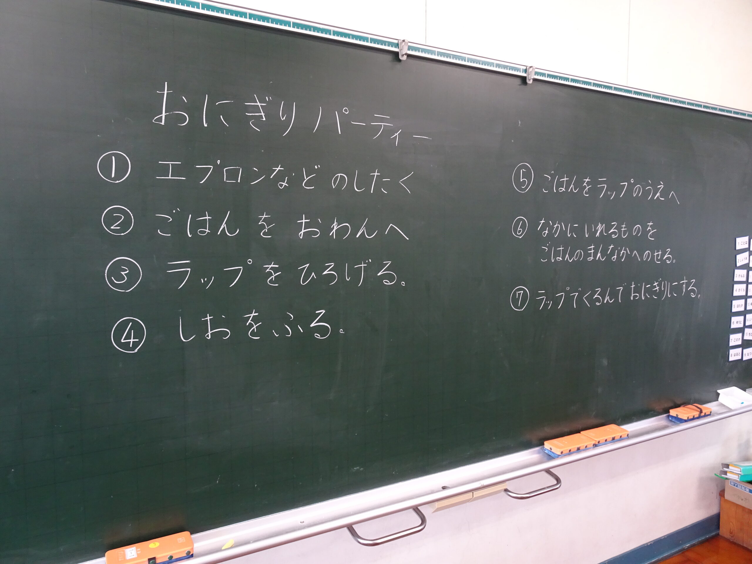 【1年生】おにぎりパーティー!! 2024/10/16 今日は給食がなく、お弁当の日でした。 そこで1年生はおにぎりパーティーを開き、自分のぶんのおにぎりを作りました。「ごはんの良いにおいがしてくる。そのまま食べたいな。」「お塩が出すぎちゃった。」「ラップが四角に切れないよ。」「具を包むのがむずかしいな。」といろいろな声が聞けました。自分でにぎったおにぎりはおいしかったかな?