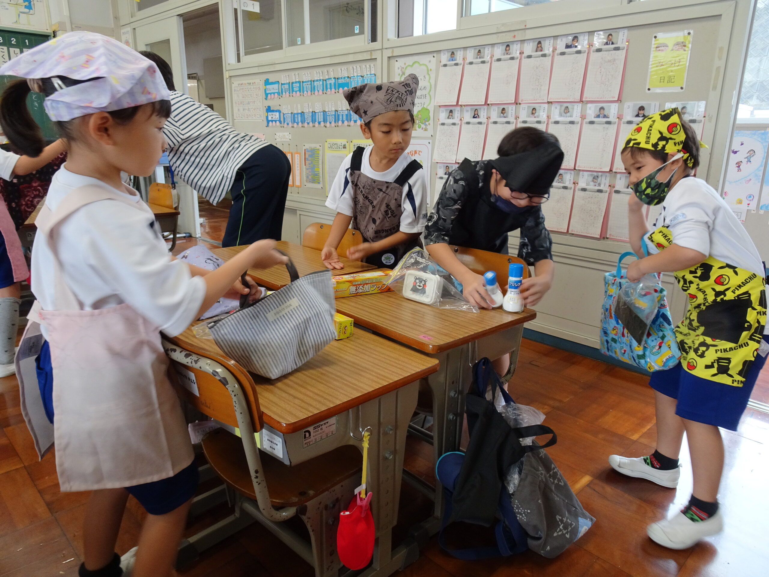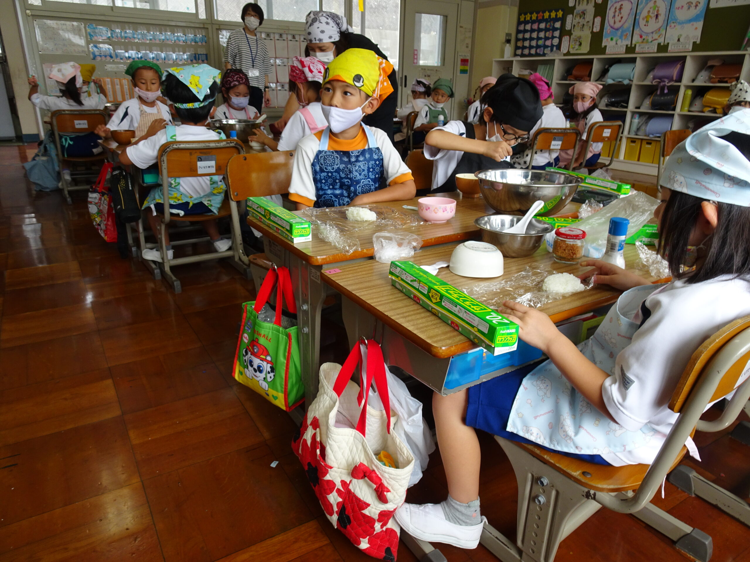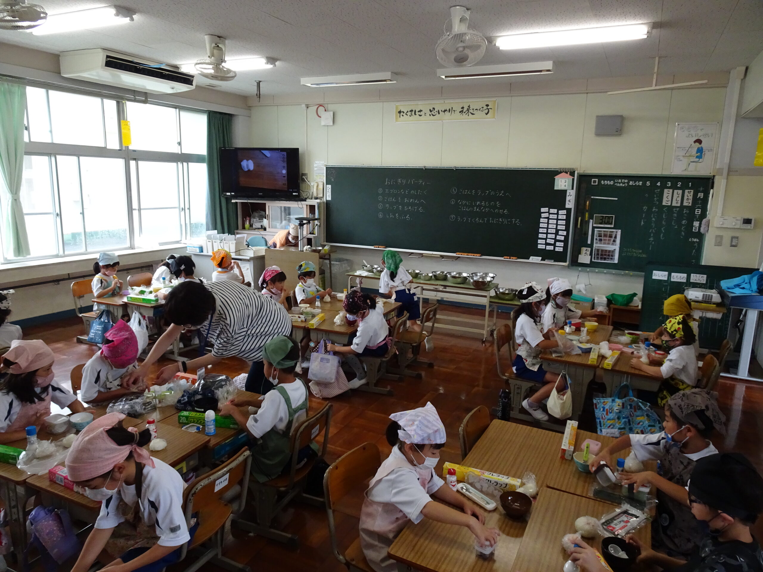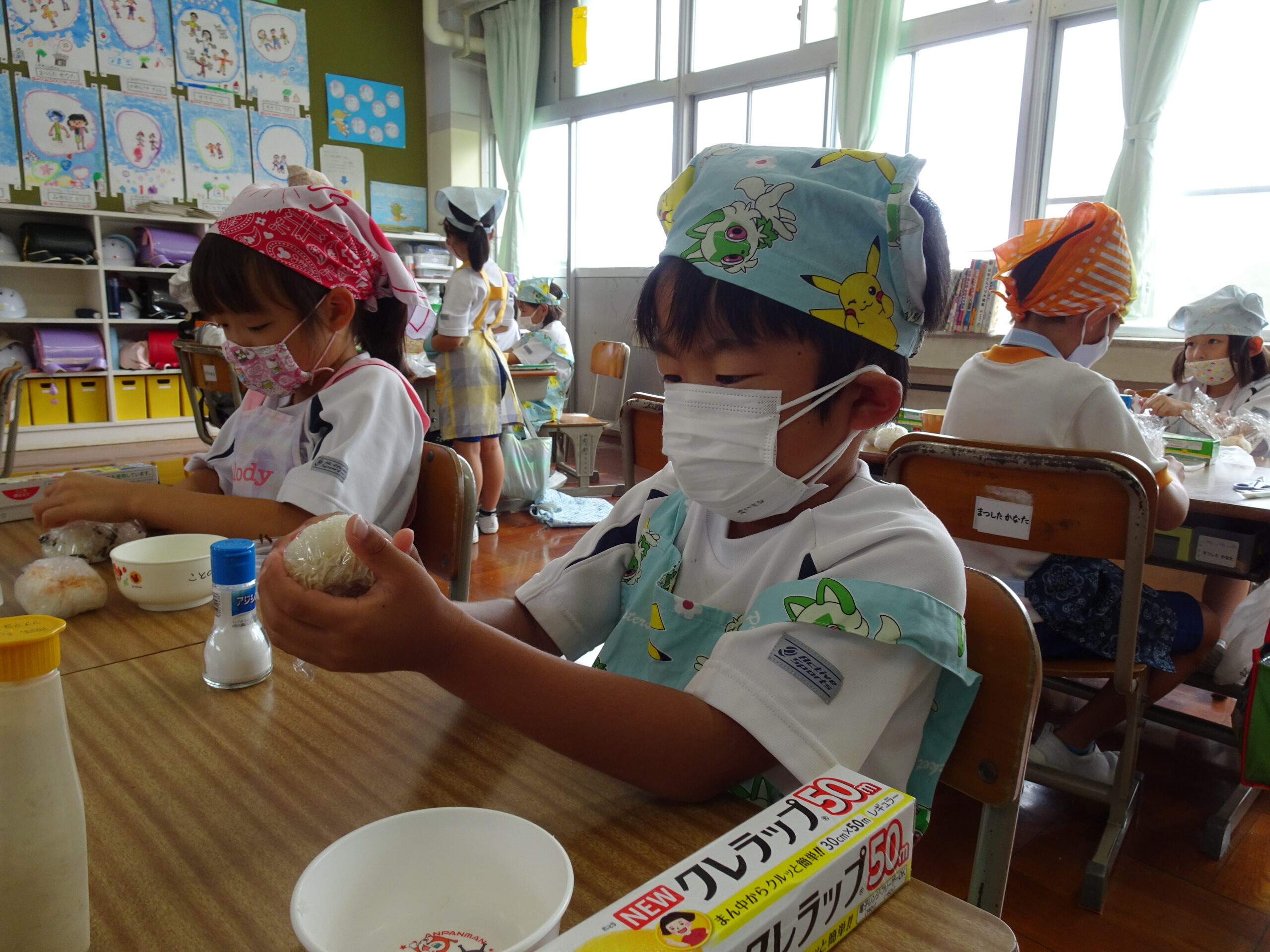 【1年生】おにぎりパーティー!! 2024/10/16 今日は給食がなく、お弁当の日でした。 そこで1年生はおにぎりパーティーを開き、自分のぶんのおにぎりを作りました。「ごはんの良いにおいがしてくる。そのまま食べたいな。」「お塩が出すぎちゃった。」「ラップが四角に切れないよ。」「具を包むのがむずかしいな。」といろいろな声が聞けました。自分でにぎったおにぎりはおいしかったかな?