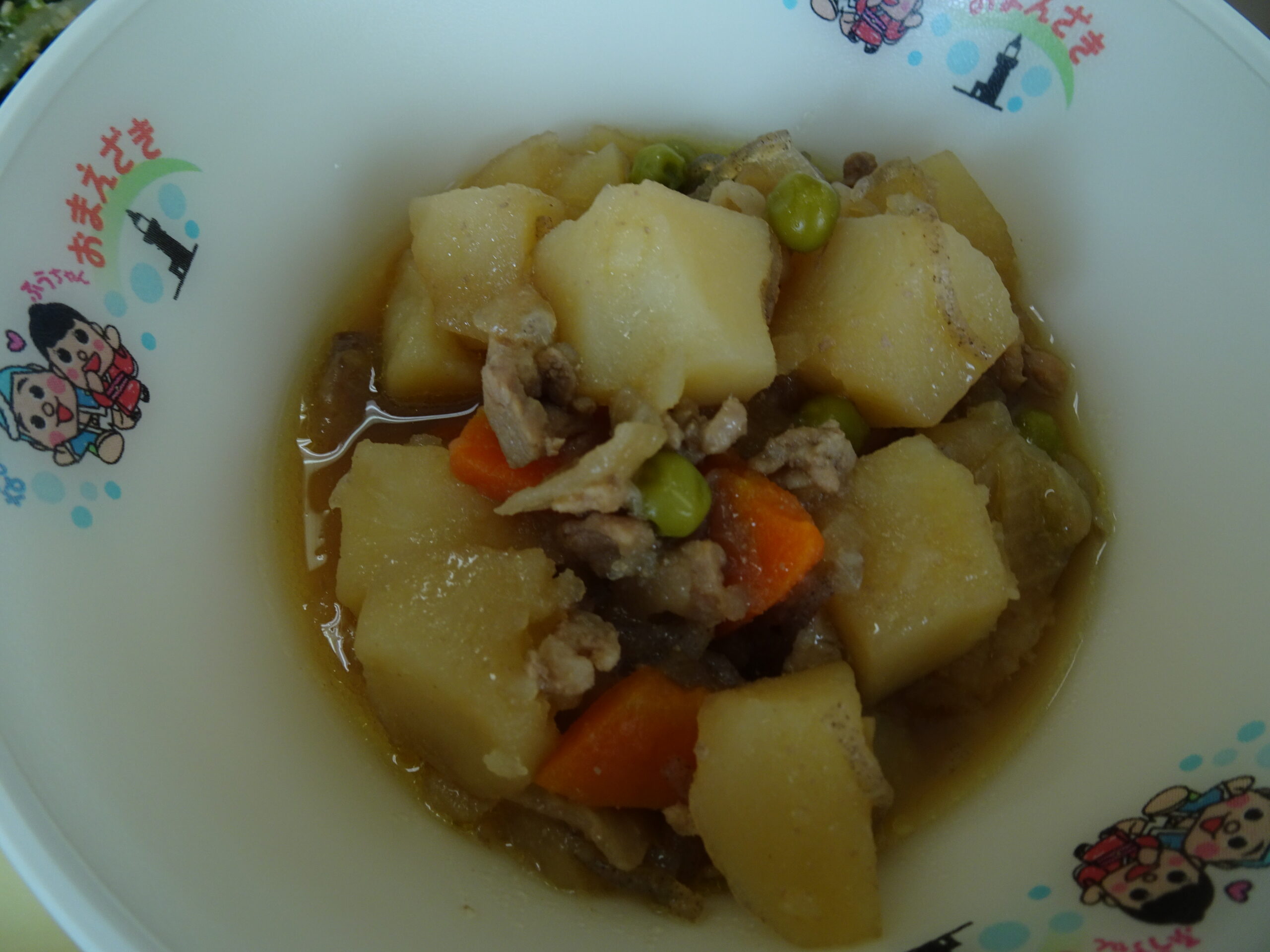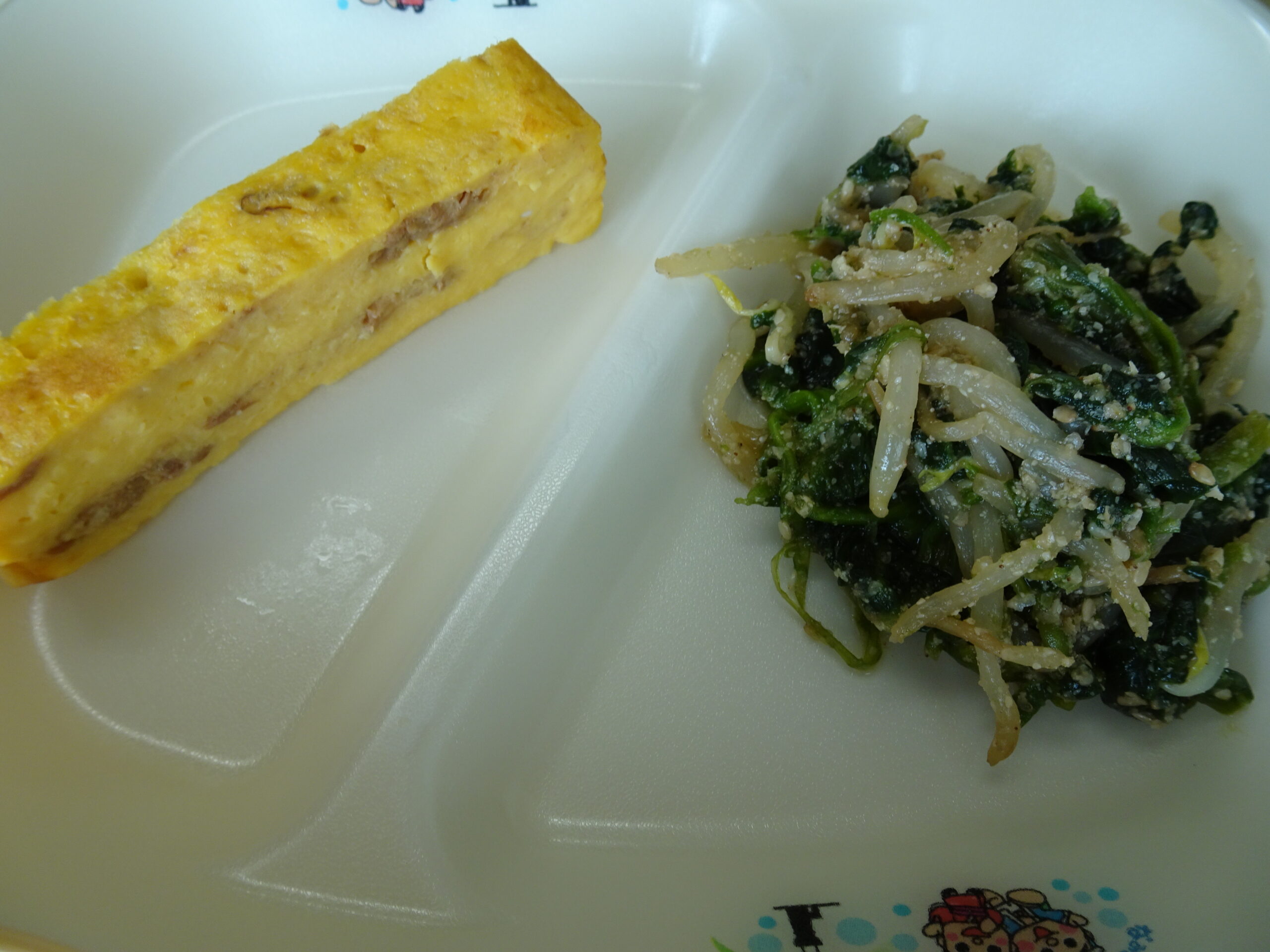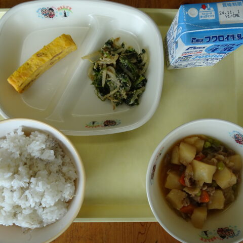 今日の給食は、ふるさと給食でした。メニューは、しらすごはん、牛乳、ツナ入り厚焼きたまご、肉じゃが、ほうれん草のごまあえです。