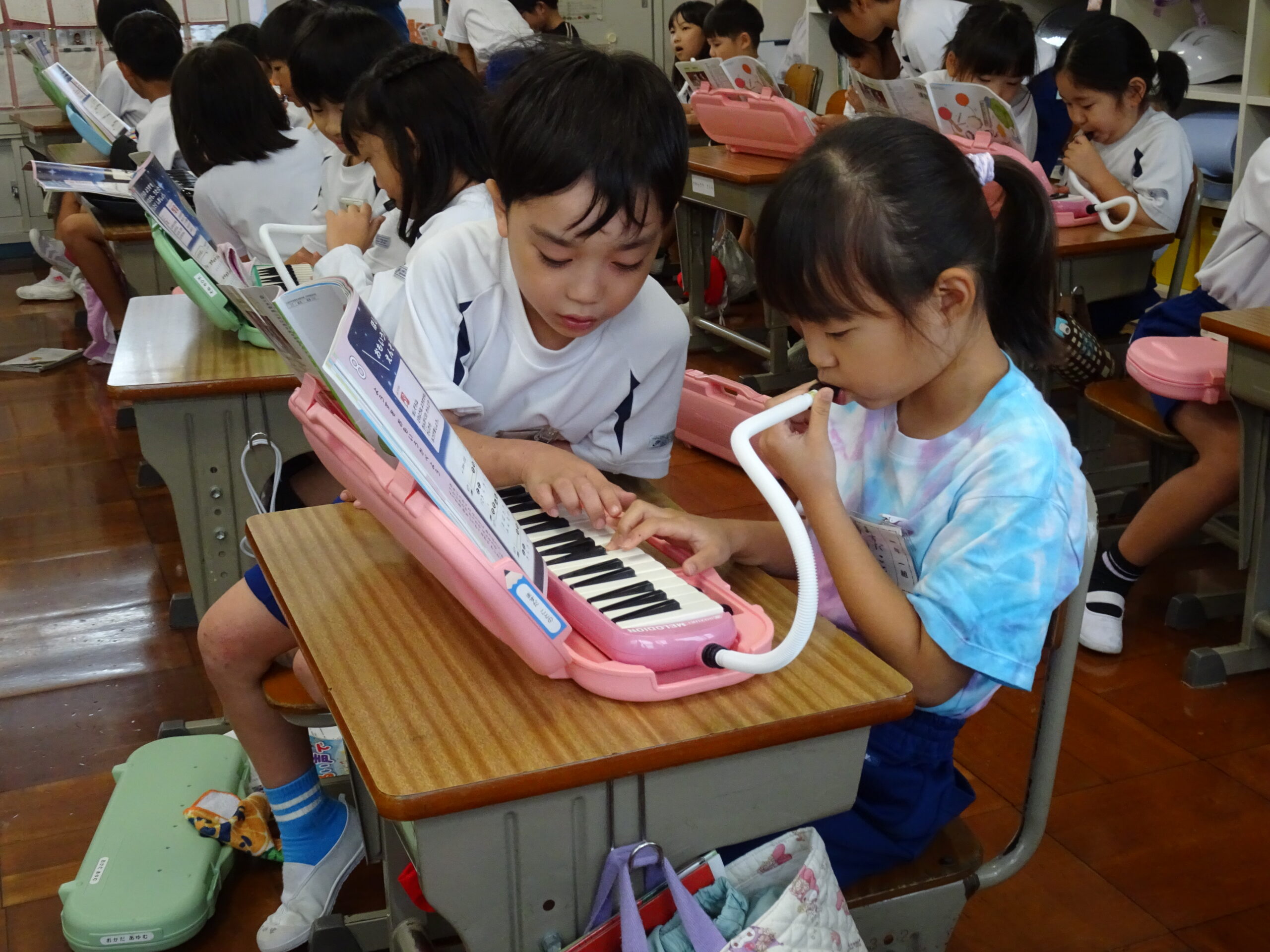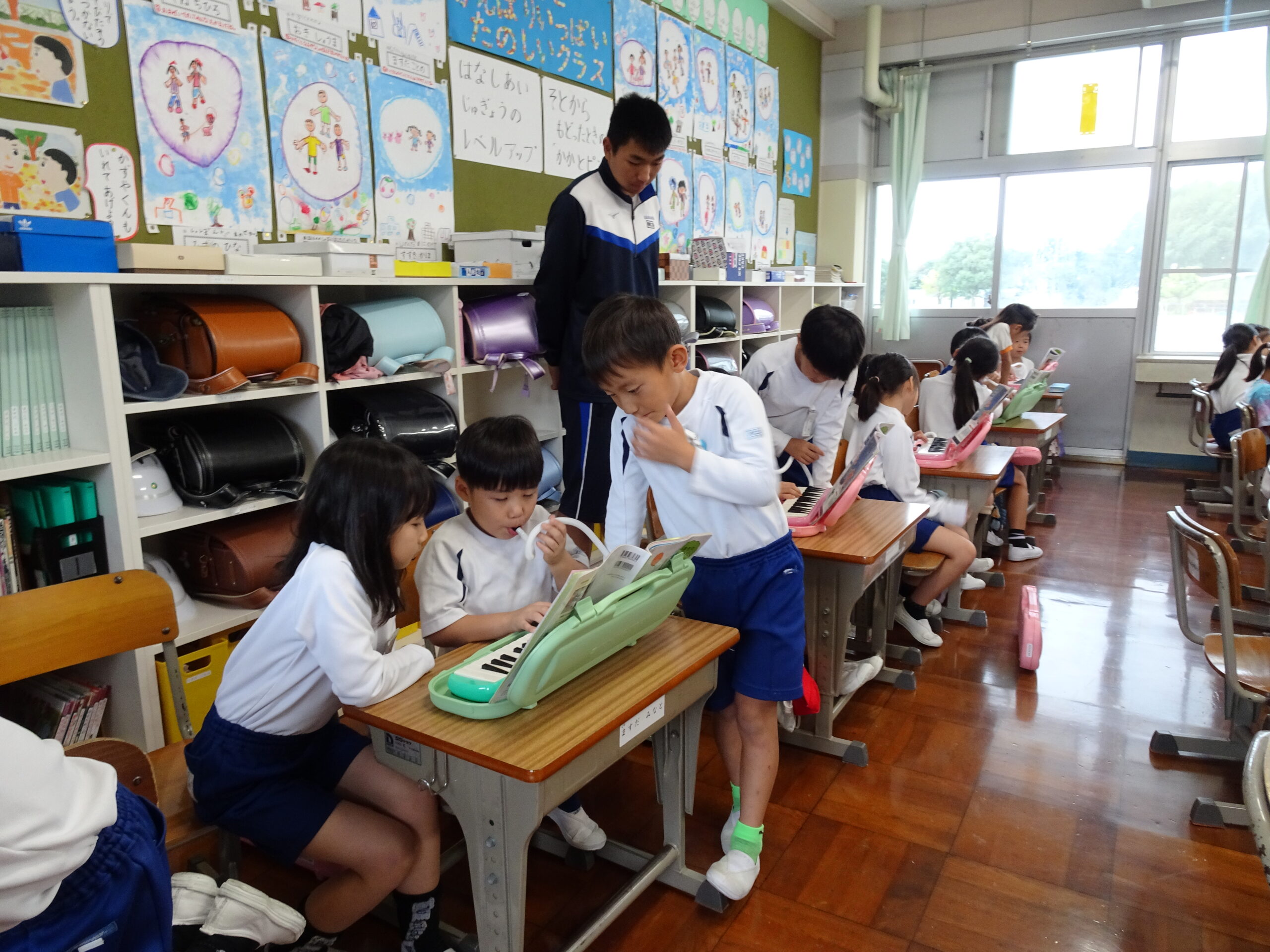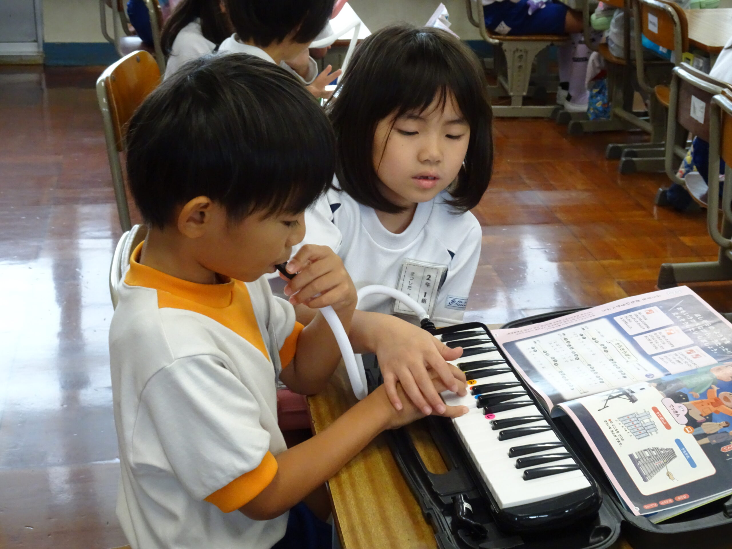 1年生が音楽の授業で、けんばんに挑戦しました。今日は、2年生が1年生の教室に来てくれて、一緒に練習してくれました。