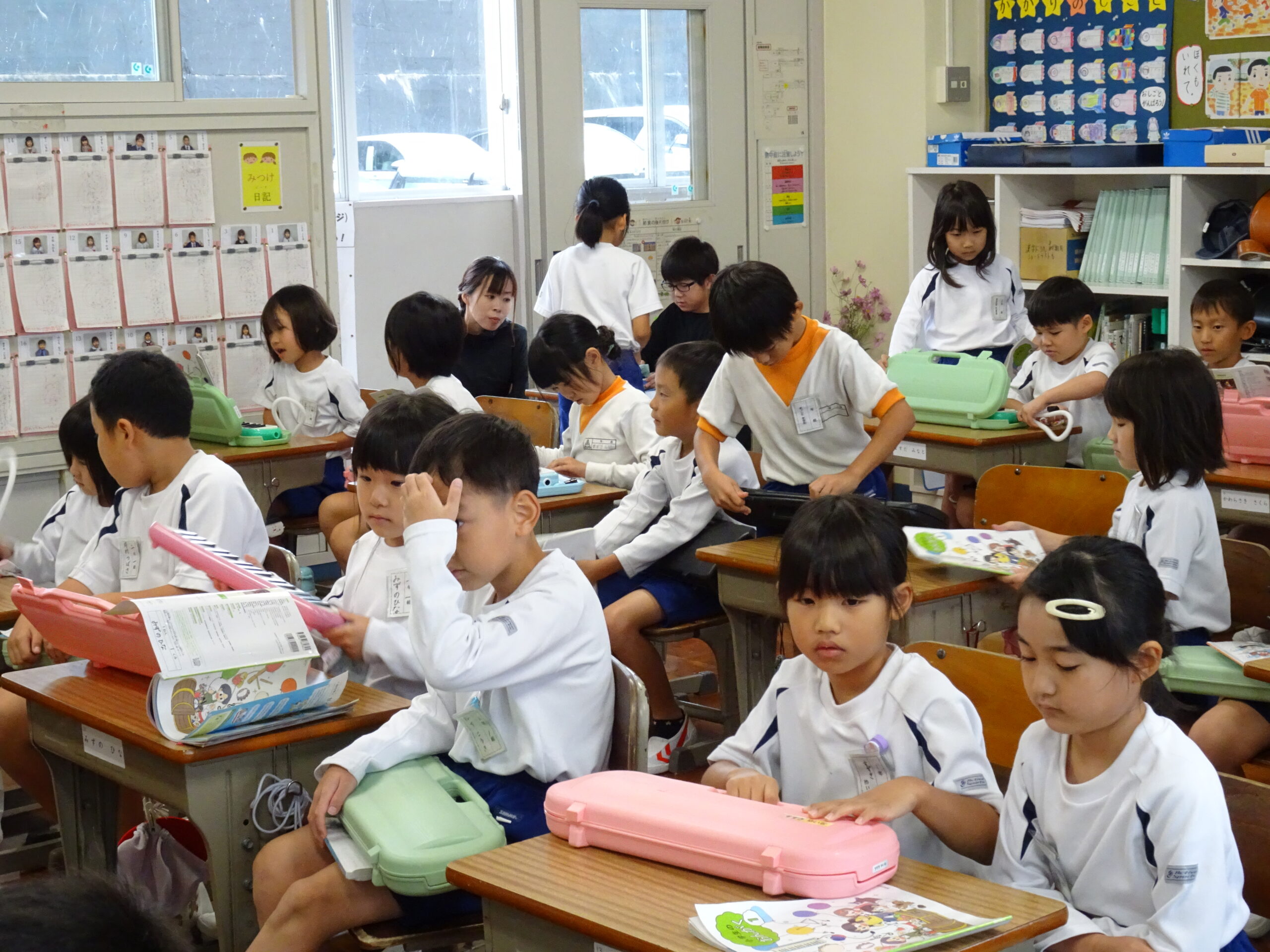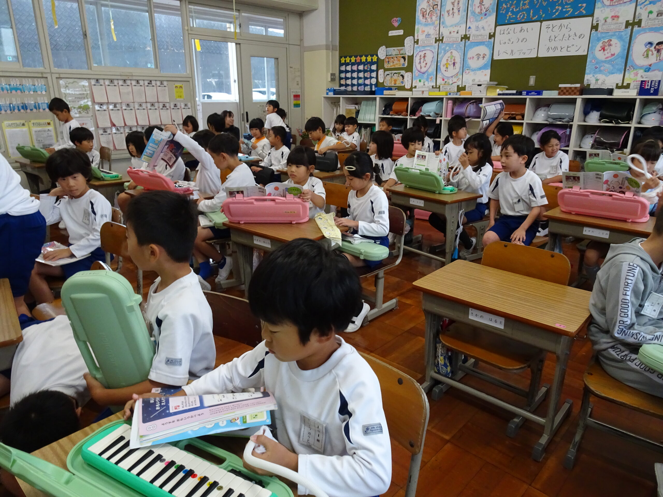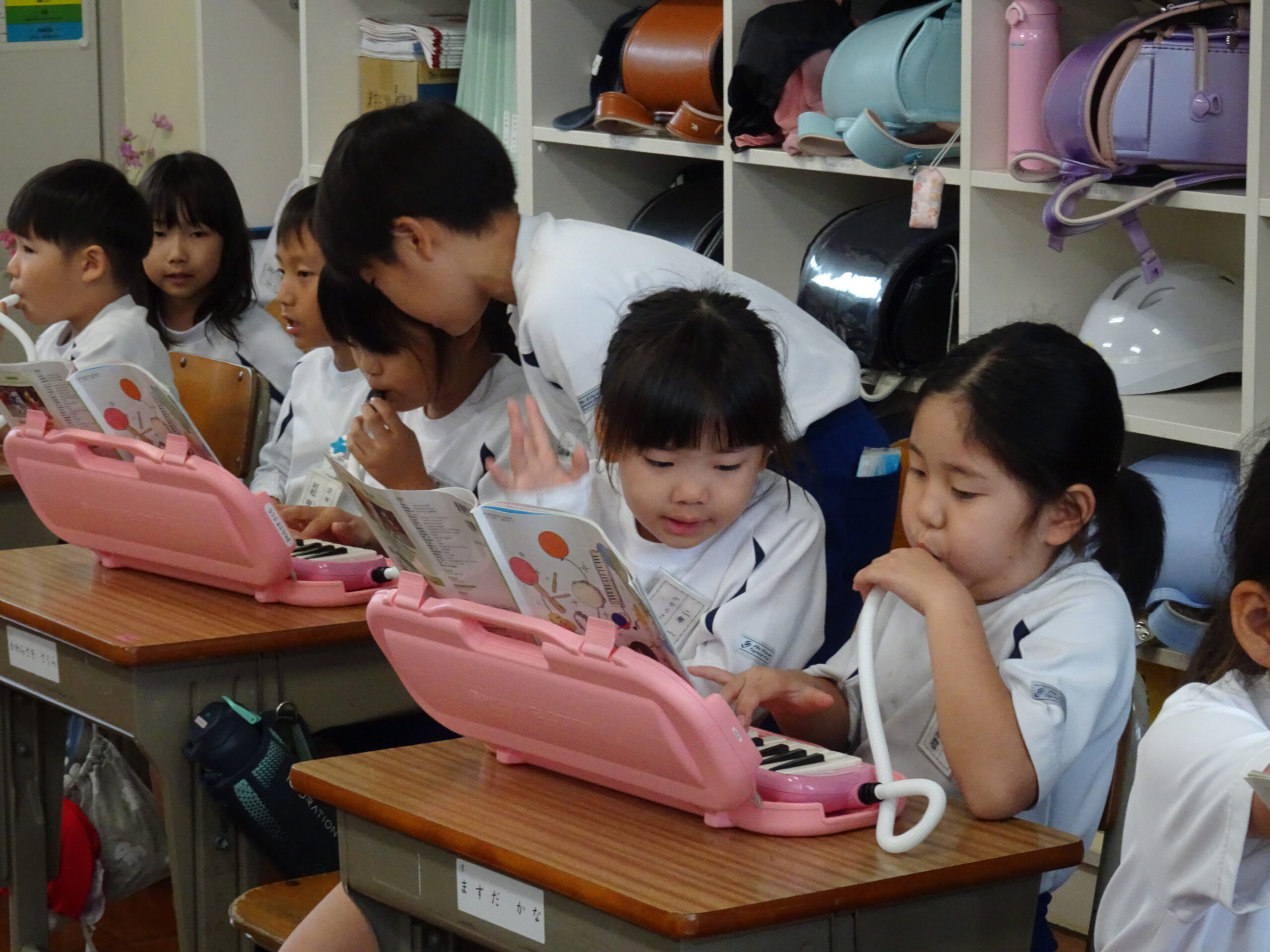 1年生が音楽の授業で、けんばんに挑戦しました。今日は、2年生が1年生の教室に来てくれて、一緒に練習してくれました。