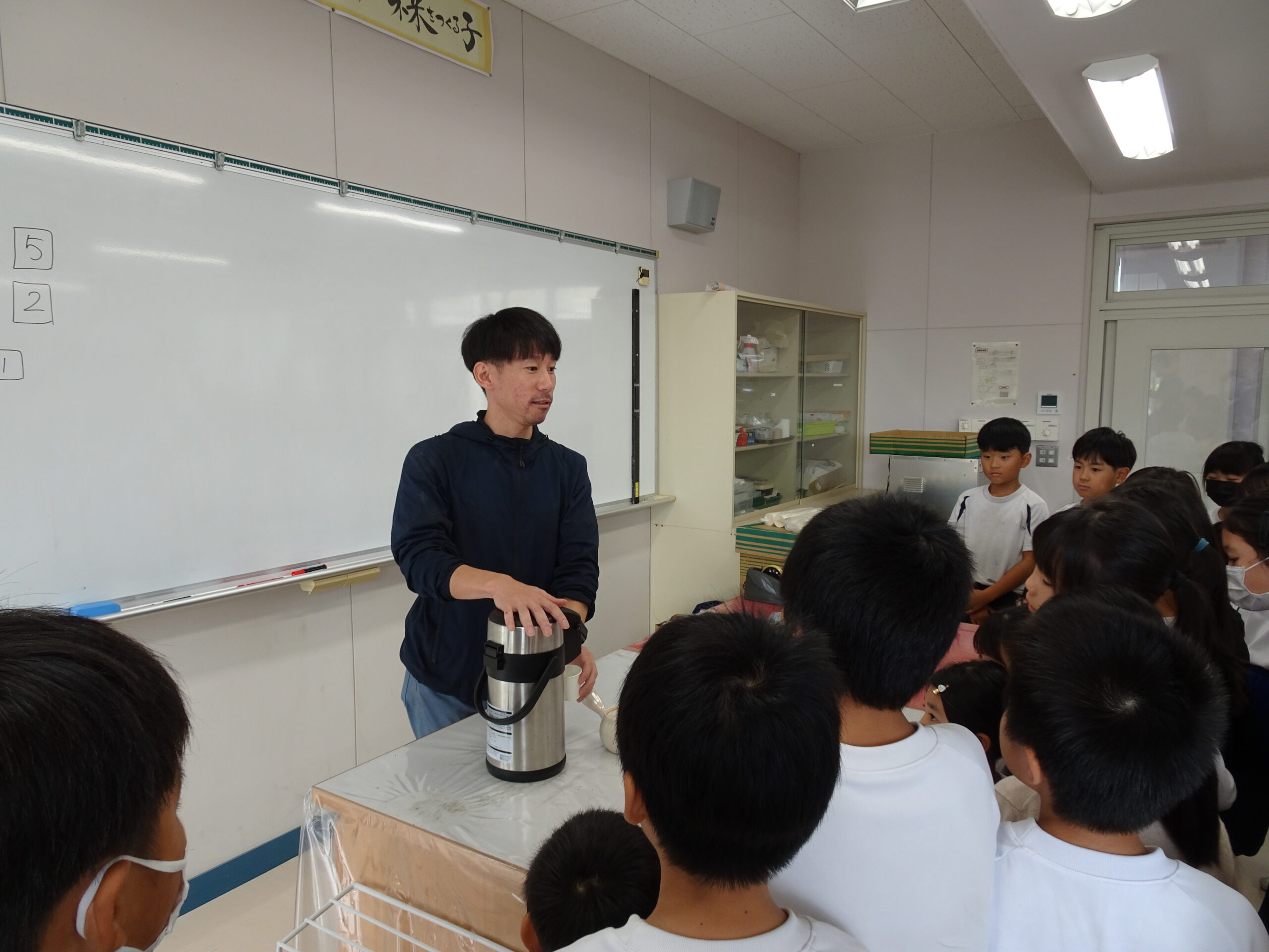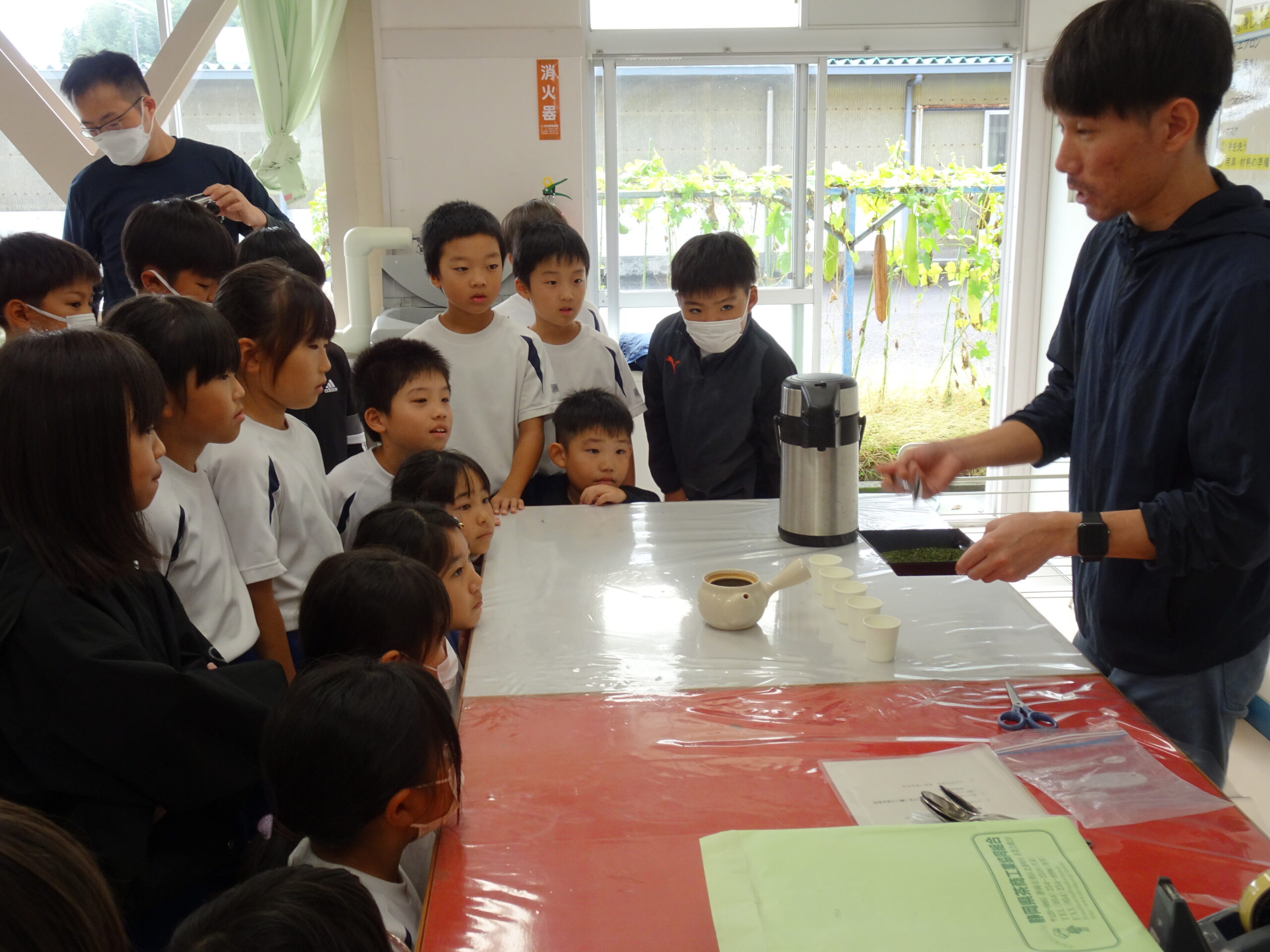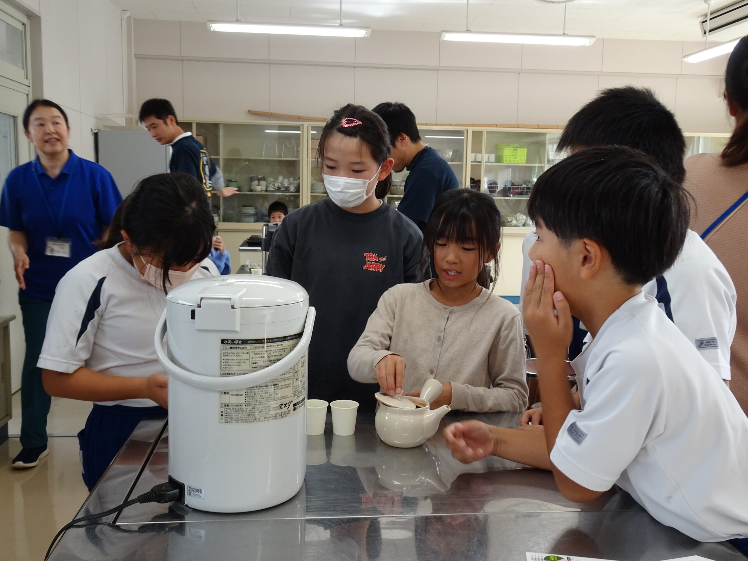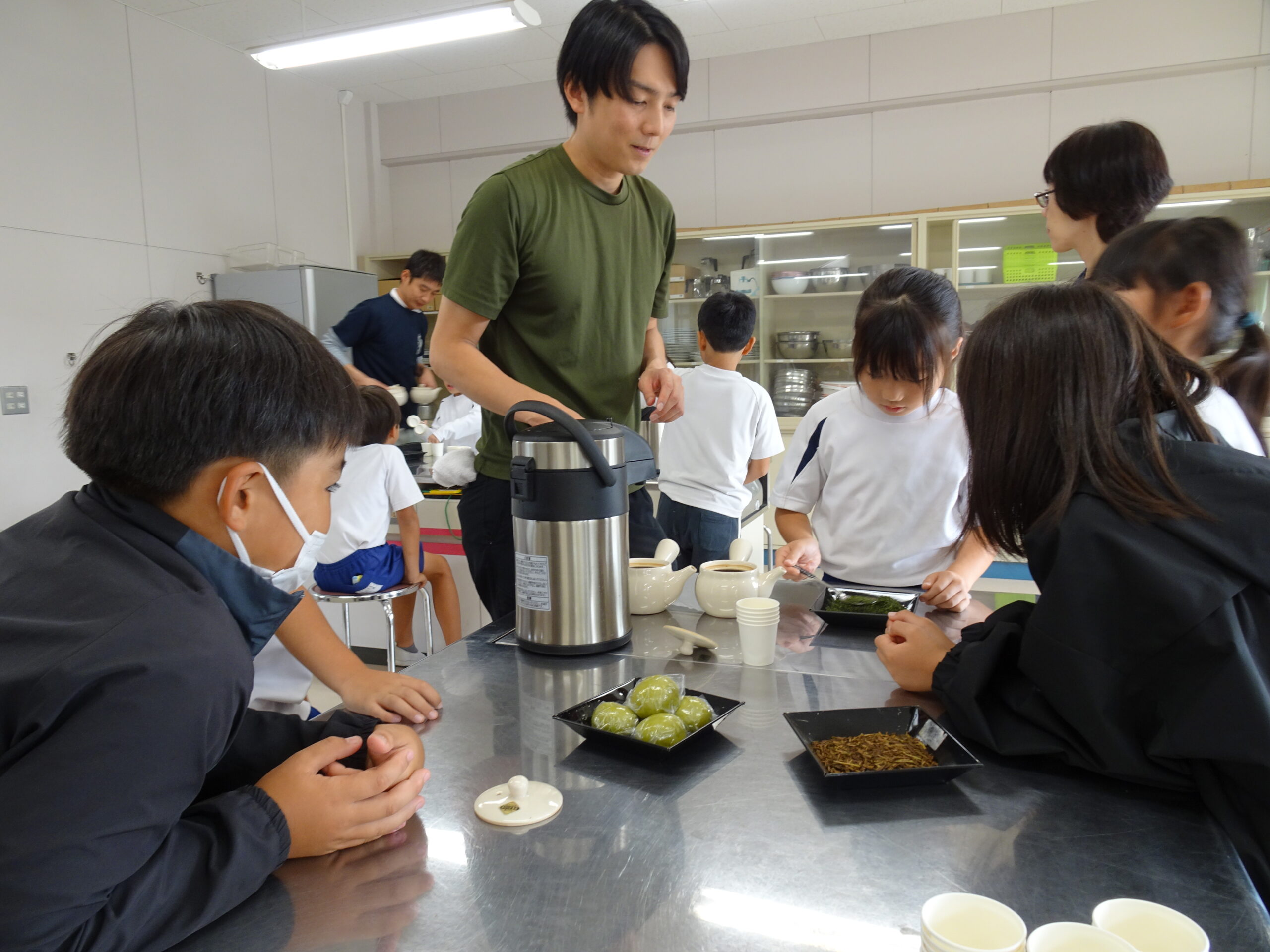 【3年生】お茶の入れ方教室 2024/10/30 3年生がお茶の入れ方を勉強しました。 小笠茶商青年団の皆さんが来てくれて、お茶の入れ方を説明してくれました。初めて知ることが多かったですね。 5種類のお茶の飲み比べはどうでしたか? 抹茶のあんこが入ったおまんじゅうもおいしかったですね。