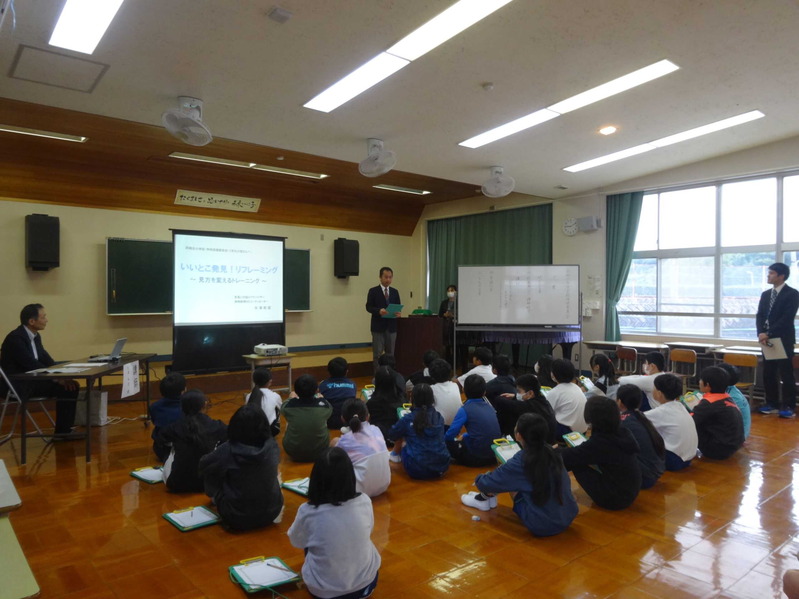 【5年生】学校保健委員会 2024/11/14 今日は、全学年とも授業参観がおこなわれました。5年生はおうちの方と一緒に、静岡新聞NIEコーディネーターの矢澤和宏先生に「いいとこ発見!リフレーミング~見方を変えるトレーニング~」というテーマで話をしていただきました。プラス言葉の効果等を教えていただき、見方を変えるトレーニングもやりました。 5年生の話を聴く様子がすばらしく、お礼の言葉をのべた3人も堂々と話せていました。明日からプラス言葉でいっぱいにしましょう。
