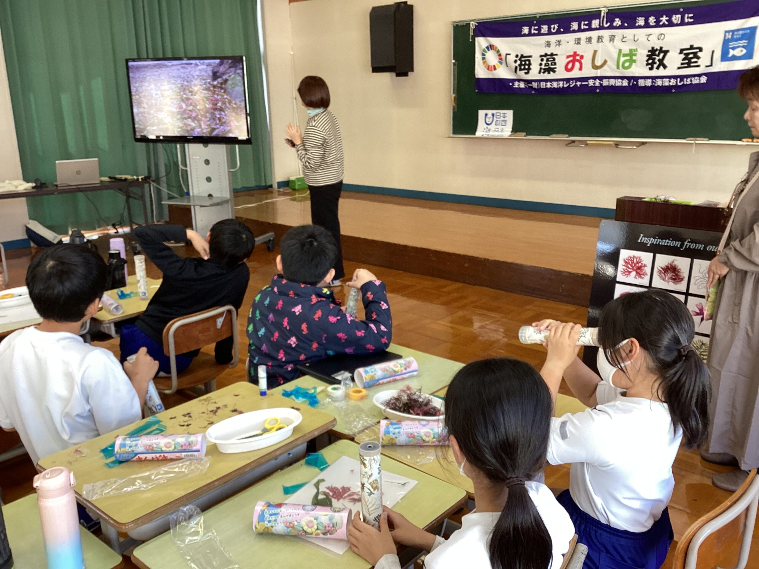 4年生が海藻を使った万華鏡作りに挑戦しました。講師の方々に作り方を教わり、思い思いの海藻をいれてオリジナルの万華鏡を完成させました。