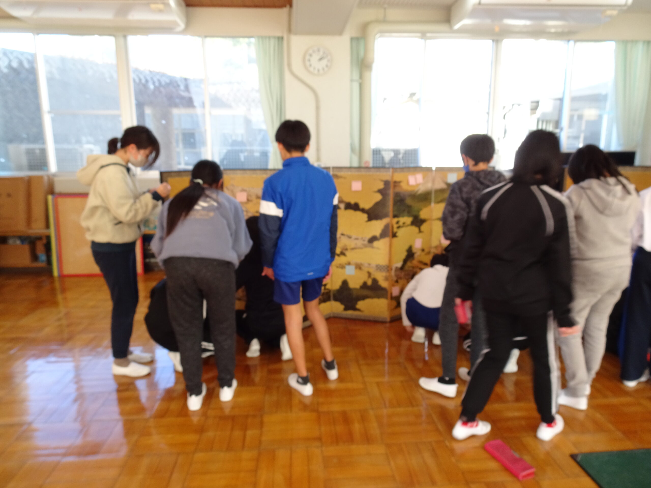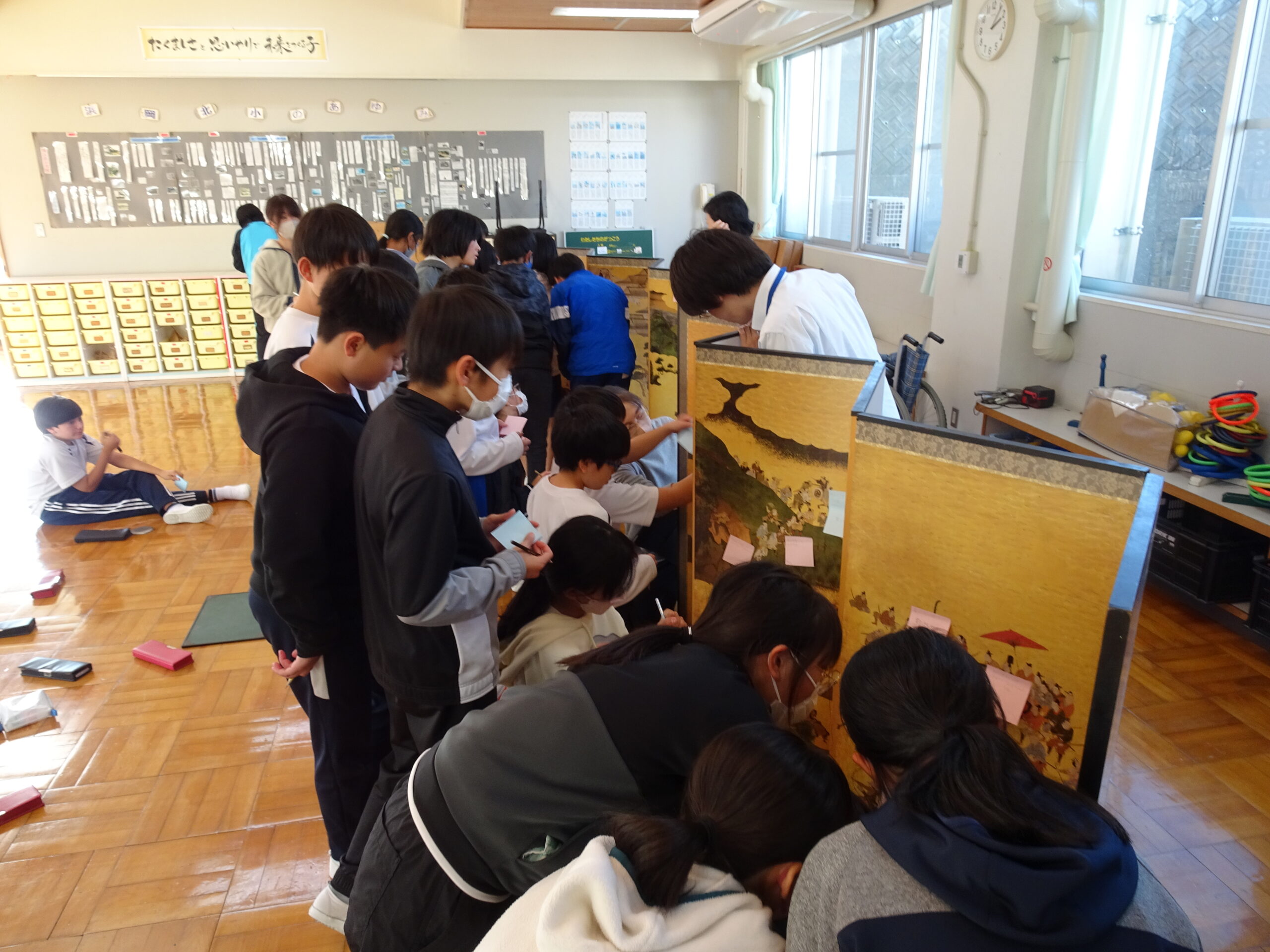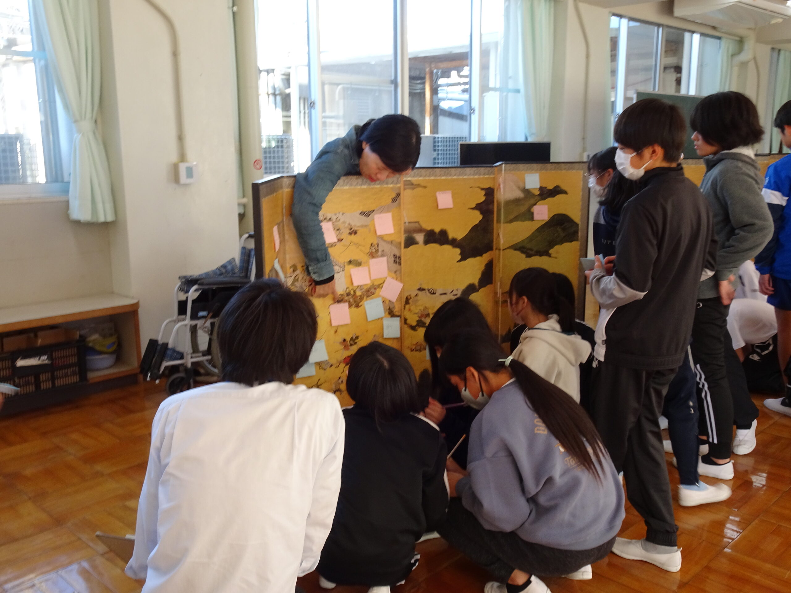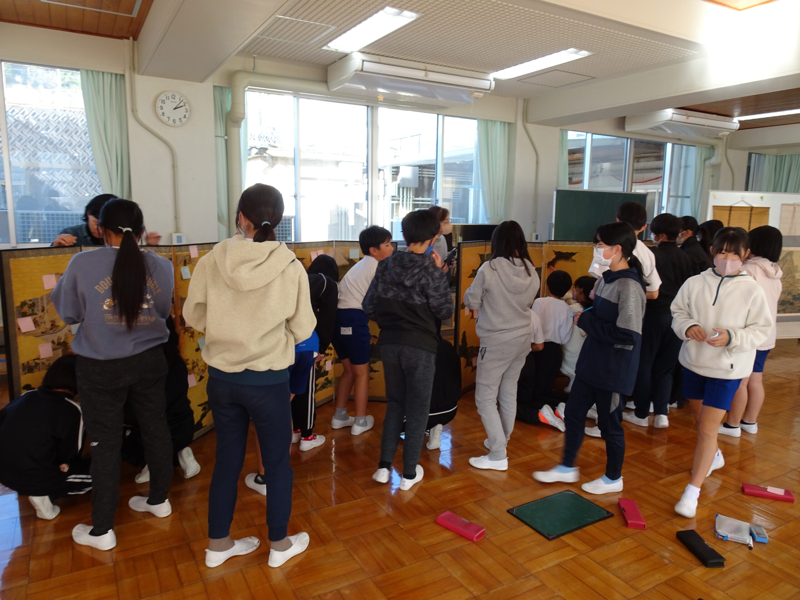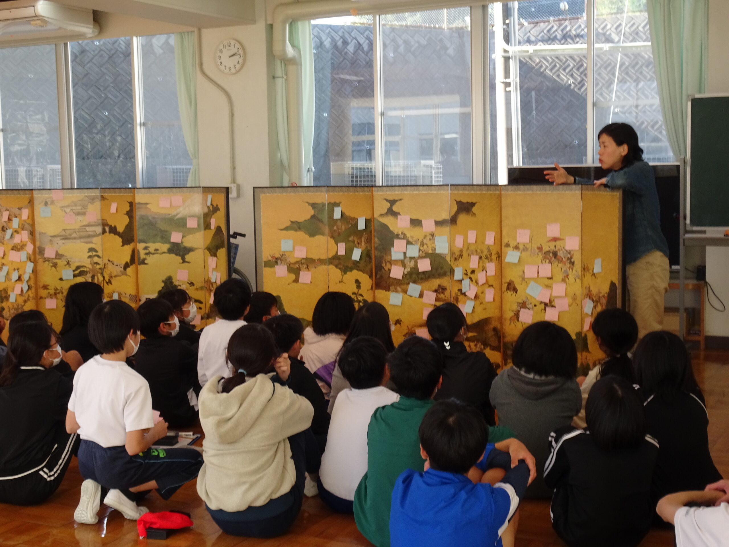 【6年生】県立美術館出張美術講座がありました 2024/11/29 今日の5・6時間目に、静岡県立美術館からお二人の方が出張美術講座に来てくれました。 屏風と掛け軸の違いや「曽我物語」の屏風を使って、屏風絵の特徴を教えてもらいました。右から左に進むにしたがって時間が進むように描かれているというのは驚きでしたね。 実物を目にすると発見も多いです。6年生のみんなが発見したことがいっぱいで、屏風がふせん紙でいっぱいになっていました。