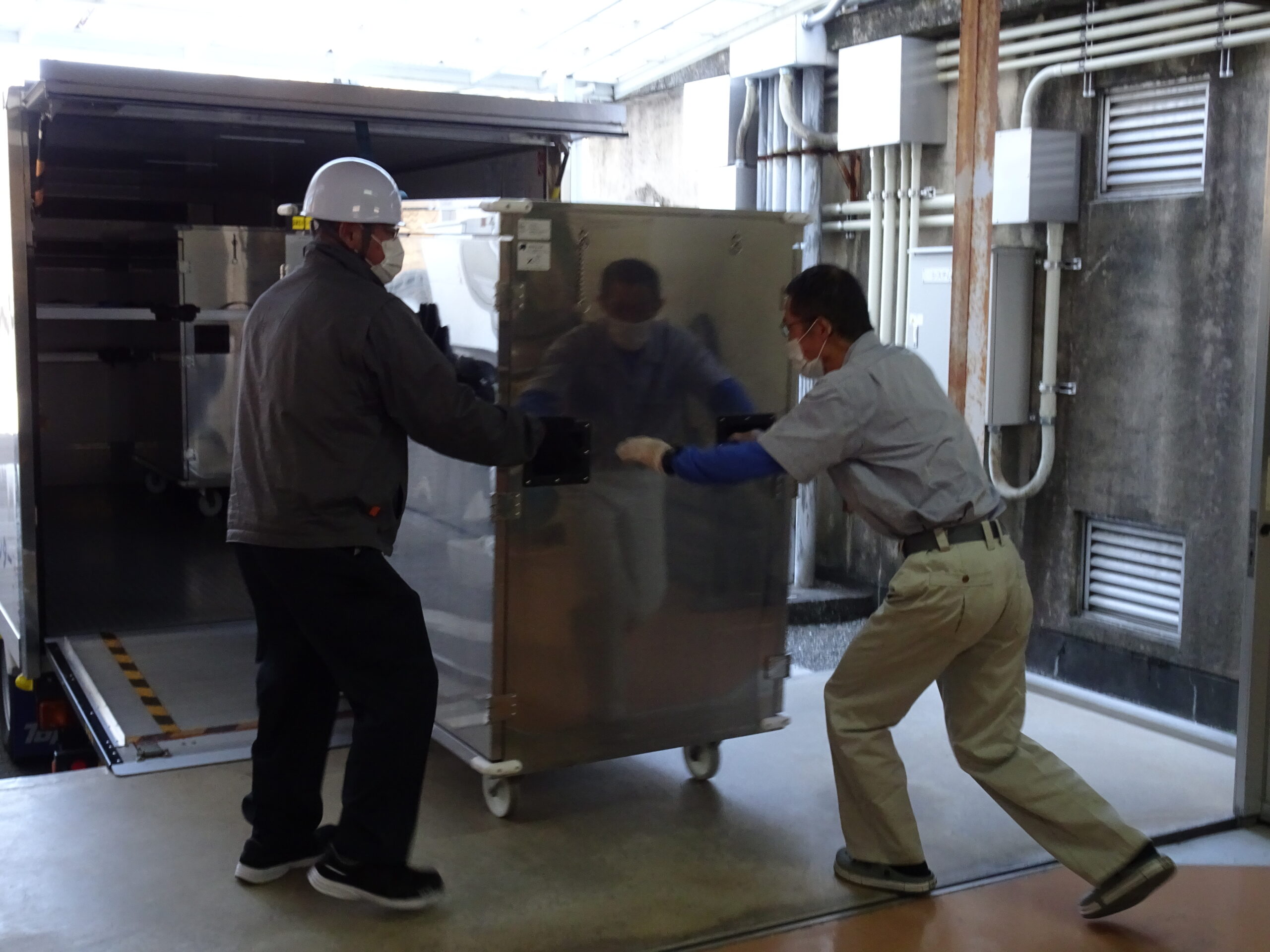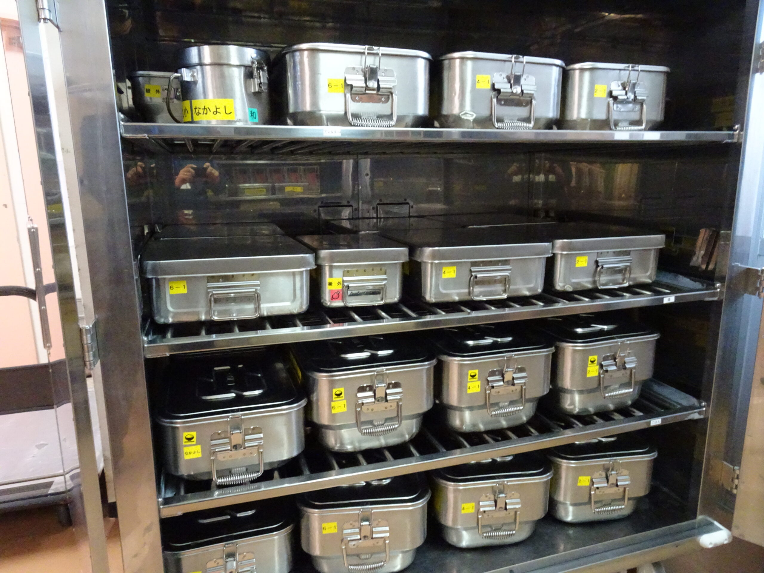 給食受入室の中 2024/12/02 みんなが食べる給食は、このように届けられています。みんながのぞくことはない、給食受入室はこんな様子です。 給食センターから届いた給食を、用務員の増田さんが各クラスに分けてくれています。 いろいろな人たちが支えてくれている給食です。ありがとうの気持ちをもって食べたいですね。