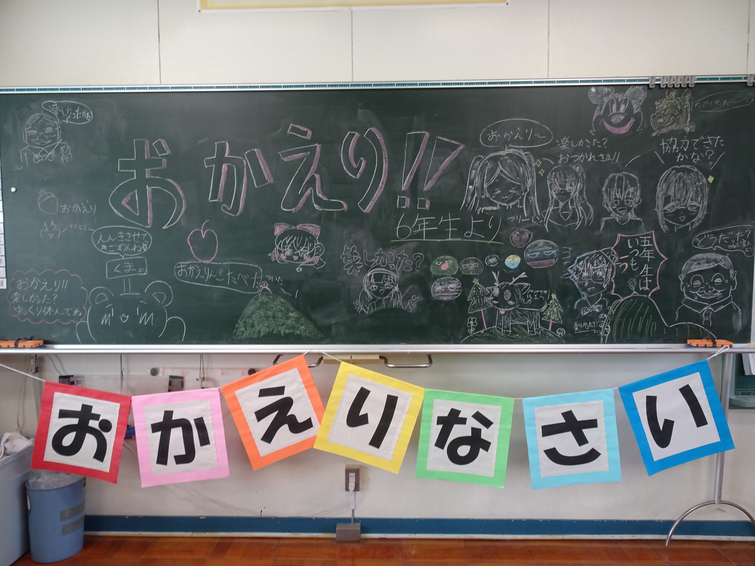あたたかな雰囲気での出発と帰校 2024/12/09 12/5(木)、6(金)に5年生が観音山に行ってきました。 5日の朝は、登校した子供たちが「いってらっしゃい!」とバスを見送ってくれ、6日の帰校時は先生方たちが出迎えてくれました。 5年生の教室もきれいに飾りつけされていて、毎日が温かさでいっぱいです。