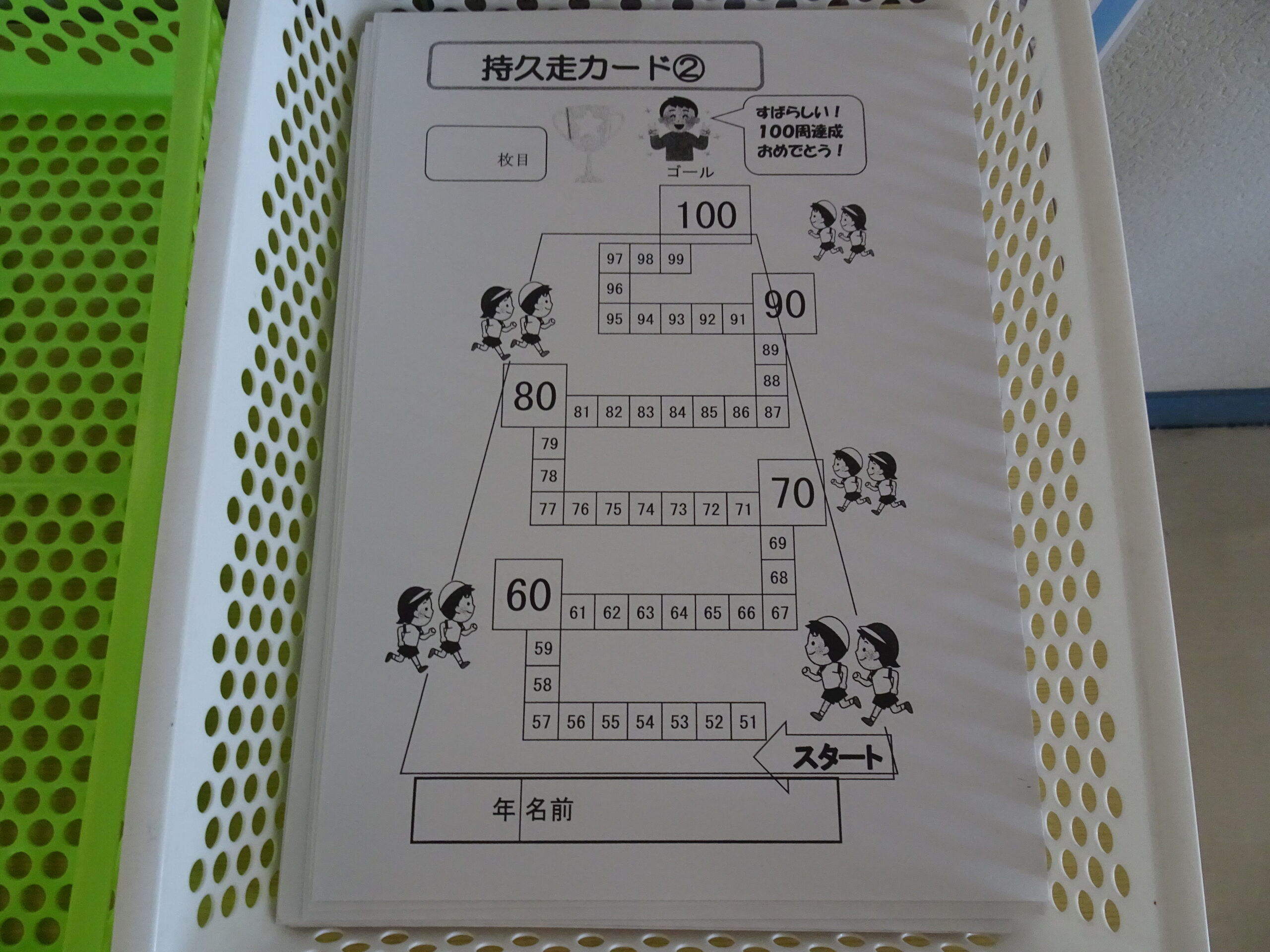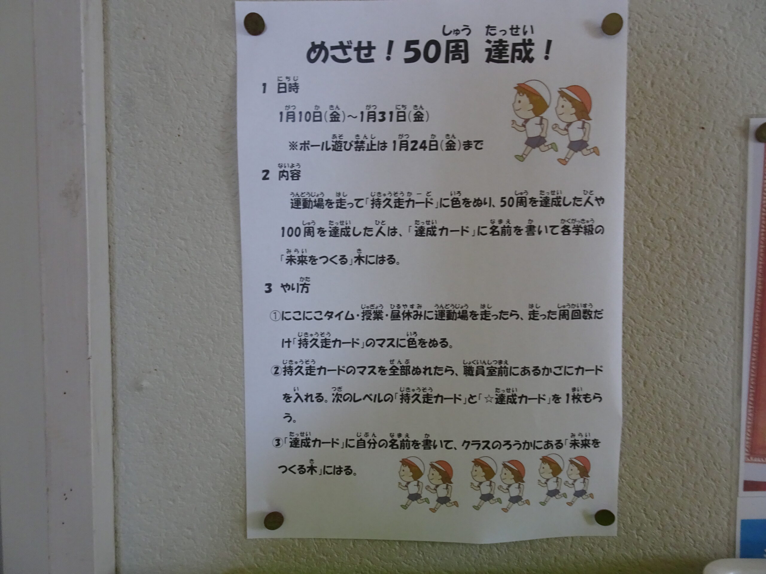 みんなで持久走に挑戦しよう 2025/01/09 明日から、にこにこタイムや昼休みを使って、持久走に取り組みます。 学年ごと走るペースや時間は違いますが、自分の目標に挑戦できると良いですね。 目指せ、50周!!