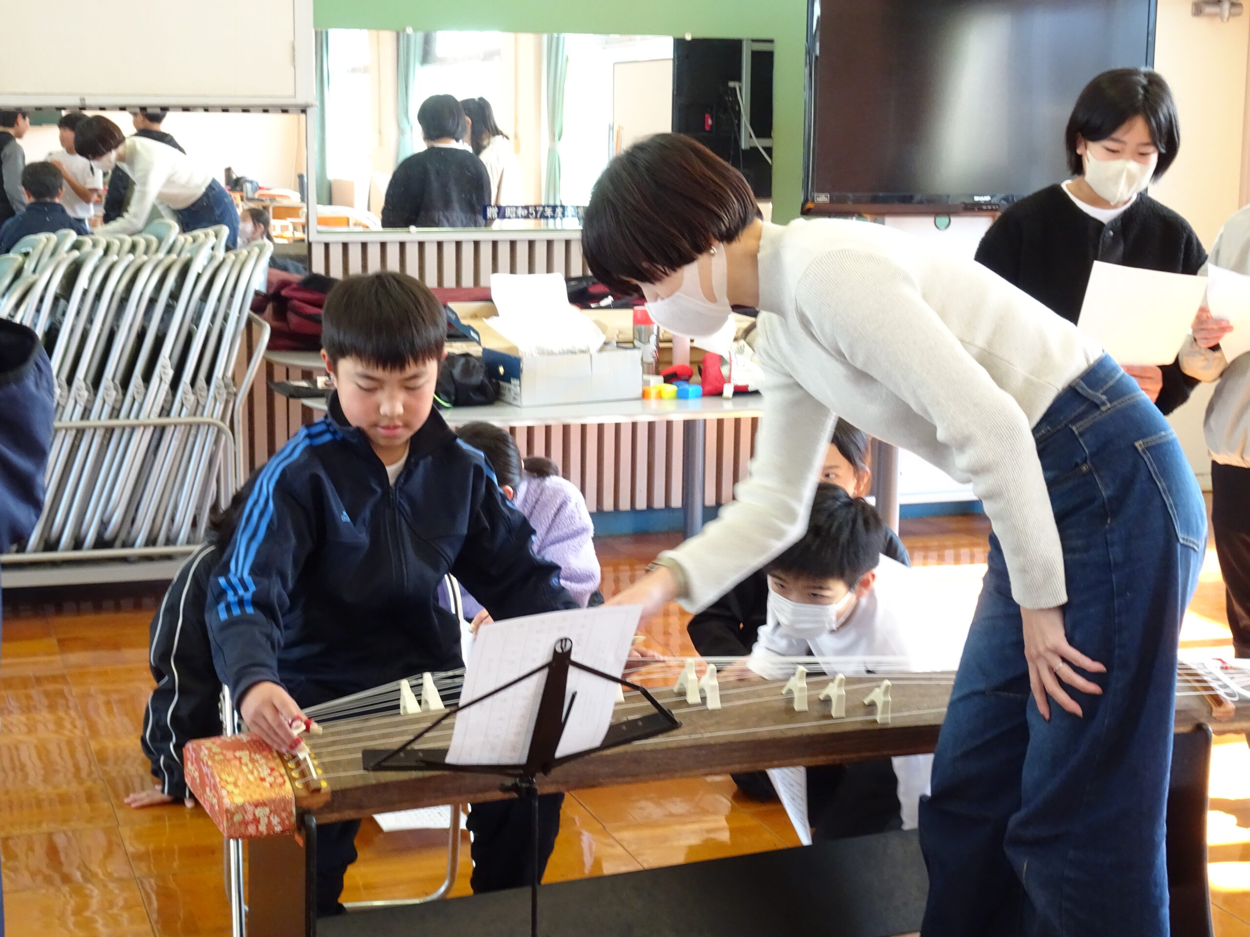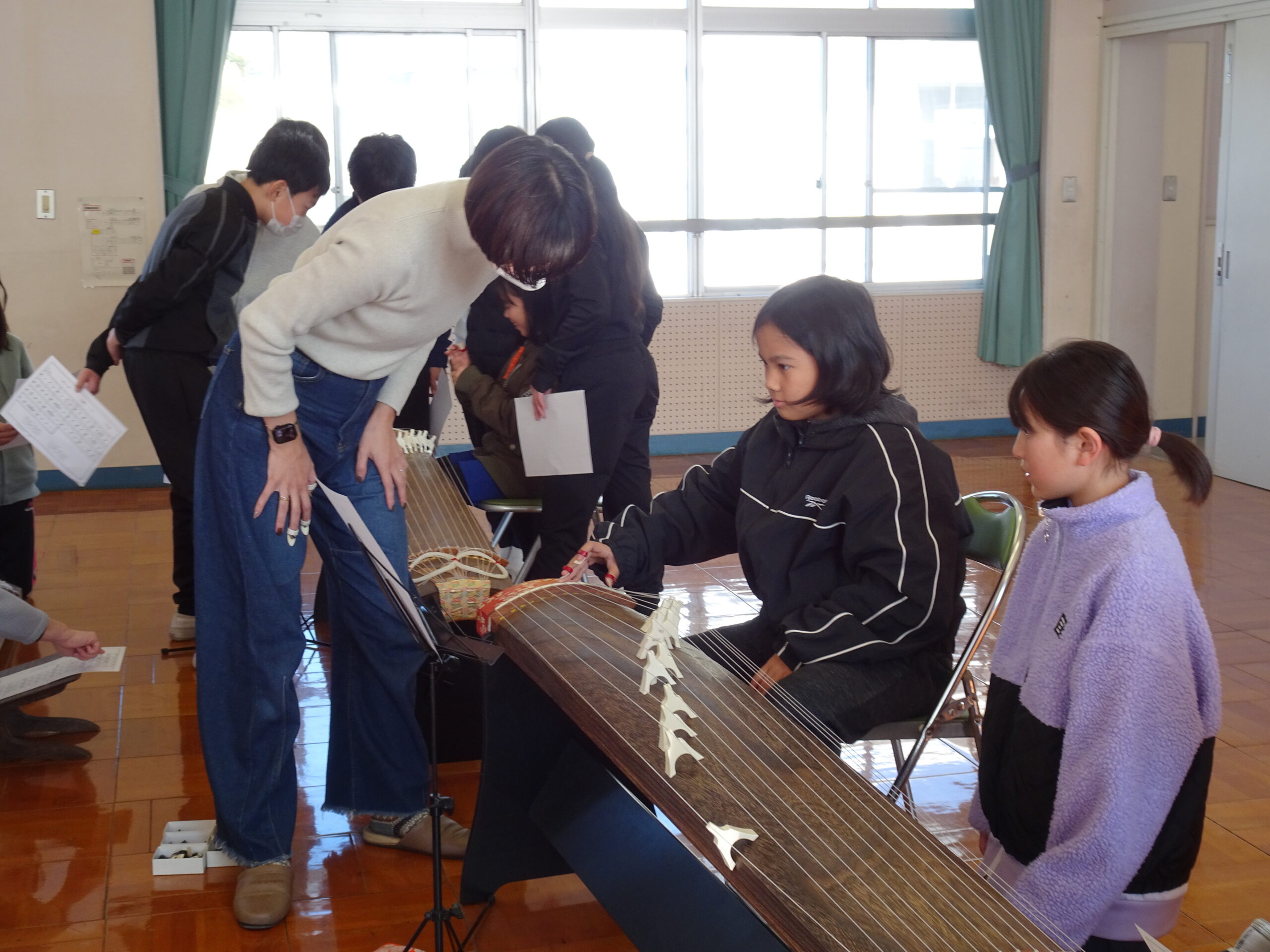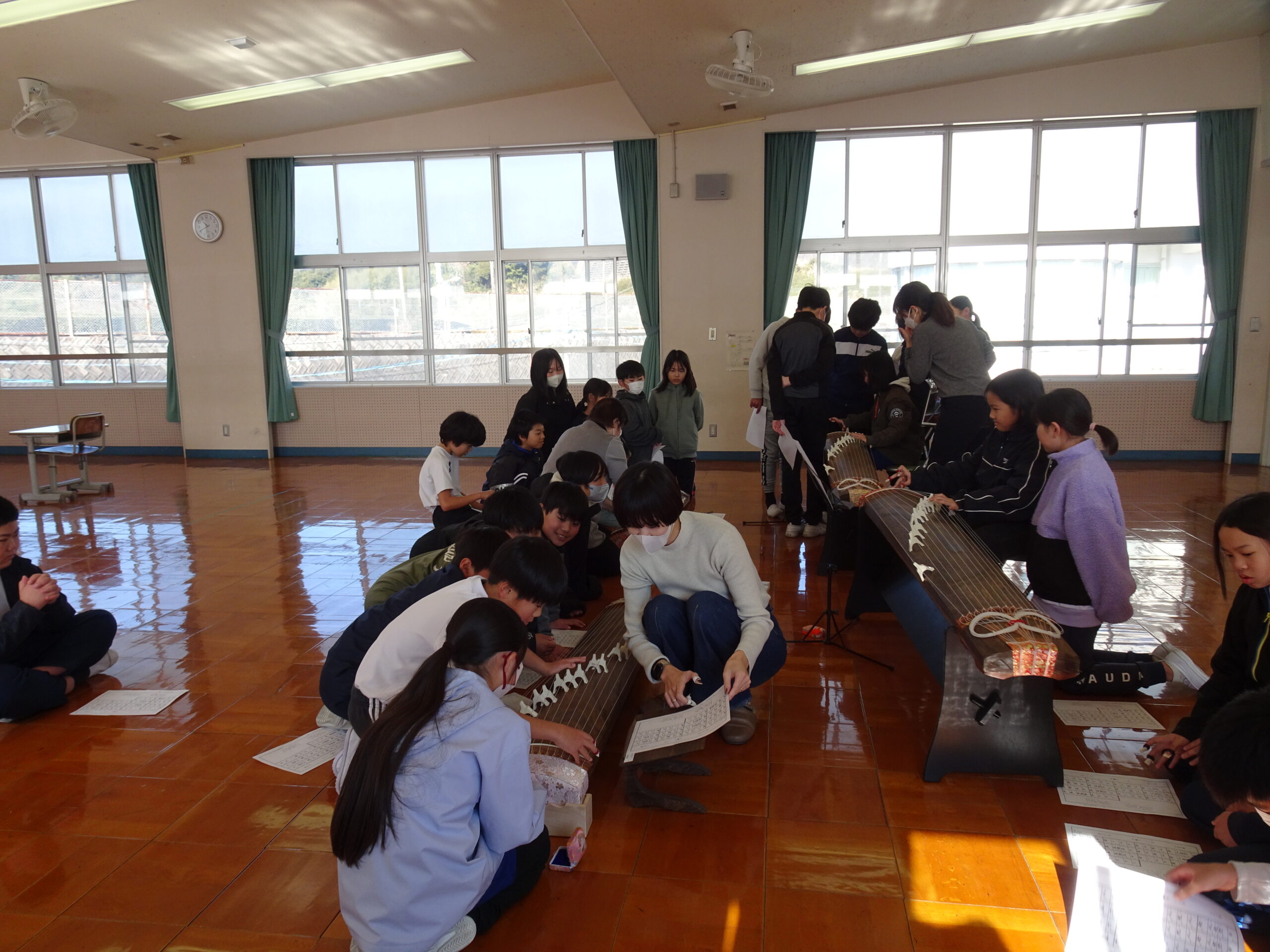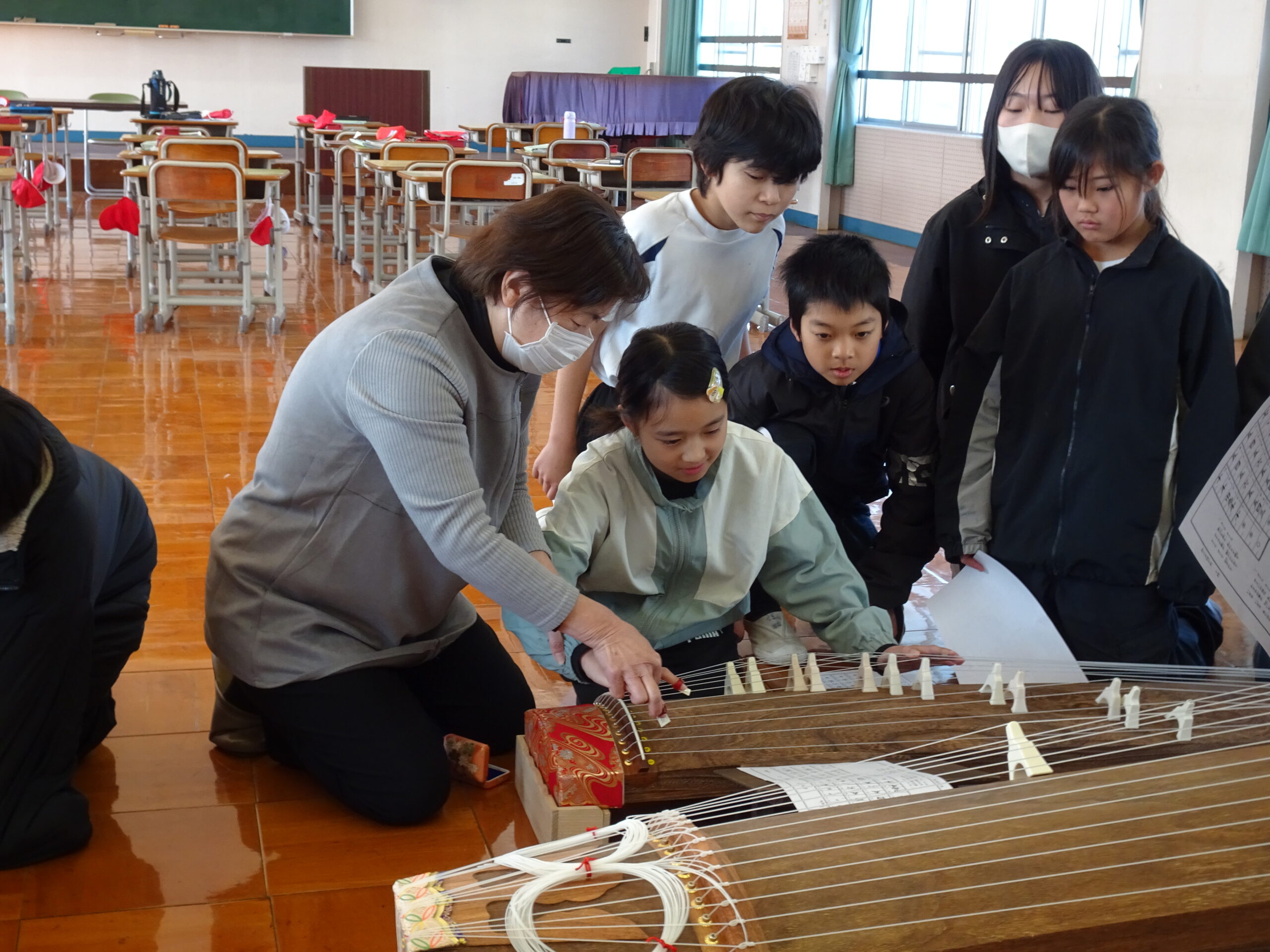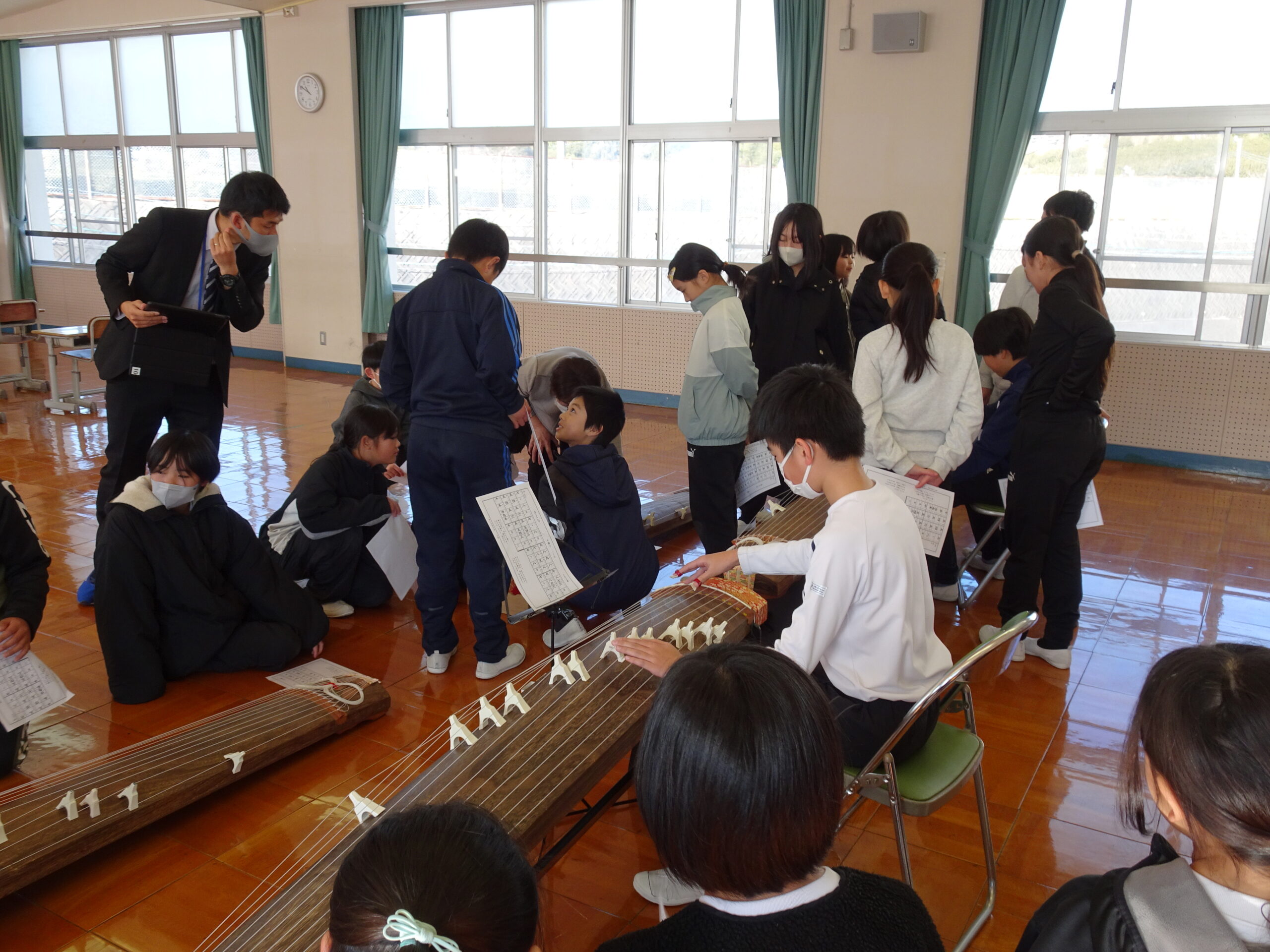 【5年生】日本の音楽にふれよう 2025/01/22 5年生が音楽の授業で、琴の演奏に挑戦しました。初めて触れる楽器に戸惑っている子もいましたが、講師の先生方にやさしくおしえてもらい、「さくら」を演奏していました。 力加減が難しいようで、大きな音を出すのに苦労する子もいましたが、日本の伝統的な楽器にふれる貴重な機会となりましたね。 教えてくださった講師の先生、ありがとうございました。 琴は、浜岡中学校が貸してくれました。ありがとうございました。