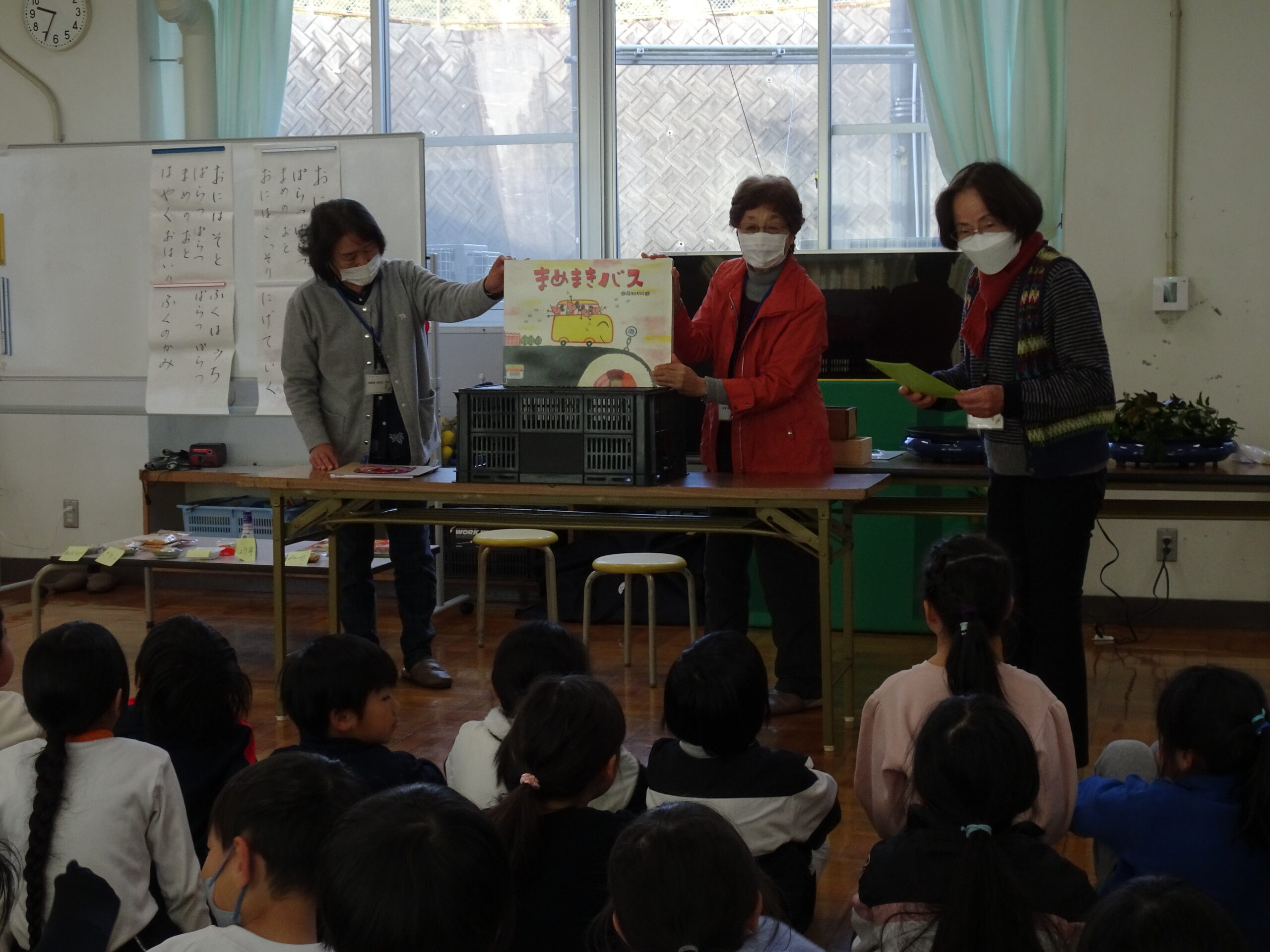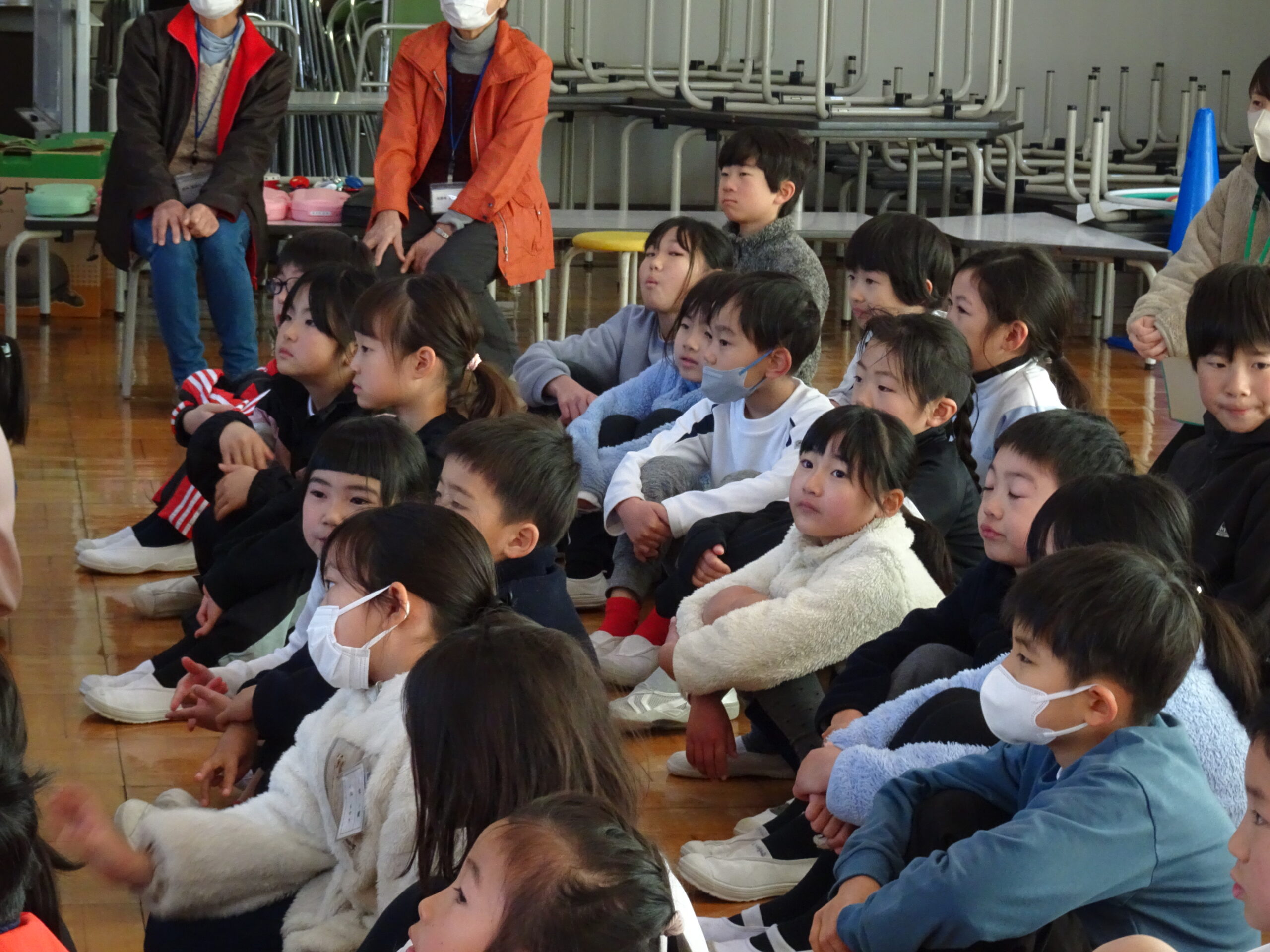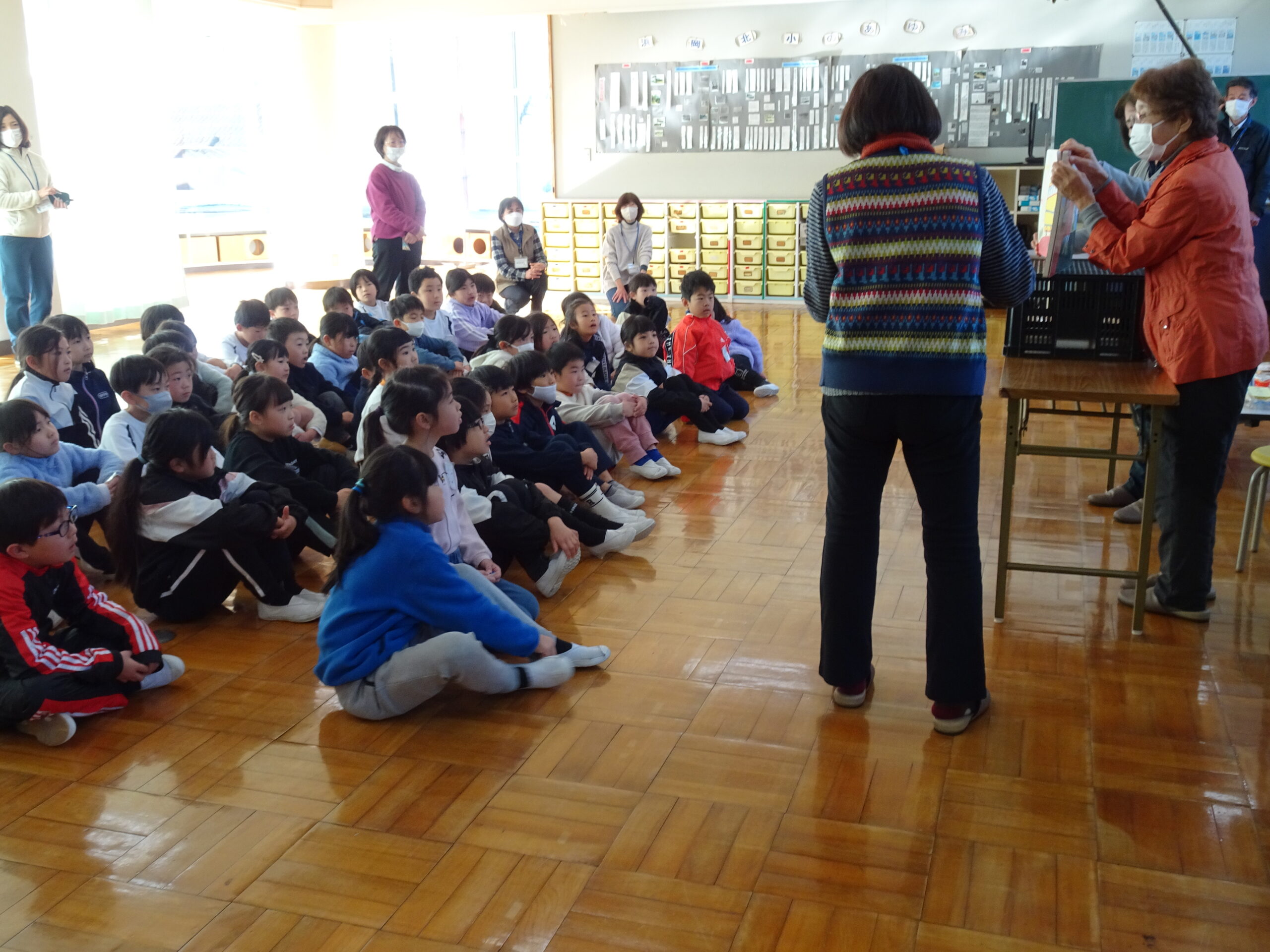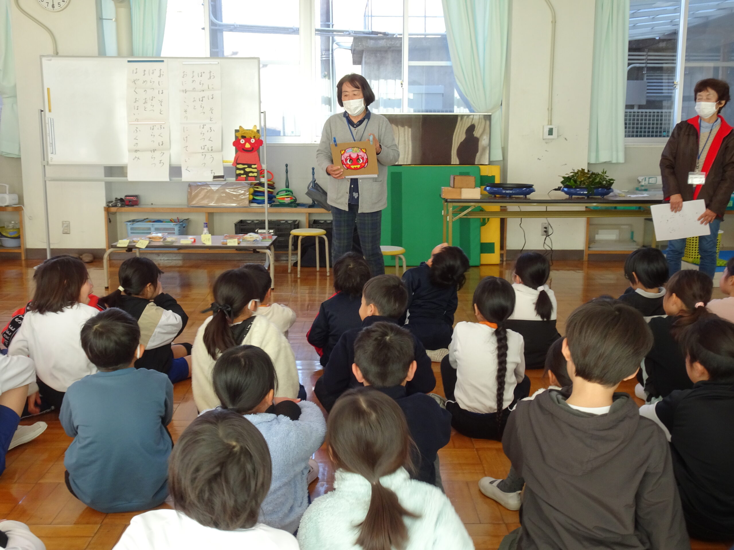 【1・2年生】節分集会がありました 2025/01/29 2時間目に節分集会がおこなわれました。1年生と2年生は朝から楽しみにしていて、ワクワクしながら登校してきました。 読み聞かせボランティアおとぎの国の皆さんが中心となって、節分という年中行事の意味や「豆にはすごいパワーがあるんだよ」ということを教えてくれました。 クイズや読み聞かせもあって、楽しい時間となりました。 ありがとうございました。