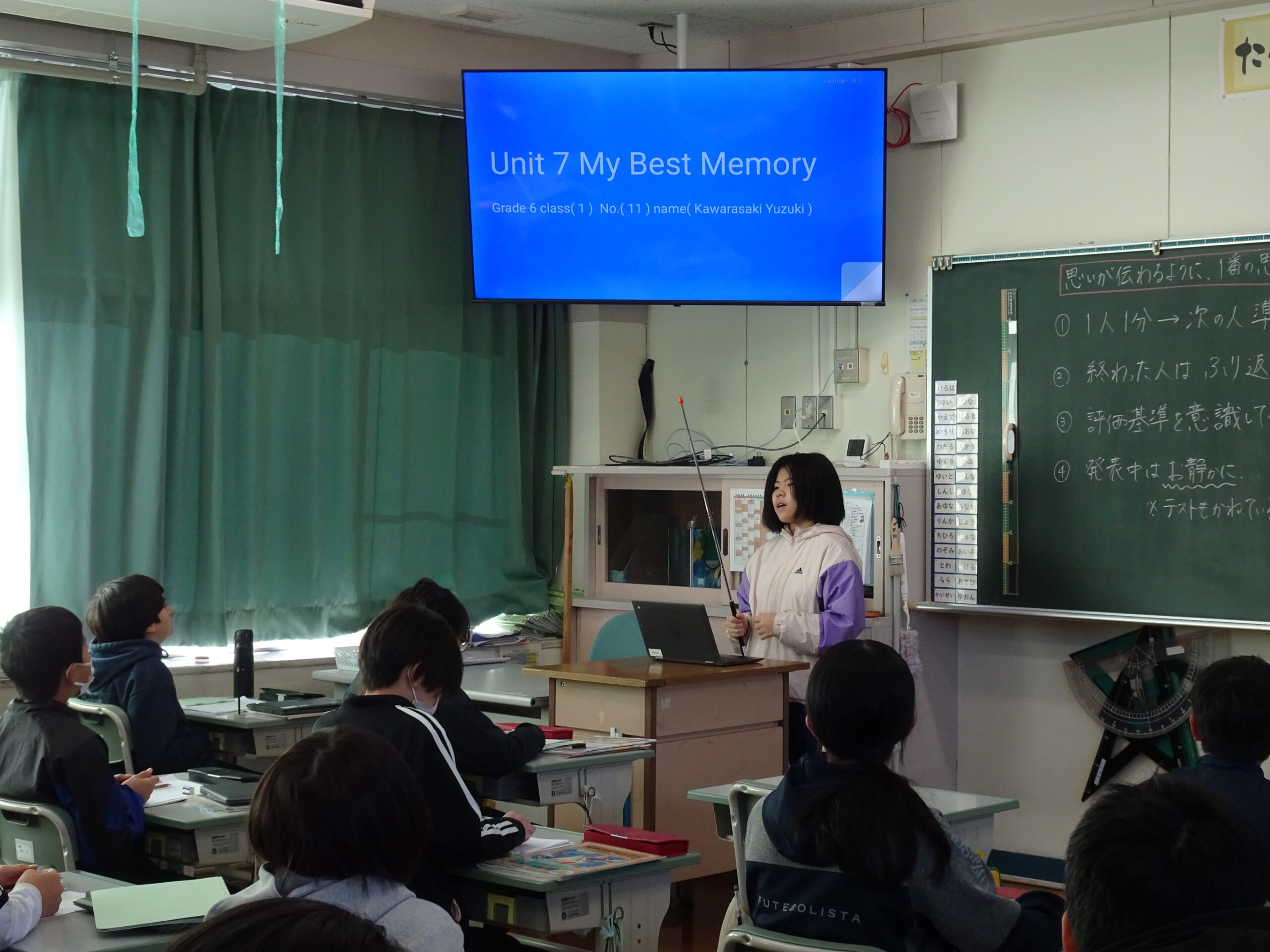 【6年生】一番の思い出について発表しよう 2025/02/04 6年生は外国語の時間に、英語を使って自分の一番の思い出についてスピーチしました。 1分間ではありましたが、みんなの前で話すのは緊張したと言っていました。でも、実際の発表は堂々としたもので、6年生でこんなに話せるの?と感心させられました。 中学校に行くと、英語を使ってディベートをする授業もあるそうです。 「思いが伝わるように」をテーマにおこなった、このスピーチはすばらしい経験になりますね。