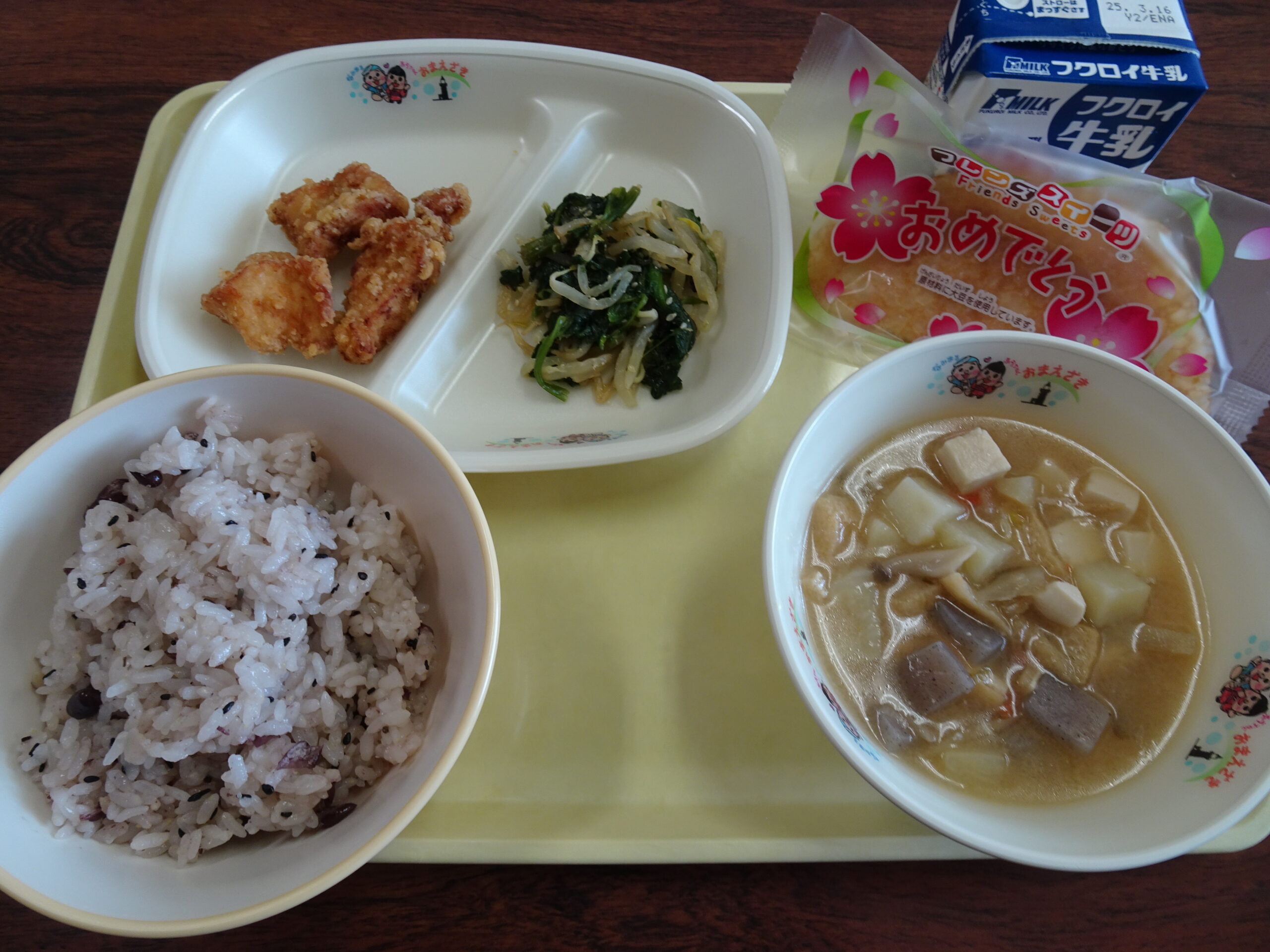 卒業お祝い献立 2025/03/10 今日の給食は卒業をお祝いするメニューでした。 赤飯、牛乳、鳥のから揚げ、みそけんちん汁、ほうれん草のごま和え、お祝いデザートでした。 給食センターのみなさん、ありがとうございました。