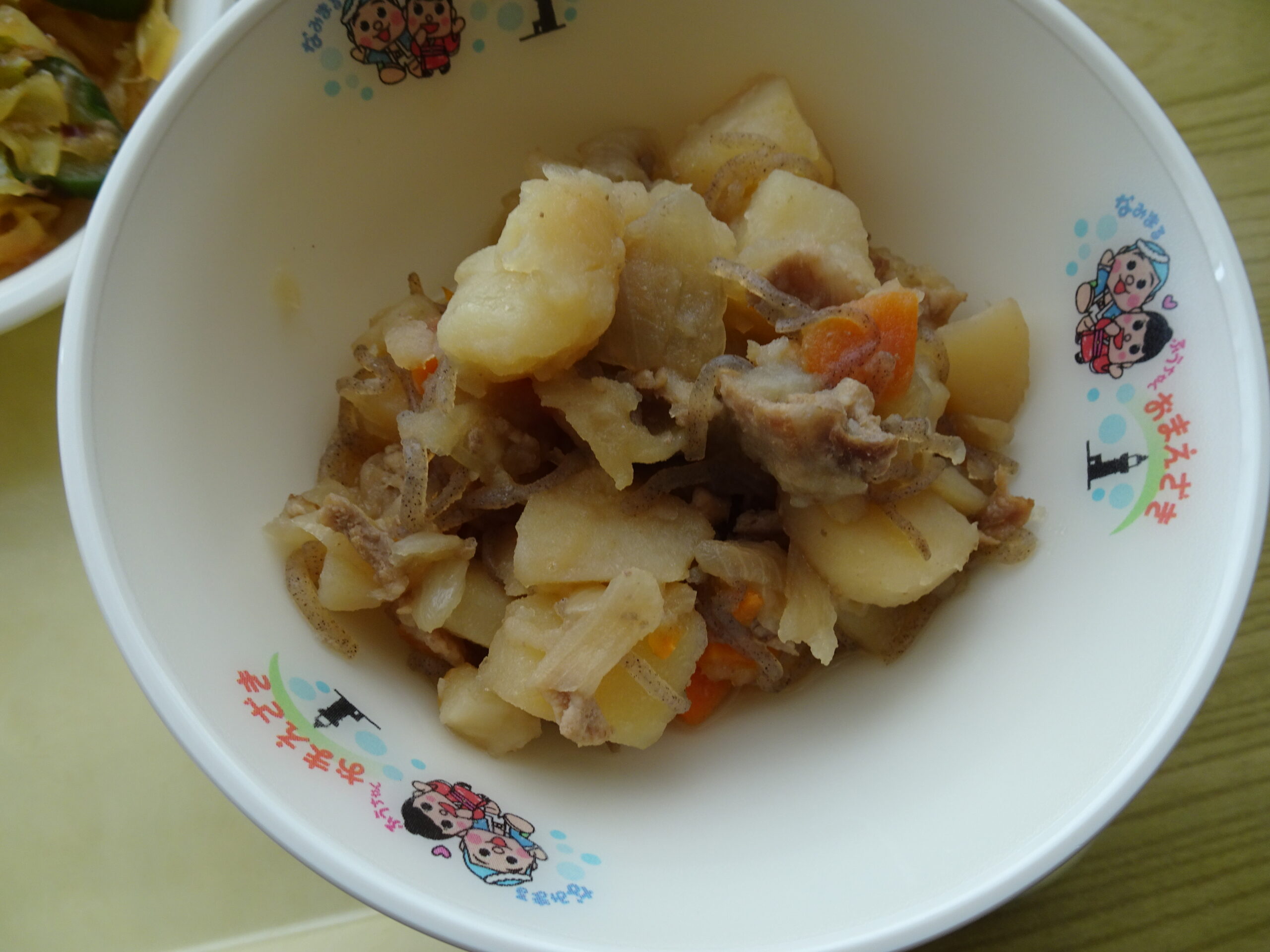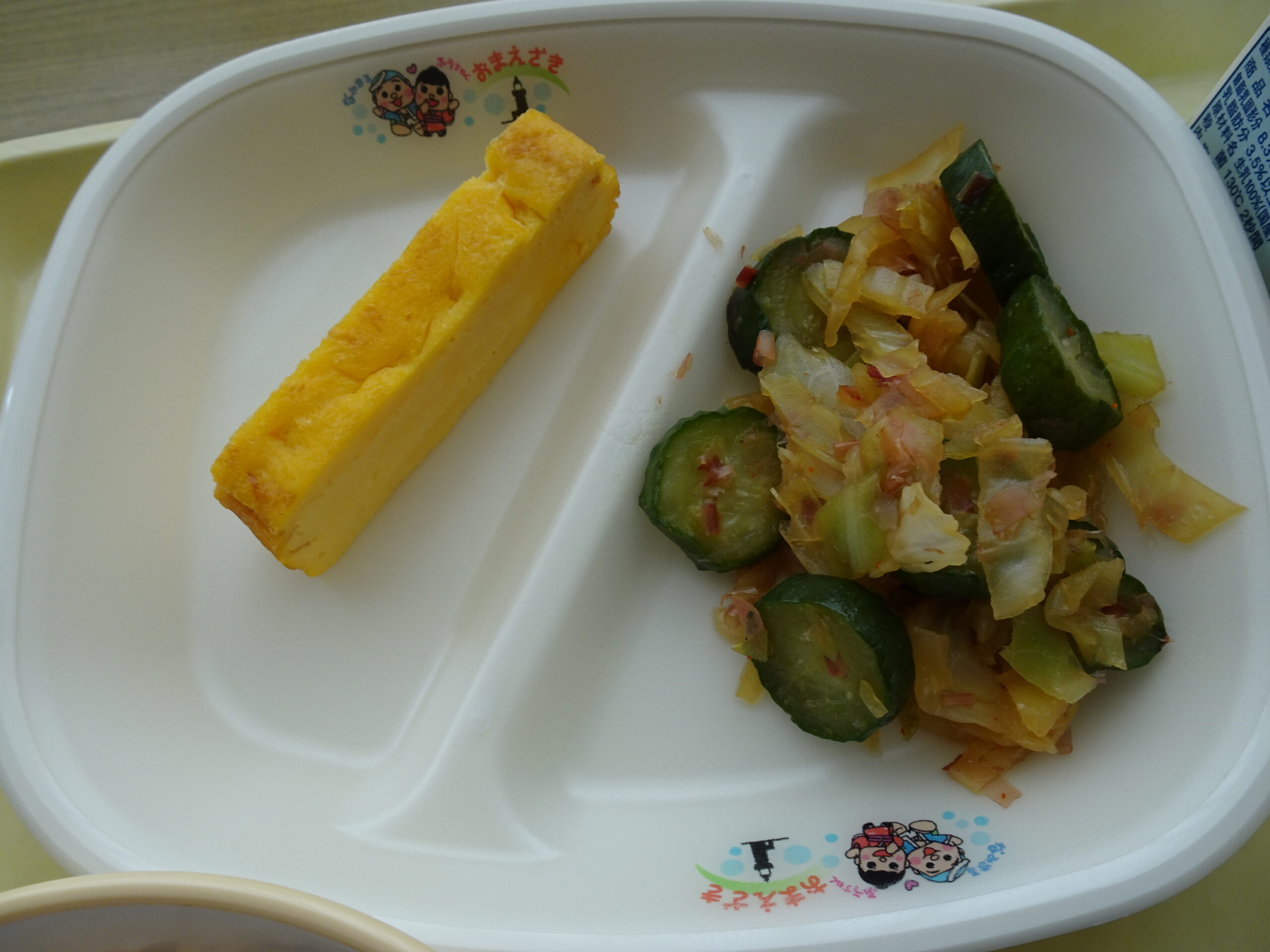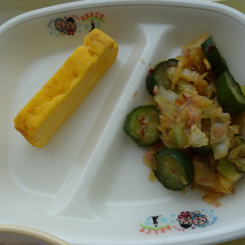 今日のメニューは、わかめごはん、牛乳、厚焼き玉子、肉じゃが、きゅうりとキャベツのひたひたでした。