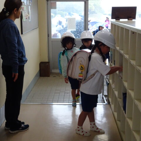 昇降口では自分の傘をしっかりまとめて、自分の傘立てに入れられていました。雨の日の靴箱も、しっかりかかとピンができていましたね。