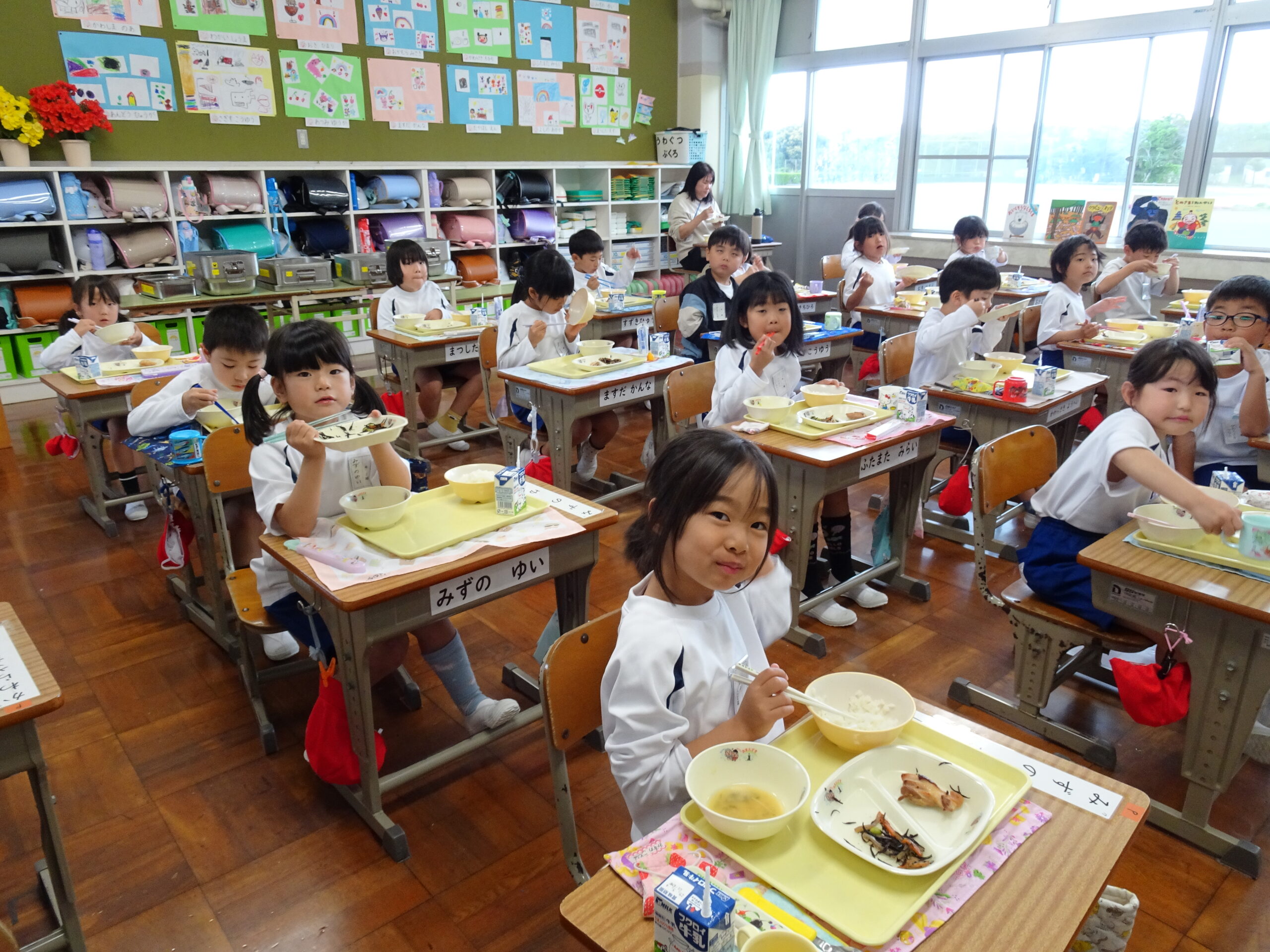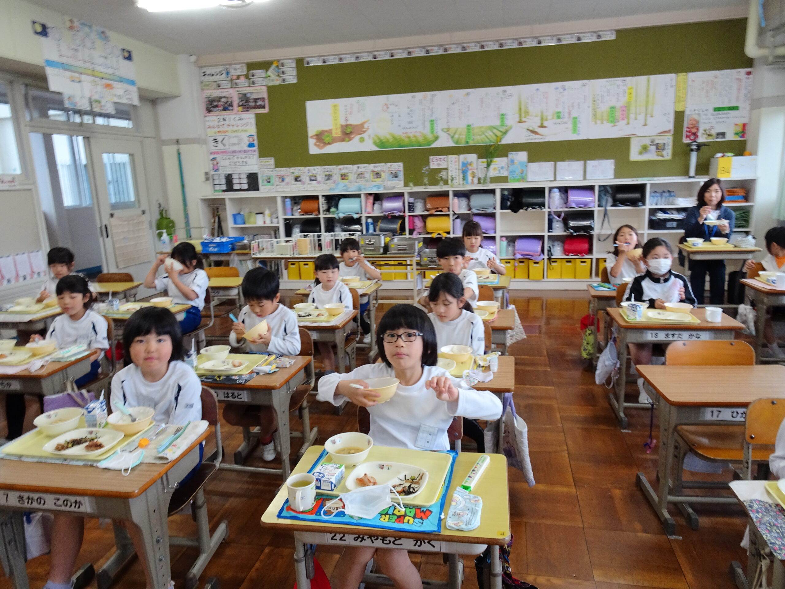 1年生は、給食の準備にも慣れてきて、みんなで協力して取り組んでいました。