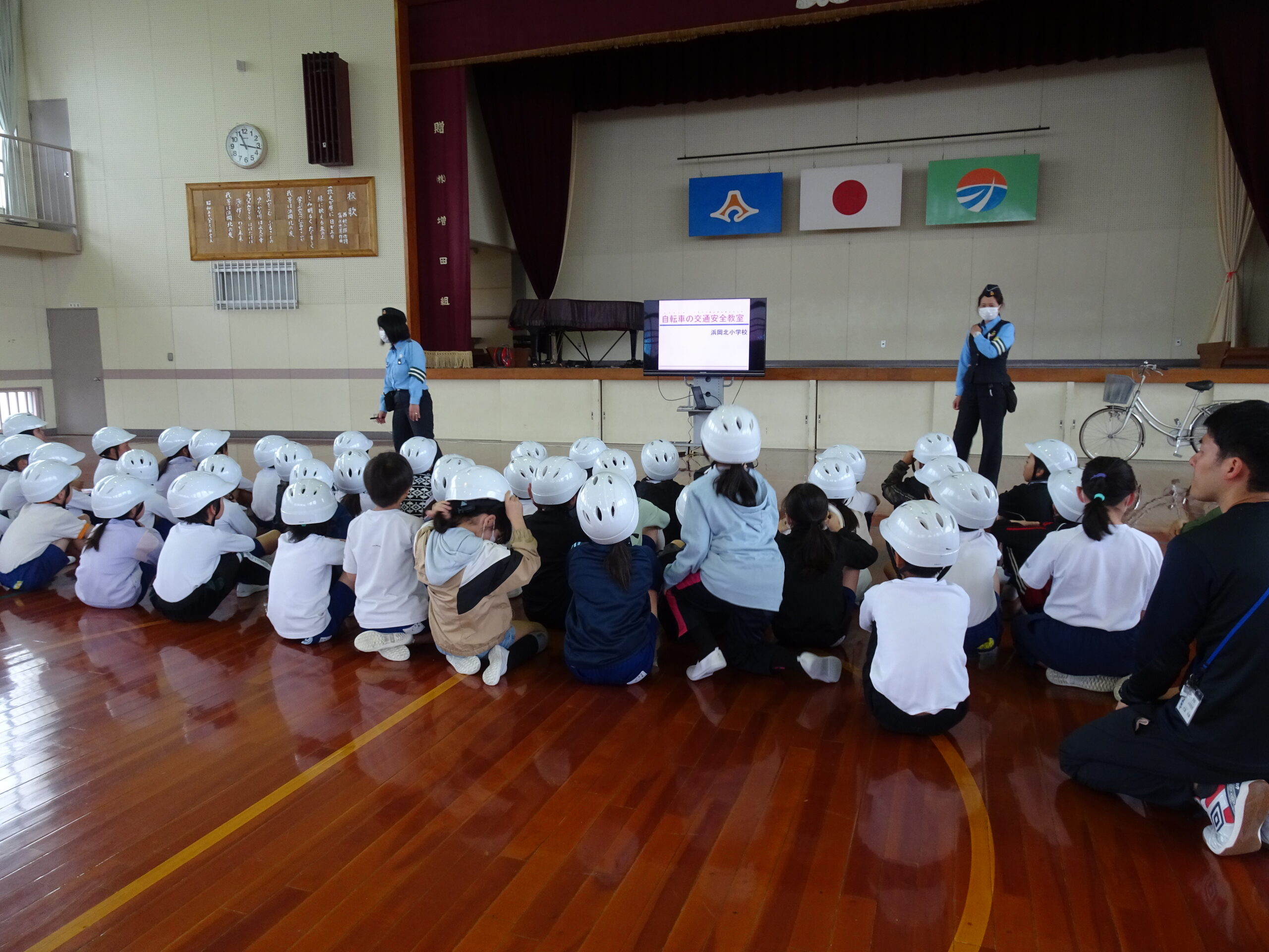 今日は、交通安全指導員さんが来てくれて、交通ルールやヘルメットのただしいつけ方を教えてくれました。