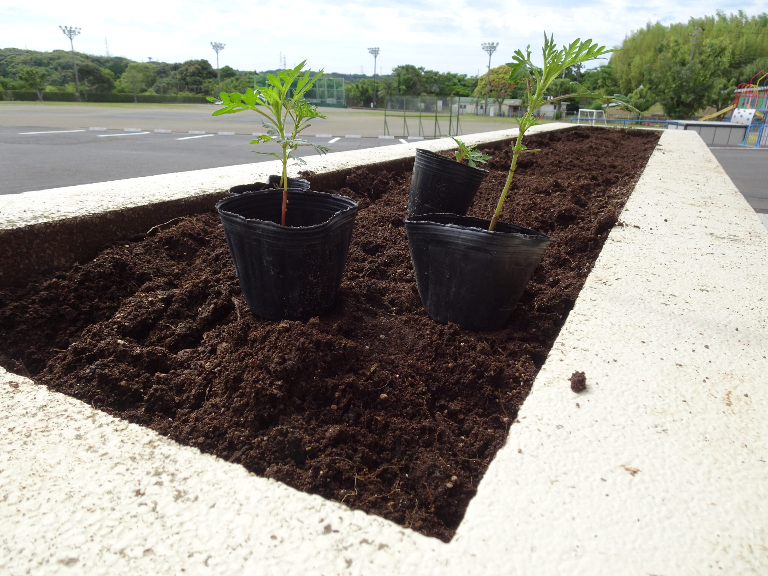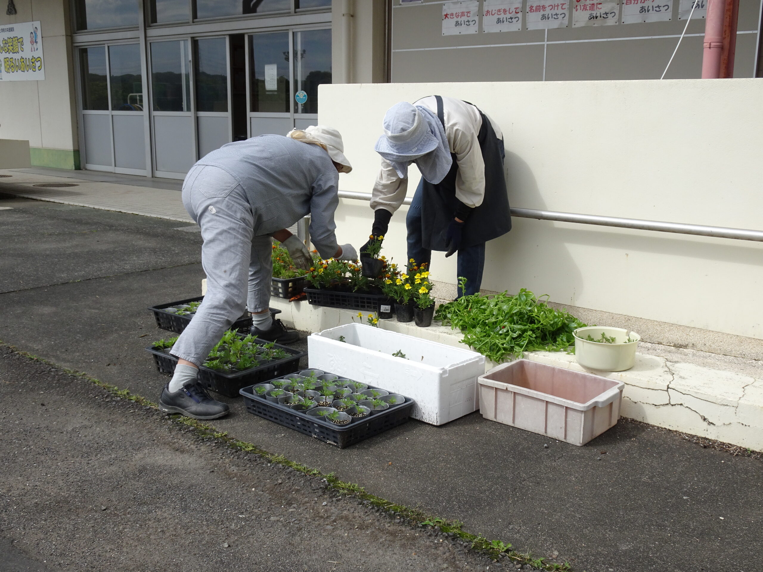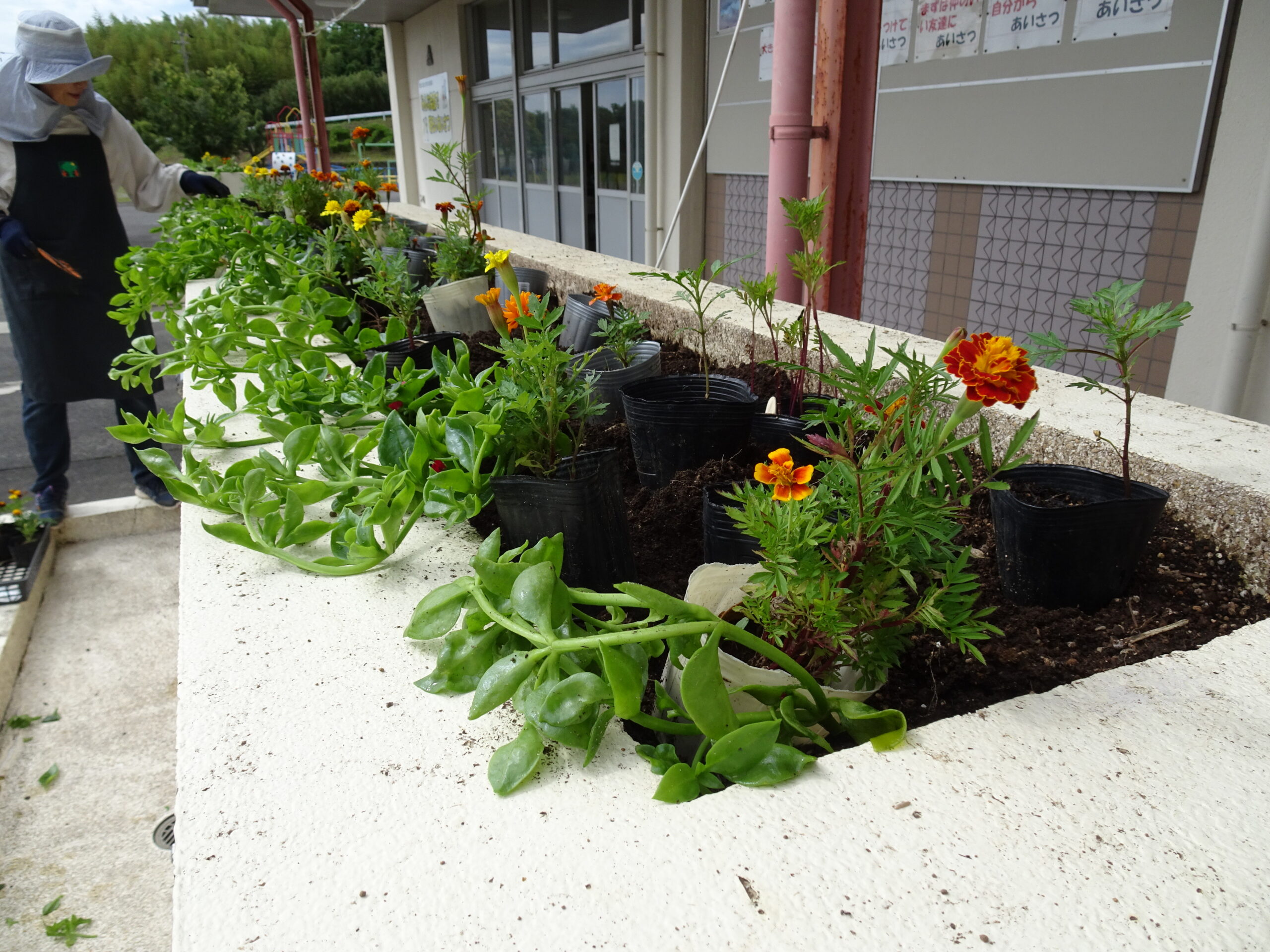 昇降口の花は、、いつもボランティアさんが植えてくれています。今回もすてきな花を探してきてくれました。